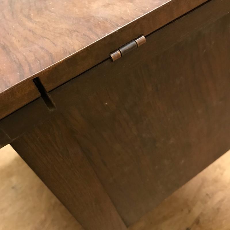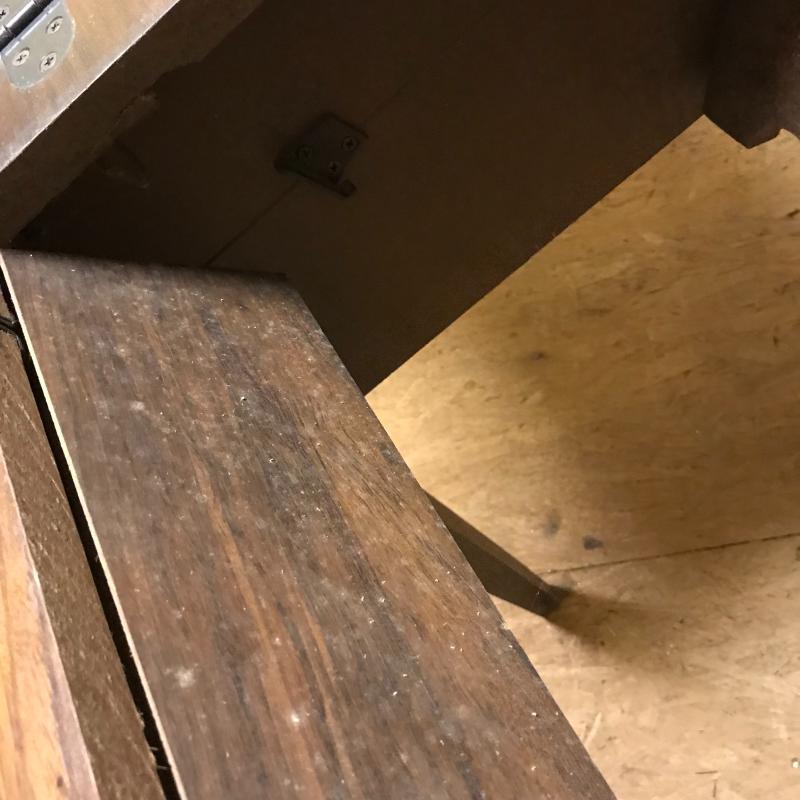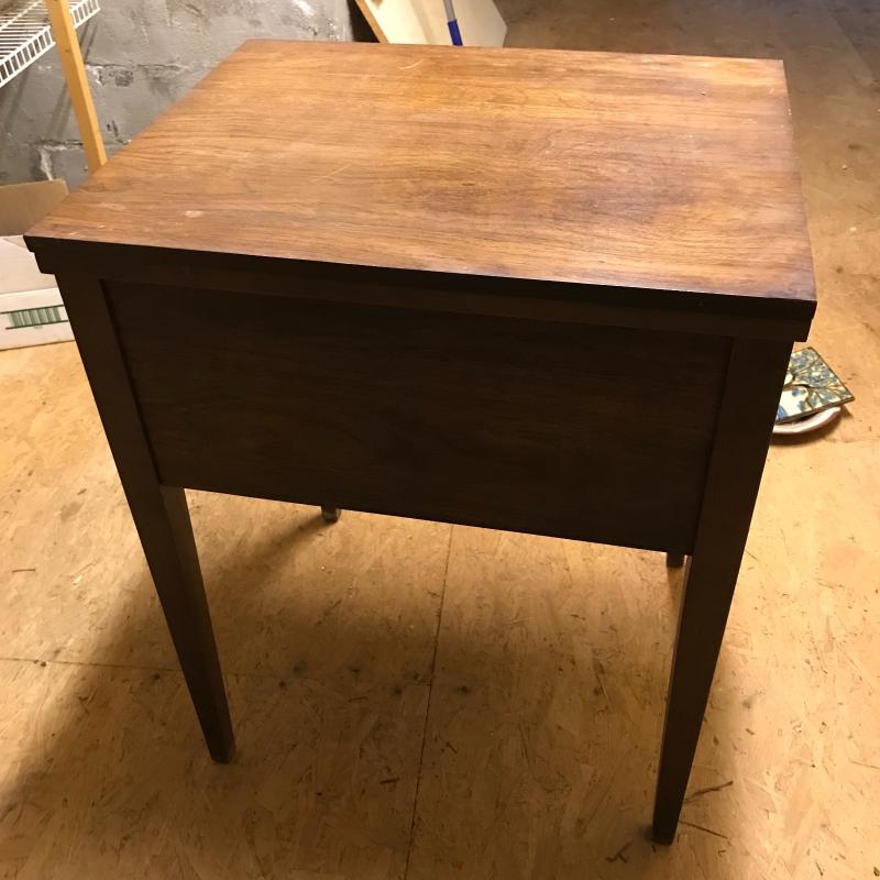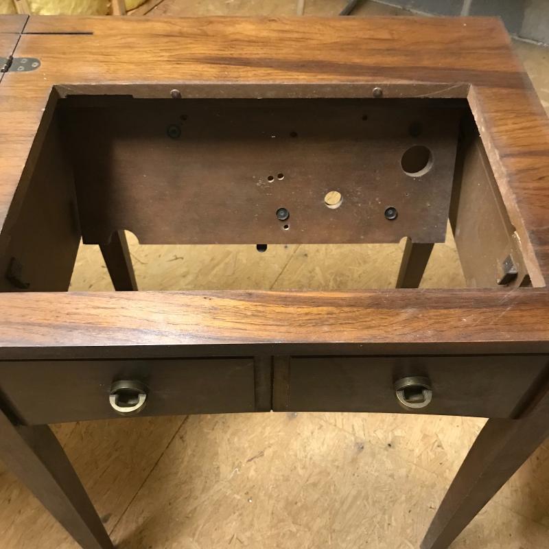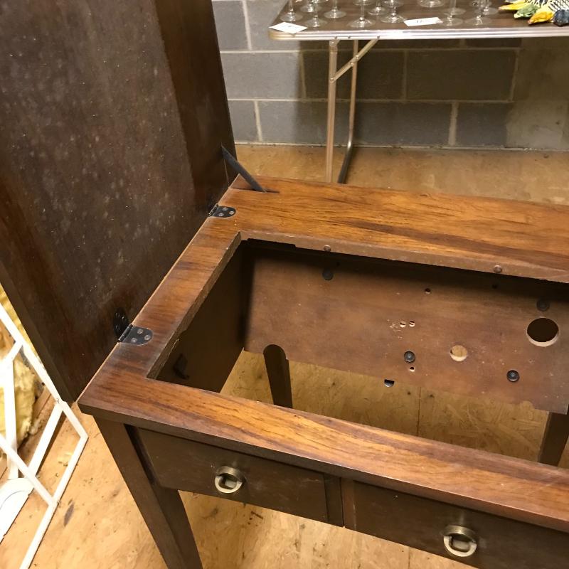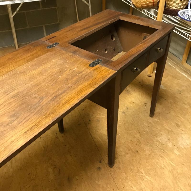 This antique sewing table is sturdy and in good condition. Does not include sewing machine. Approx. 25”l x 20.5”w x 31.5”h when top is closed. See pics.