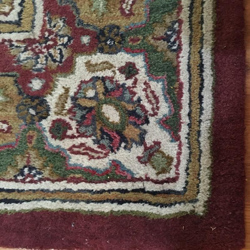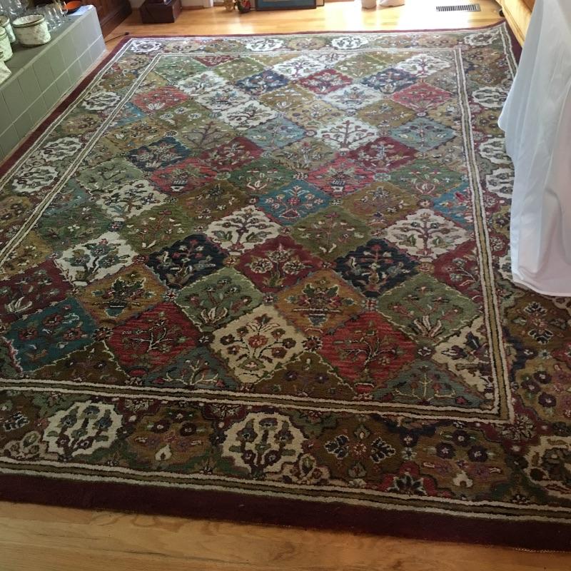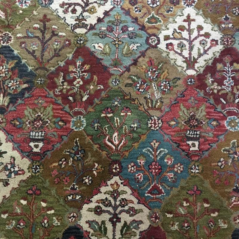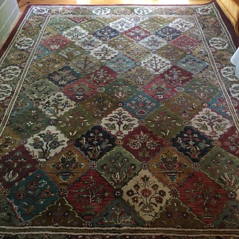 Large area rug measures 95” x 126”. A colorful diamond pattern with a border around the edge. Bring some color into your room and protect the floor with this beauty.