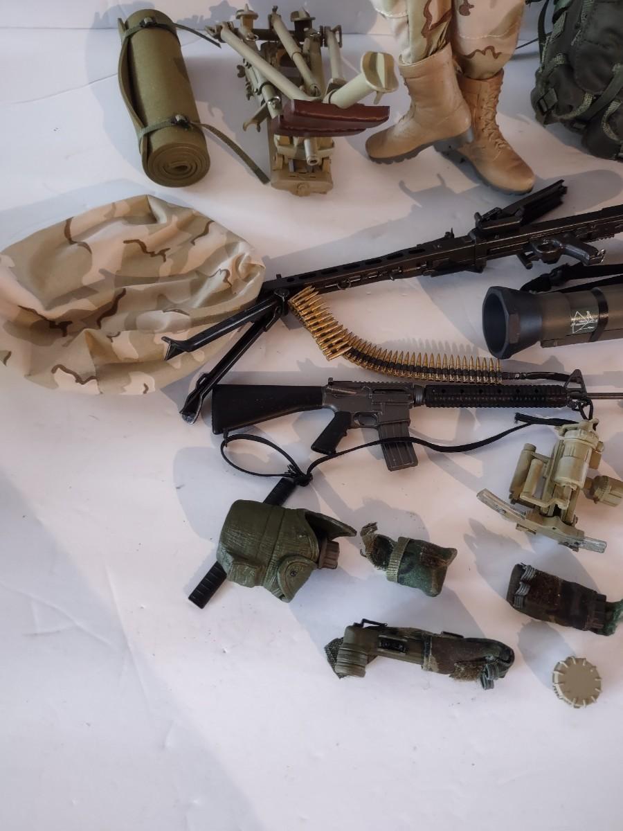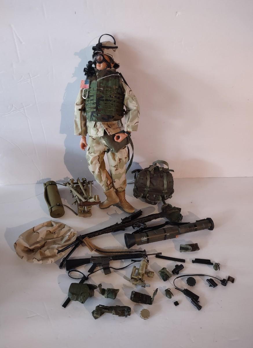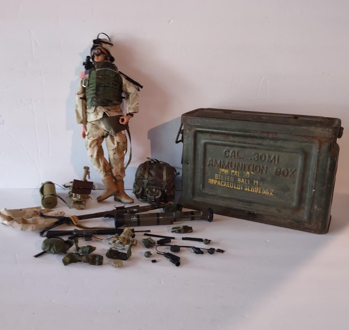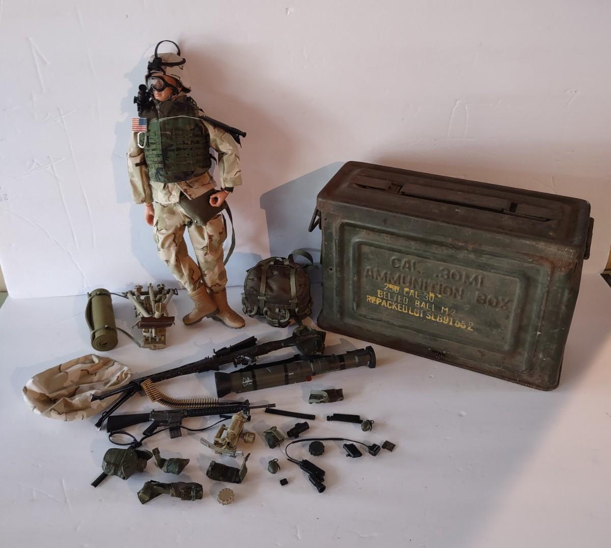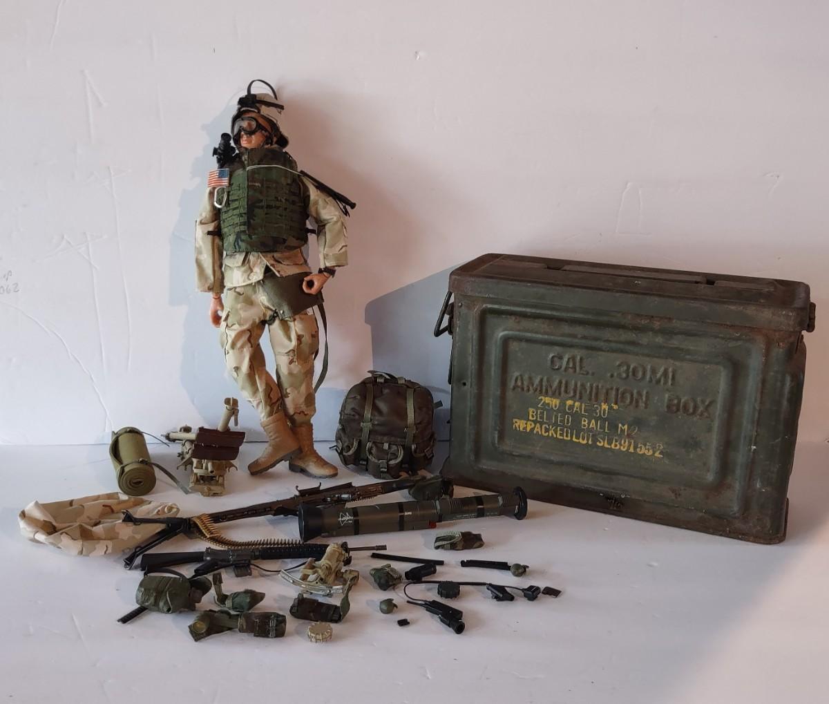 Army Man Doll With Accessories, & Ammunition Box. The pictures show condition, measurements if taken, and what is included in the lot. Due to the large amount that we photograph and the time frame, we are not always able to take measurements. All items unless noted, are pre-owned and have been used. If you purchased furniture, you must bring help. We do not allow one person to carry large furniture out on their own. Bring help, tools and a truck for the safety of our client’s homes, and your personal safety. Company policy. Thank you.
