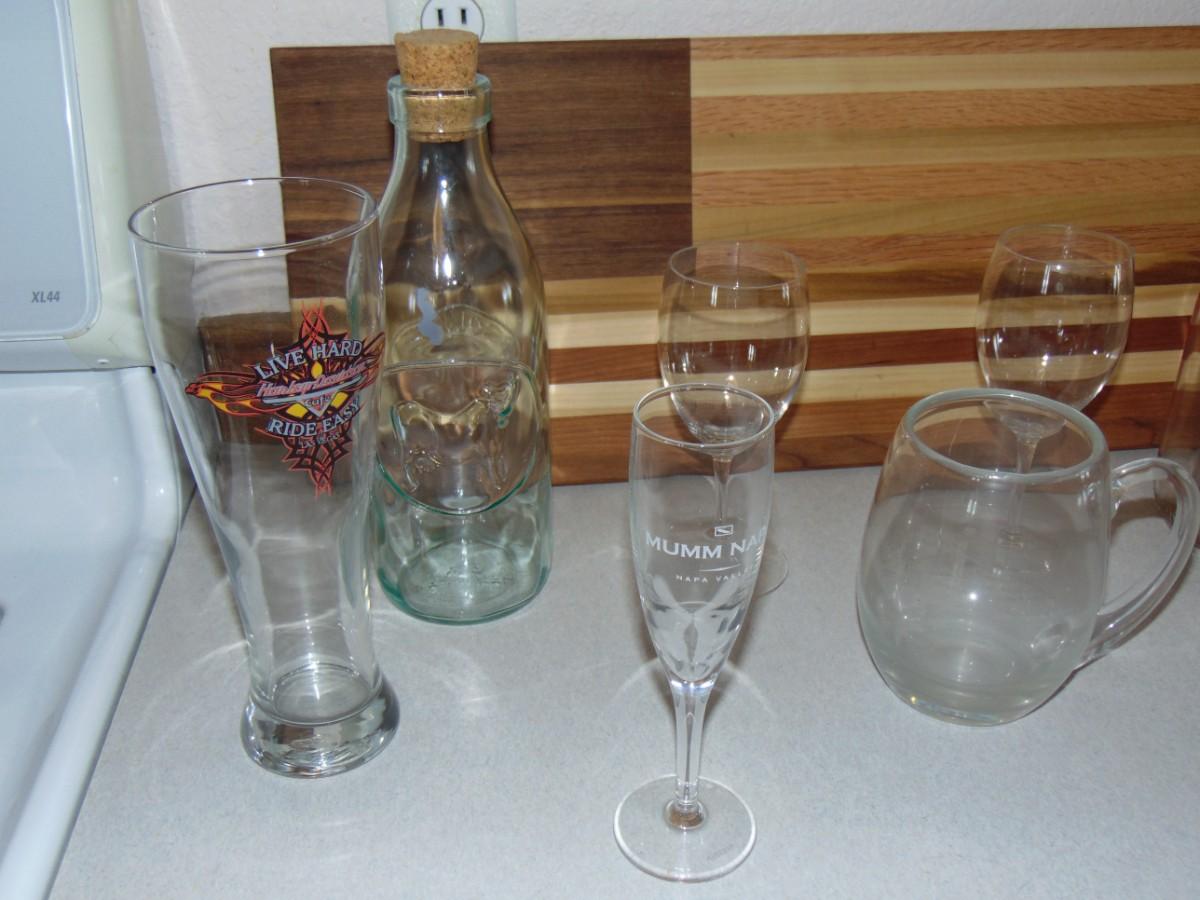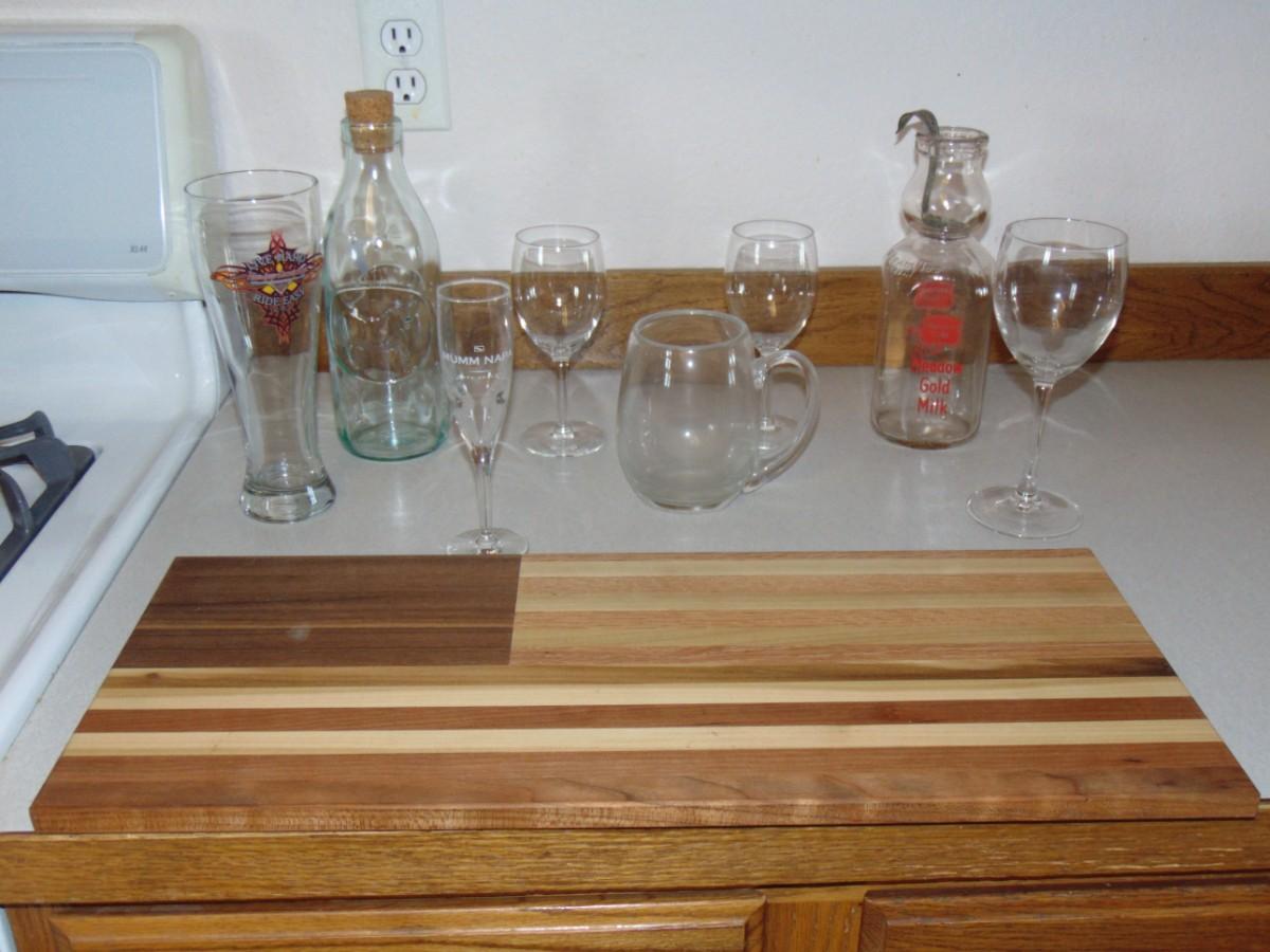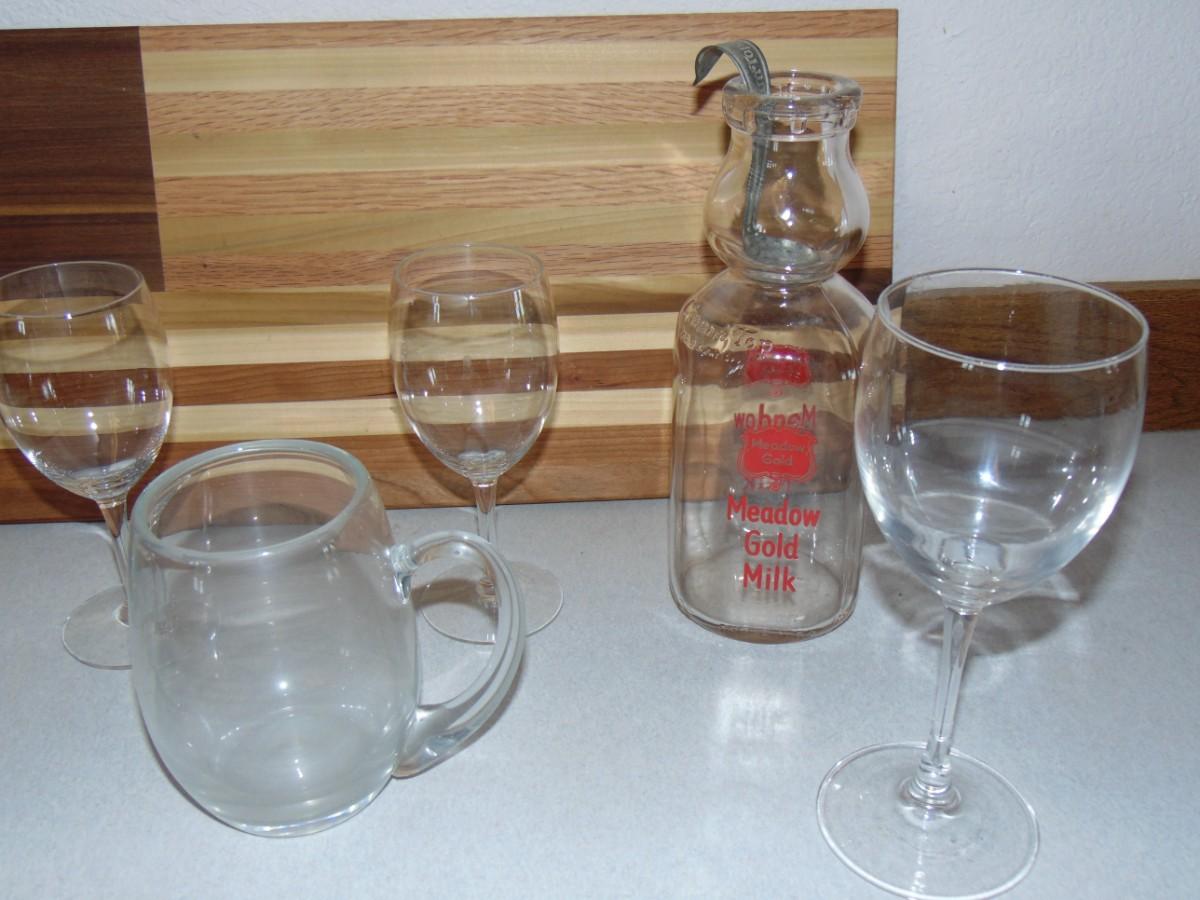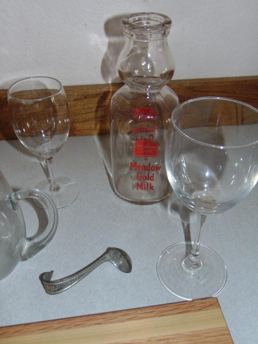 ASSORTMENT OF KITCHEN GLASSWARE, OLD GLASS MILK BOTTLE, CUPS, GLASSES, AND A NICE MUTI COLORED WOODEN CUTTING BOARD.