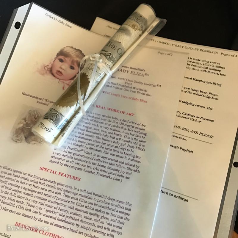 Baby Eliza is 18” doll limited edition 190 of 750. Doll is by the Great American Doll Company. Made of hardcast vinyl. Includes Original box, bonnet and COA. See photos for details. Doll ships from Columbus, North Carolina or local pick up