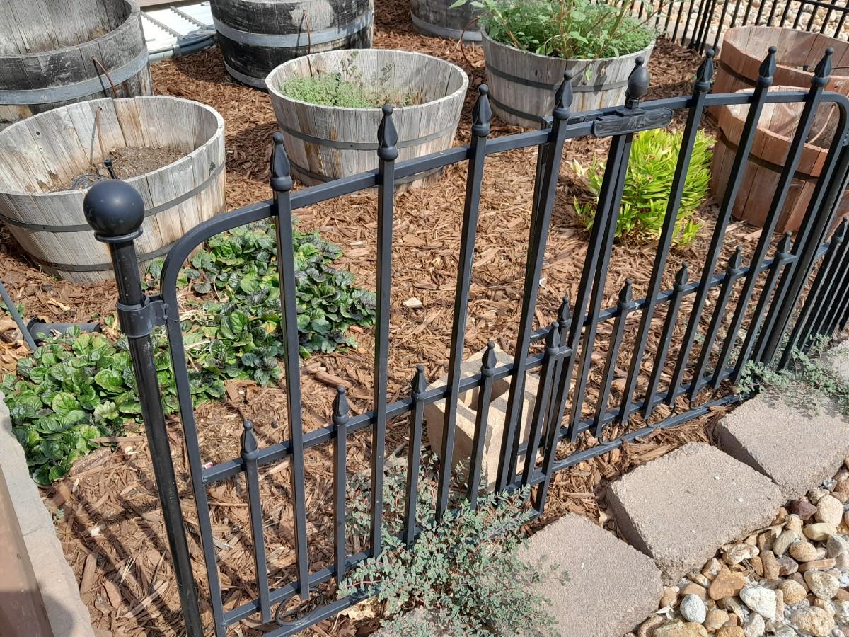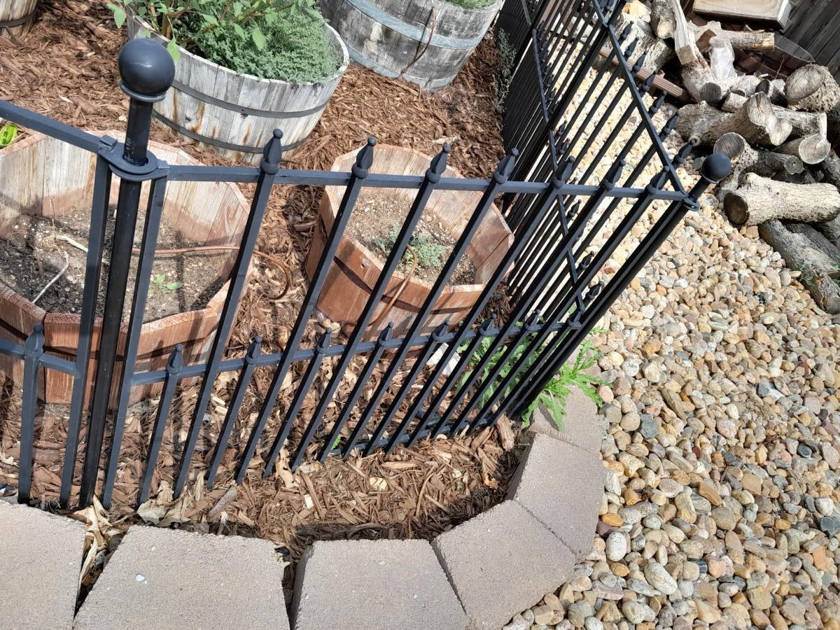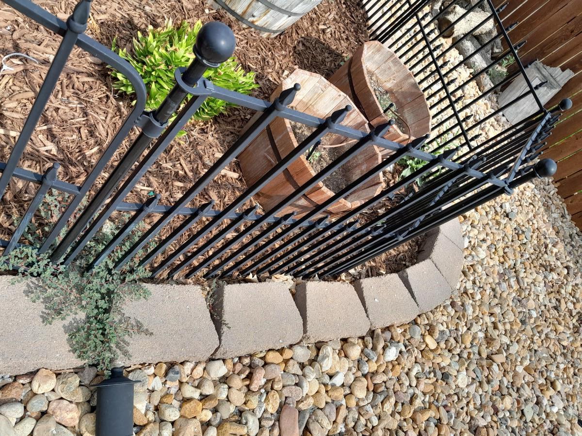 BLACK METAL GARDEN FENCING 5 SECTIONS TOTAL WITH ONE GATE EACH SECTION IS 37" X 27" THE GATE IS 42"