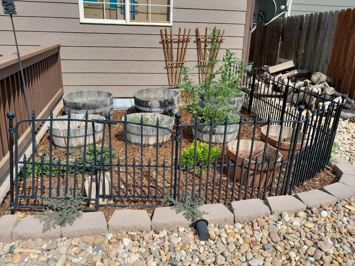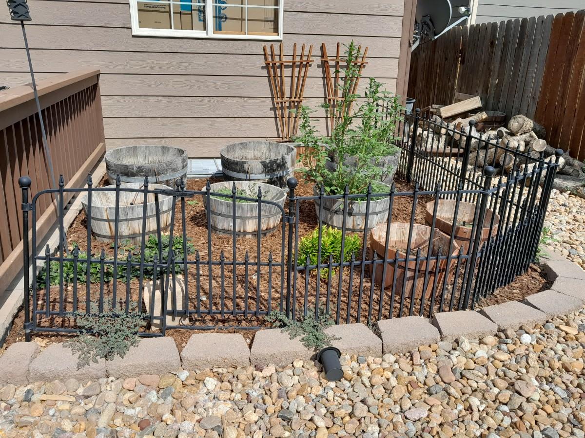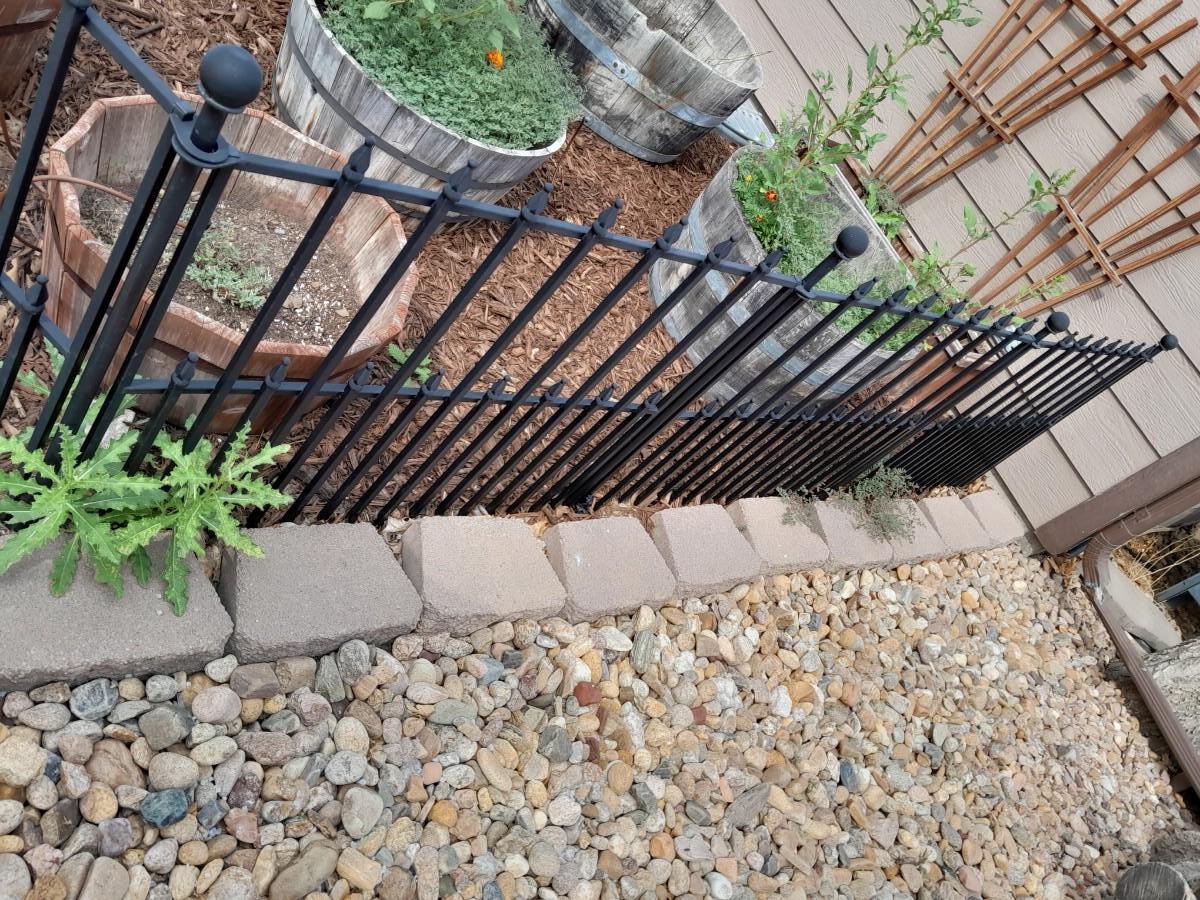 BLACK METAL GARDEN FENCING 5 SECTIONS TOTAL WITH ONE GATE EACH SECTION IS 37" X 27" THE GATE IS 42"