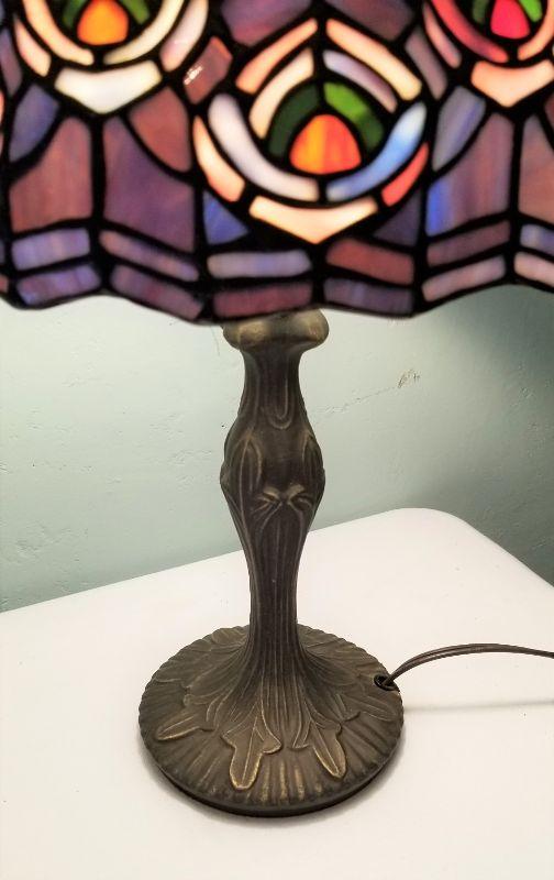 This attractive table lamp has a sort of peacock feather coloring and design - good working condition - 19" tall.