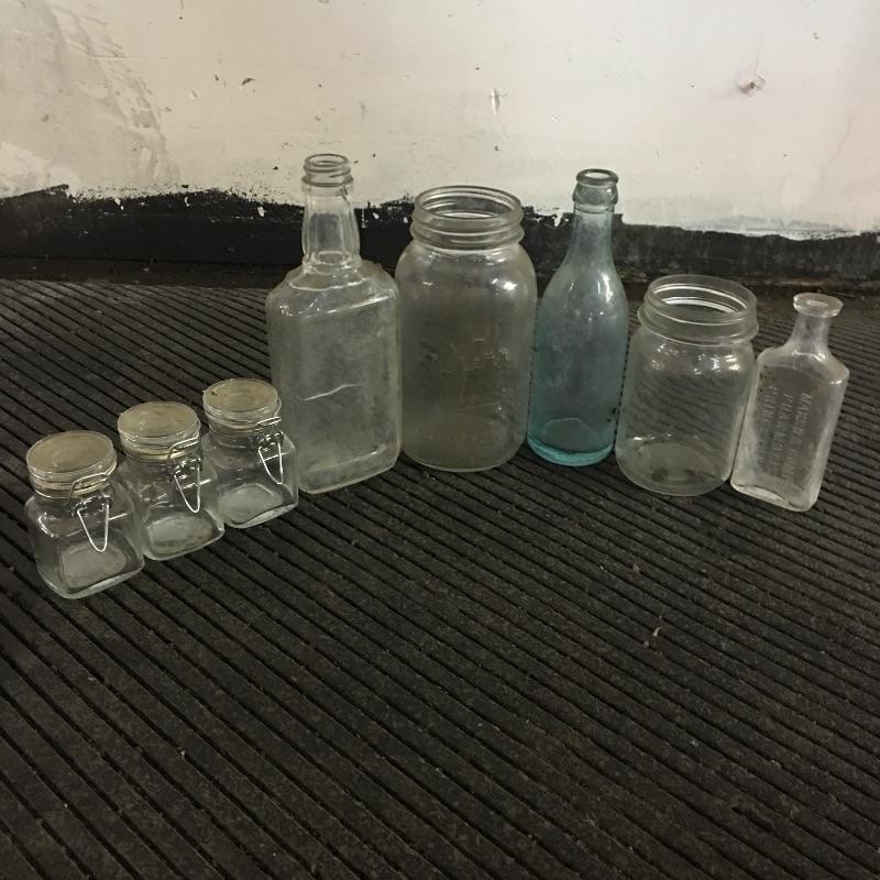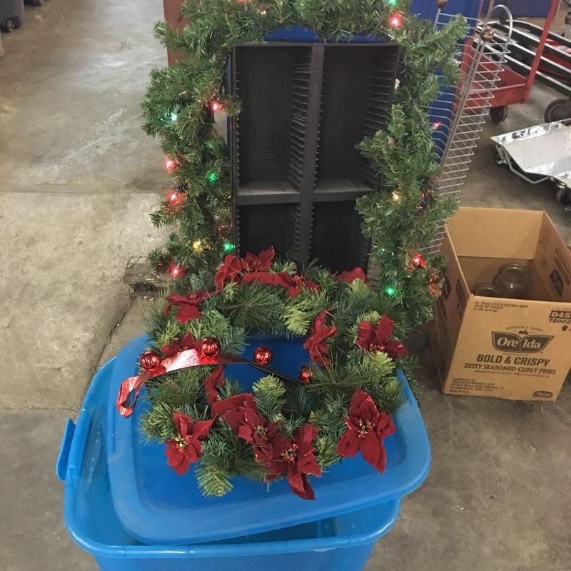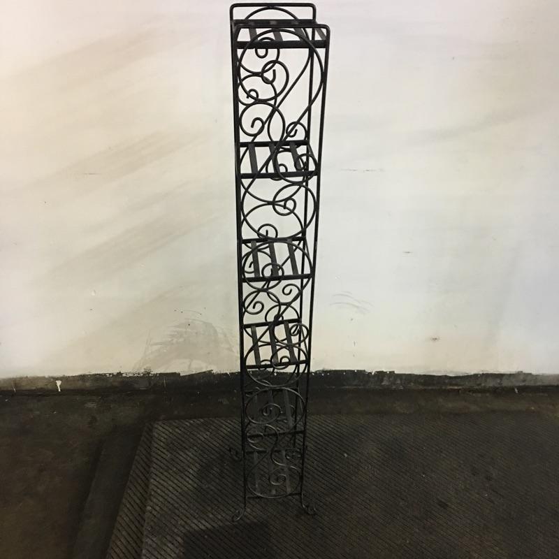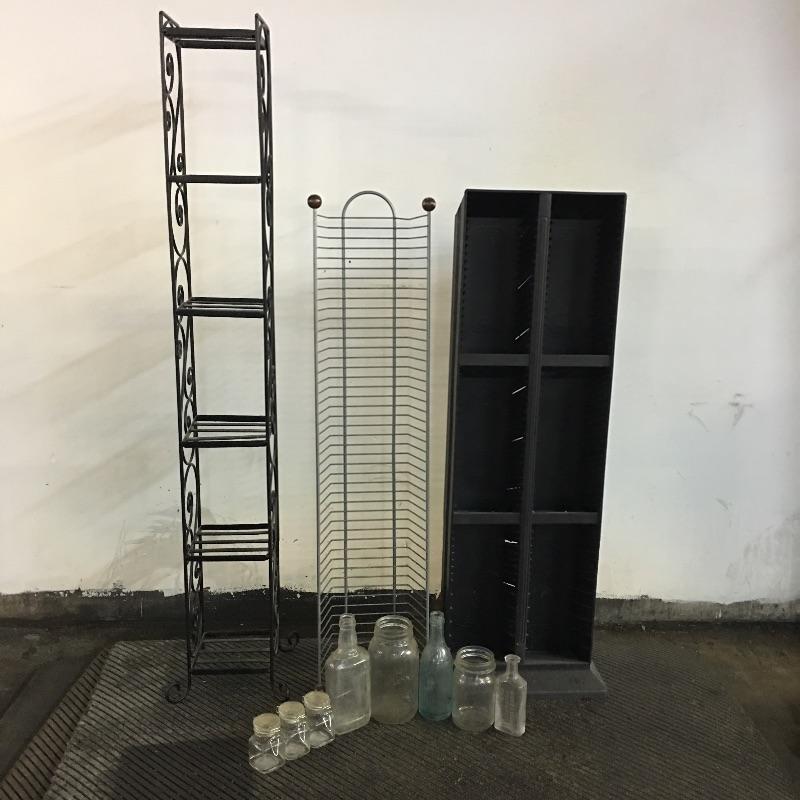 Lot includes CD stand, Display stand and possibly DVD stand, selection of glass bottles Christmas lights, wreath, bells and a decoration of wings shaped like a heart. Largest display stand measures 6” x 6.25” x 48”.