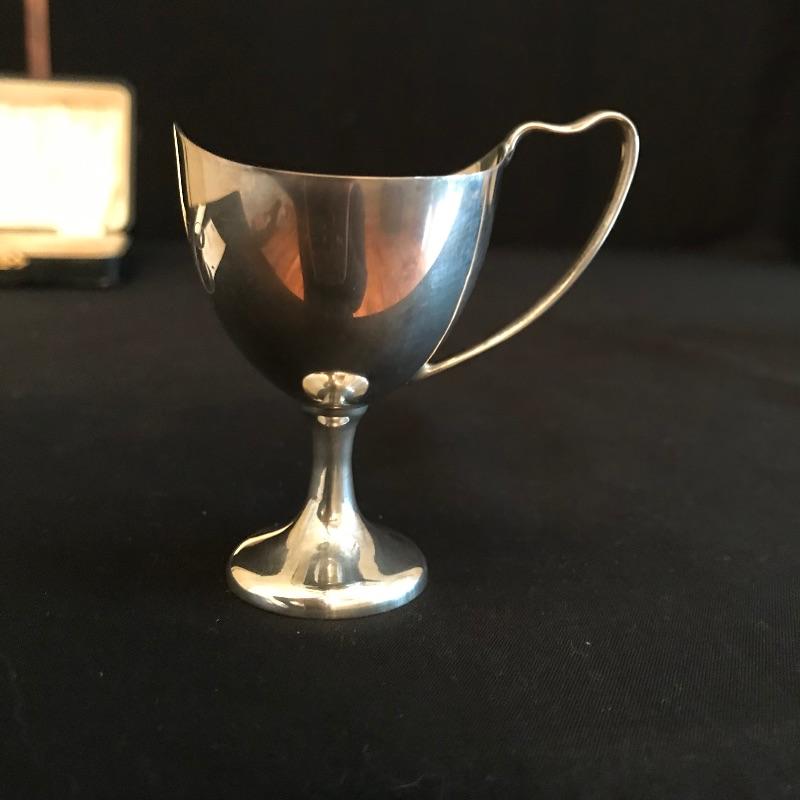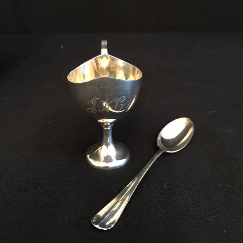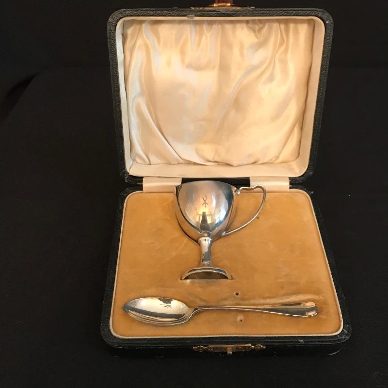 Vintage soft boiled egg cup and spoon box set. Cup is 2.75” tall and has a monogram and no other known markings. Cup is paired with a spoon with hallmarks stamped. See pic. Owner stated that markings indicate sterling. Box is cloth lined and measures 5.5” x 4.75” x 2”. See photos. Shipping available.