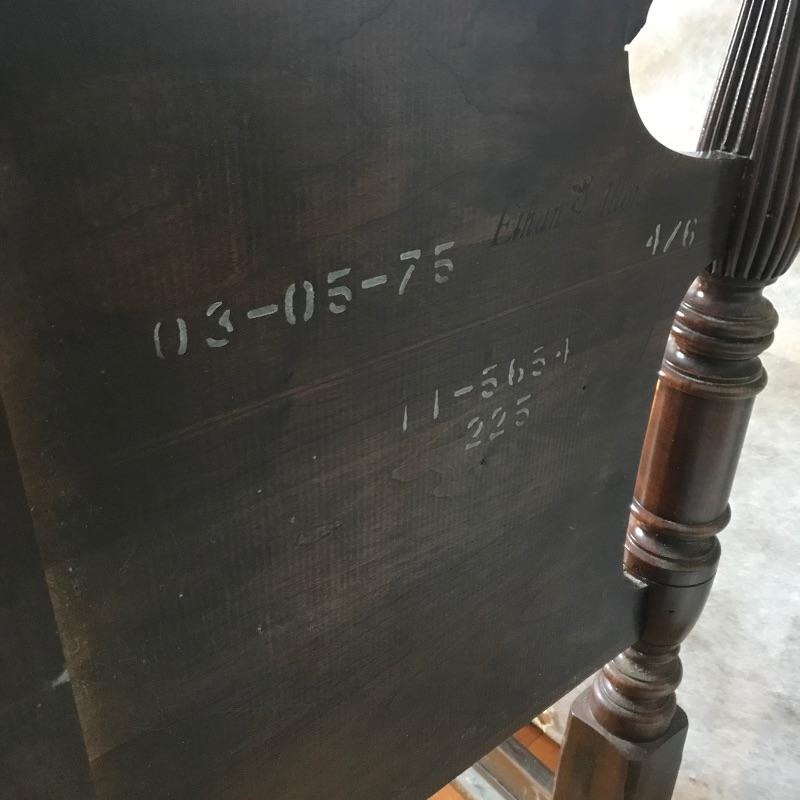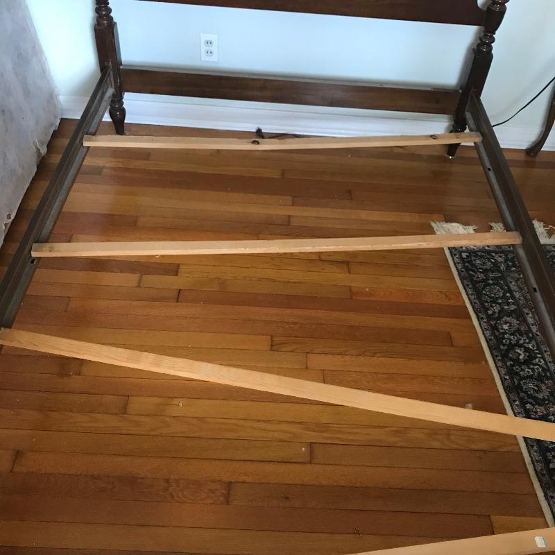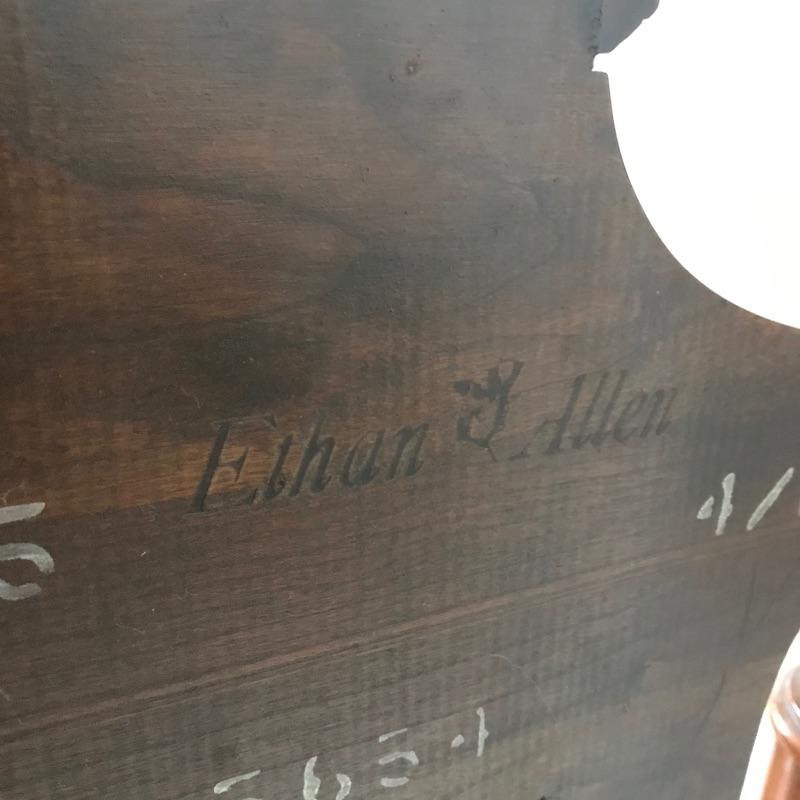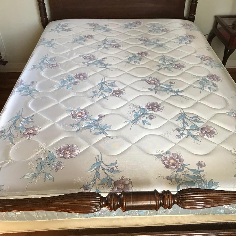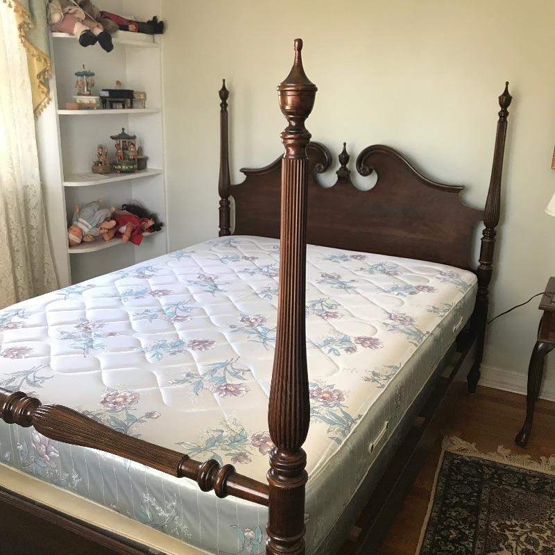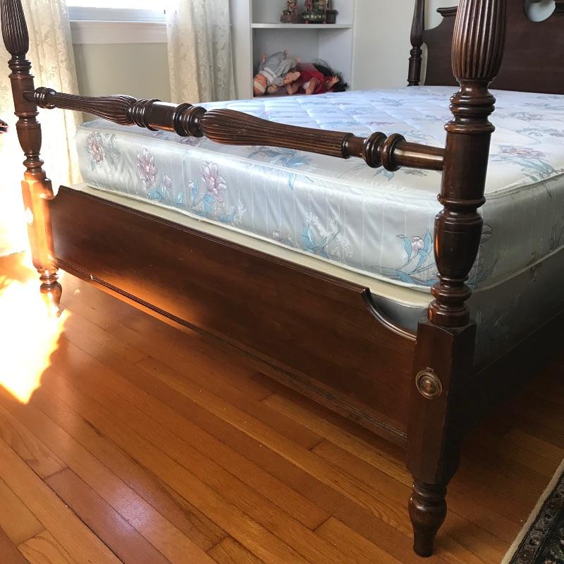 Elegant four post double size bed by Ethan Allen. This lovely classic bed shows very little wear and we presume it was used as a guest bed. Winning bidder may take matching mattress and box spring at no additional charge. Headboard and footboard appear to be solid wood. Side boards are metal and currently have four after market slats to stabilize box springs and mattress. Bed appears in very fine shape see photos. Bed frame measures approximately 57.5” x 80” x 57”. See photos. No shipping.