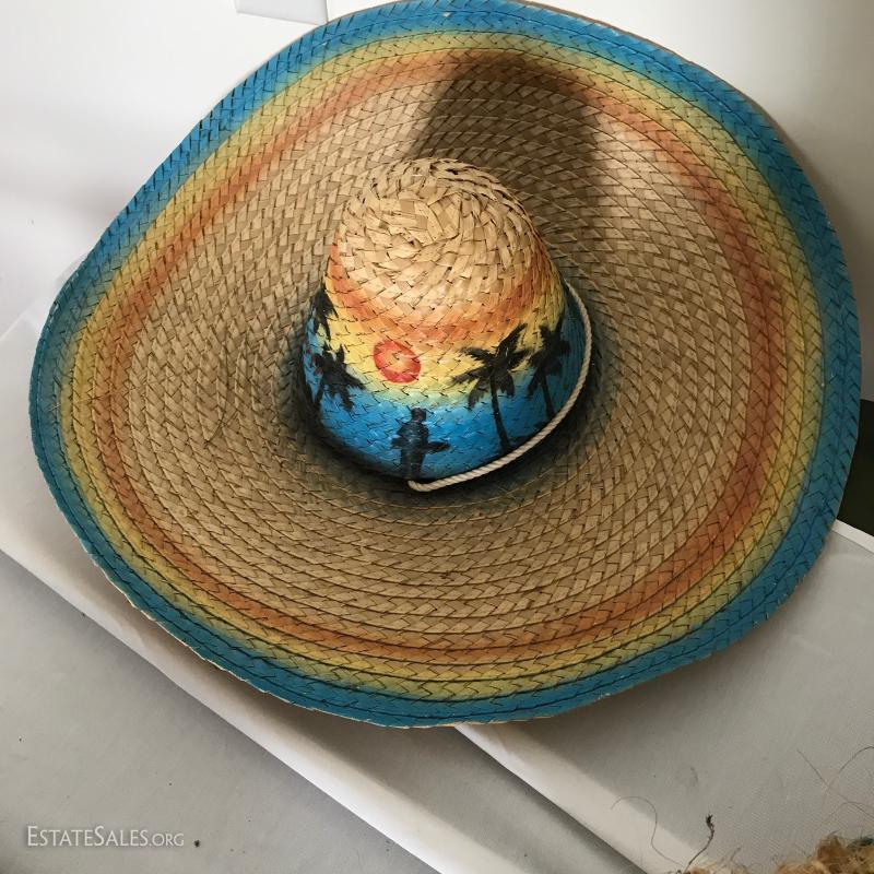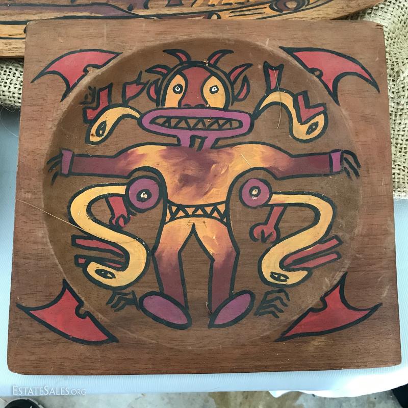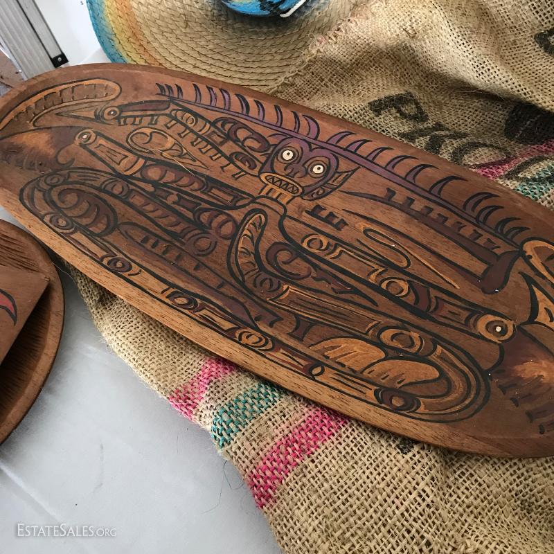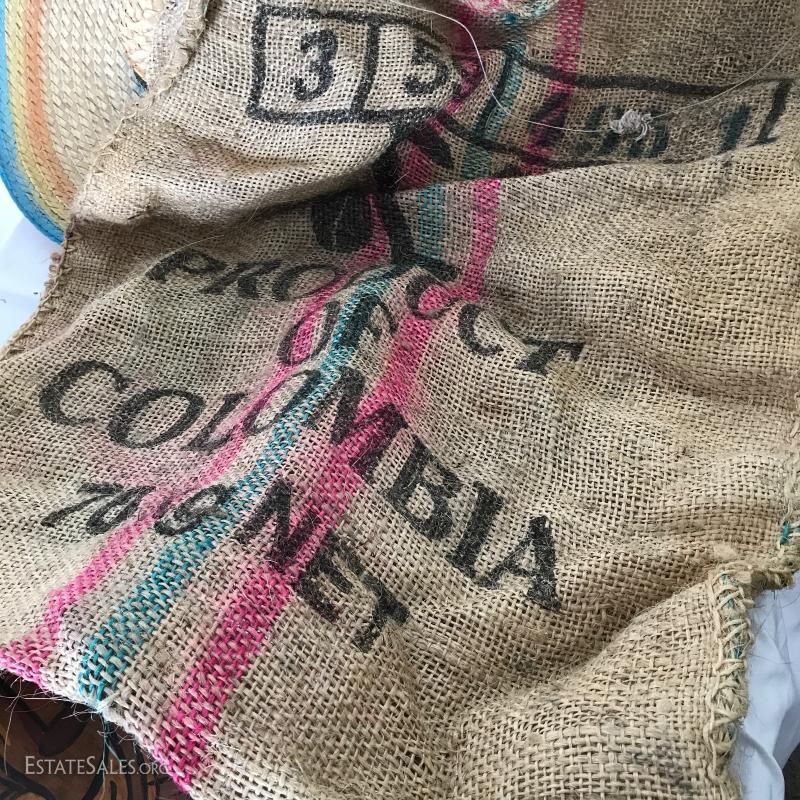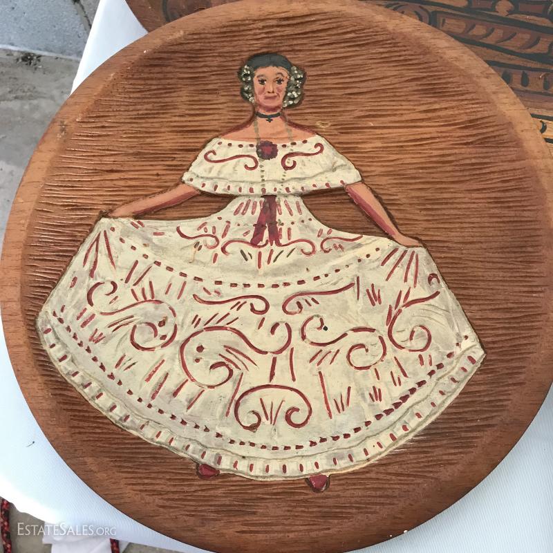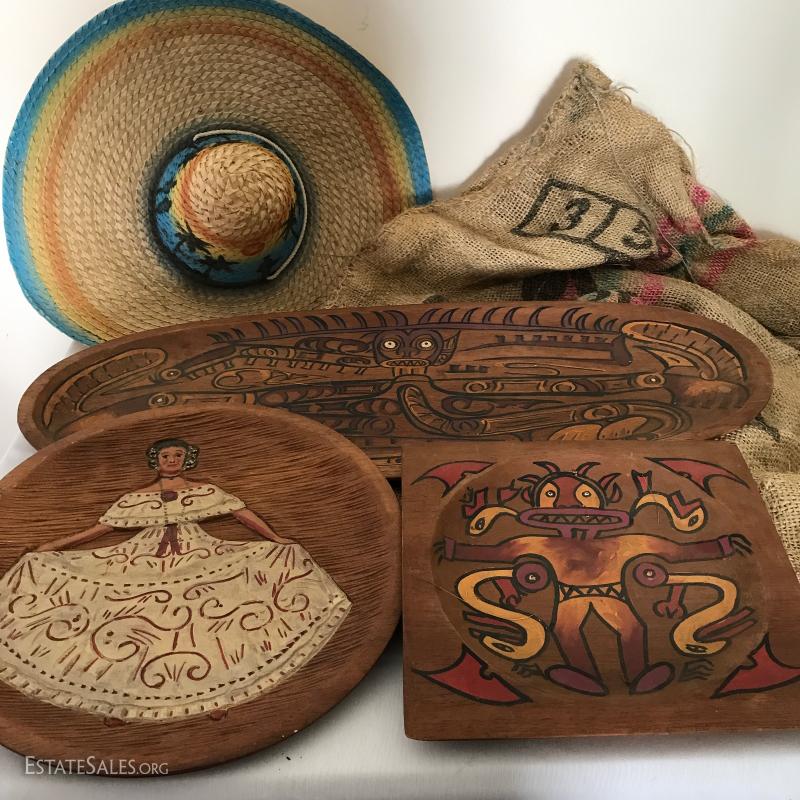 Unique items from various cultures. Two beautiful hand-painted "tribal" wooden platters. Oval one is approx. 30.5"l x 11.5" w. Square one is approx. 12"l x 11.5"w. Wood Latín dancer platter is also hand-painted and 14.5"d. Lot also includes sombrero and burlap coffee bean sack, approx. 34"l x 27"w.