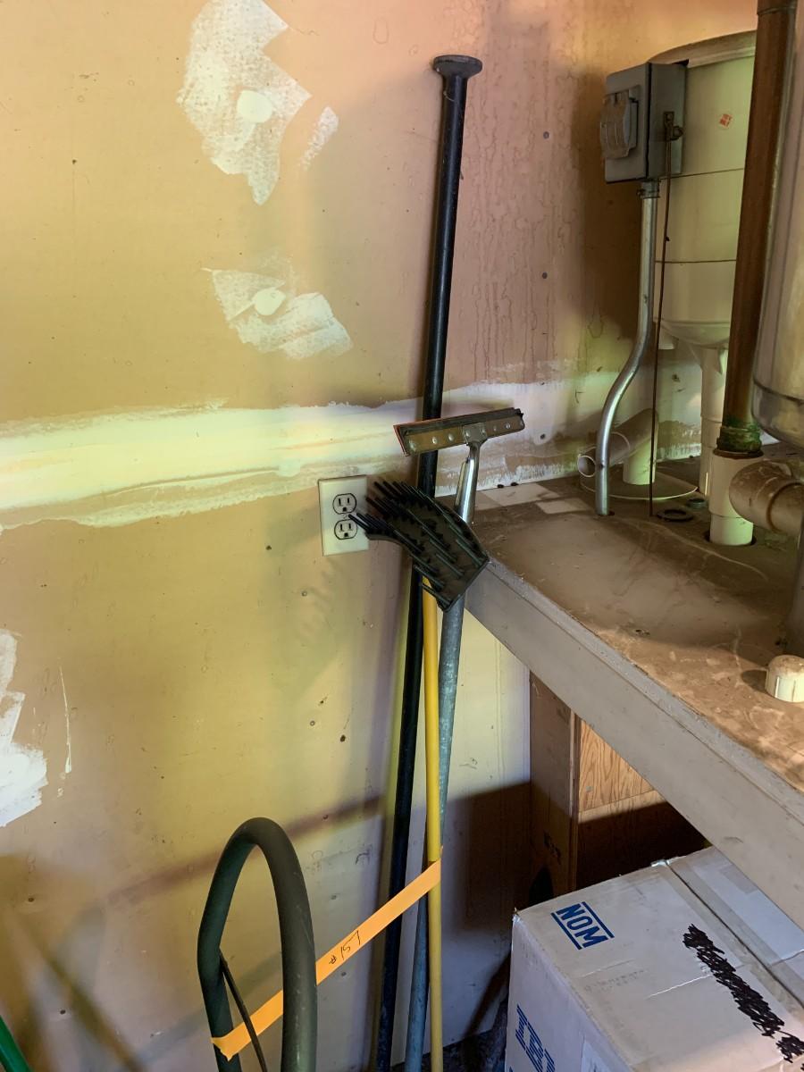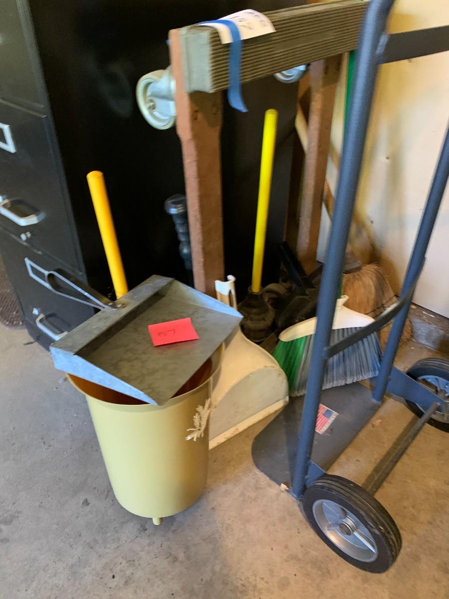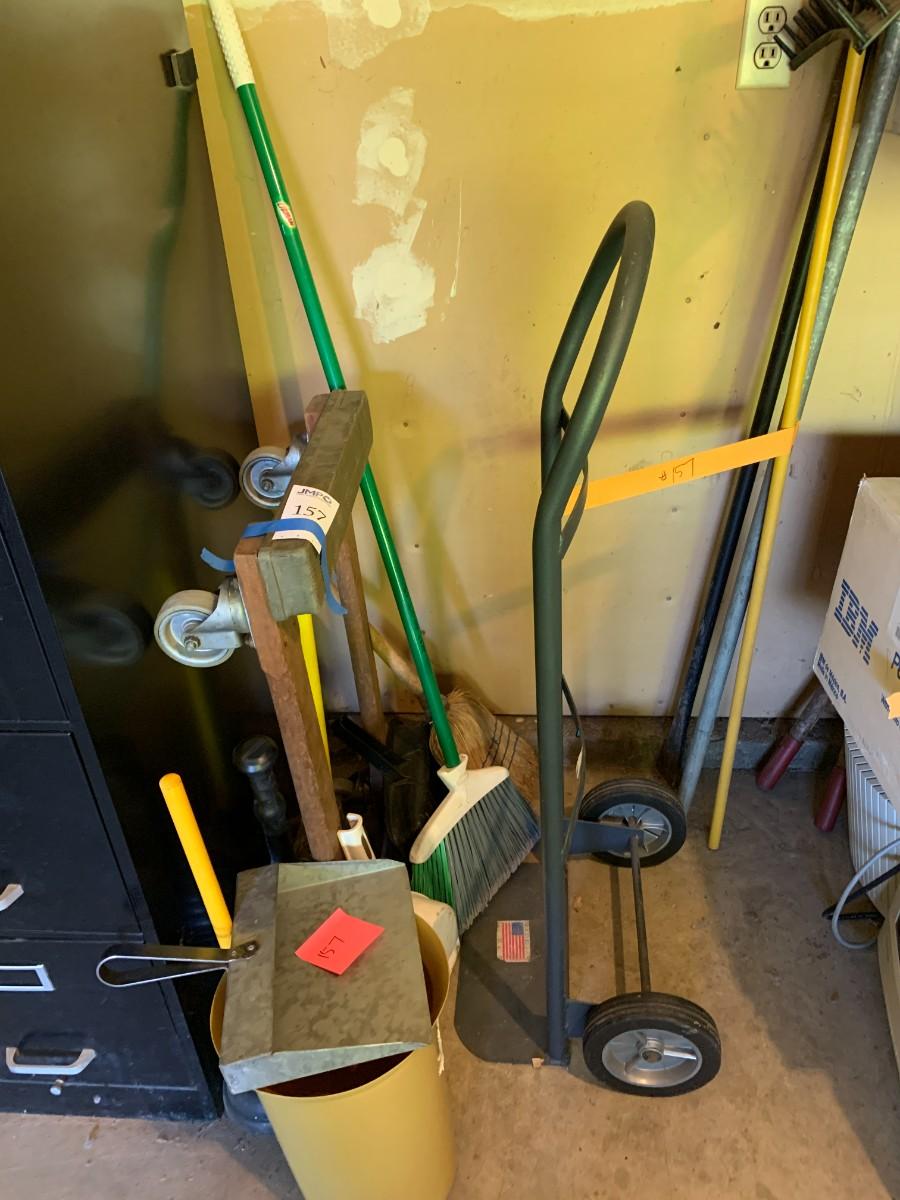 Dolly, hand cart. Iron bar, brooms, waste can.