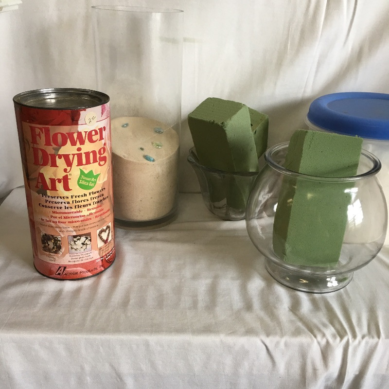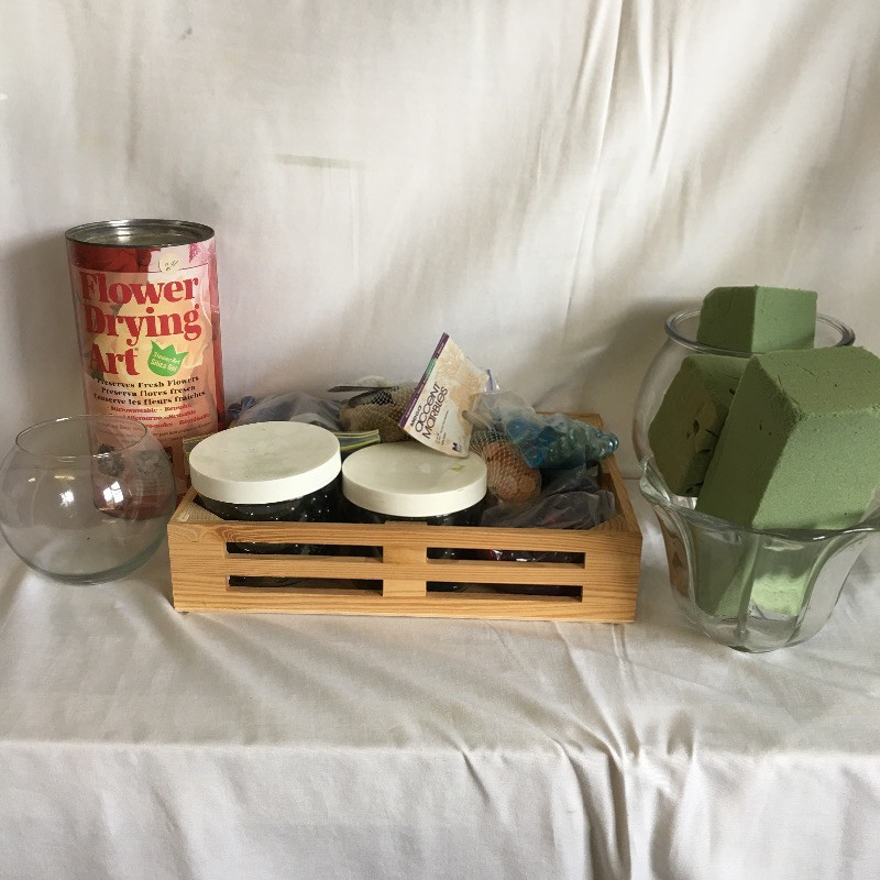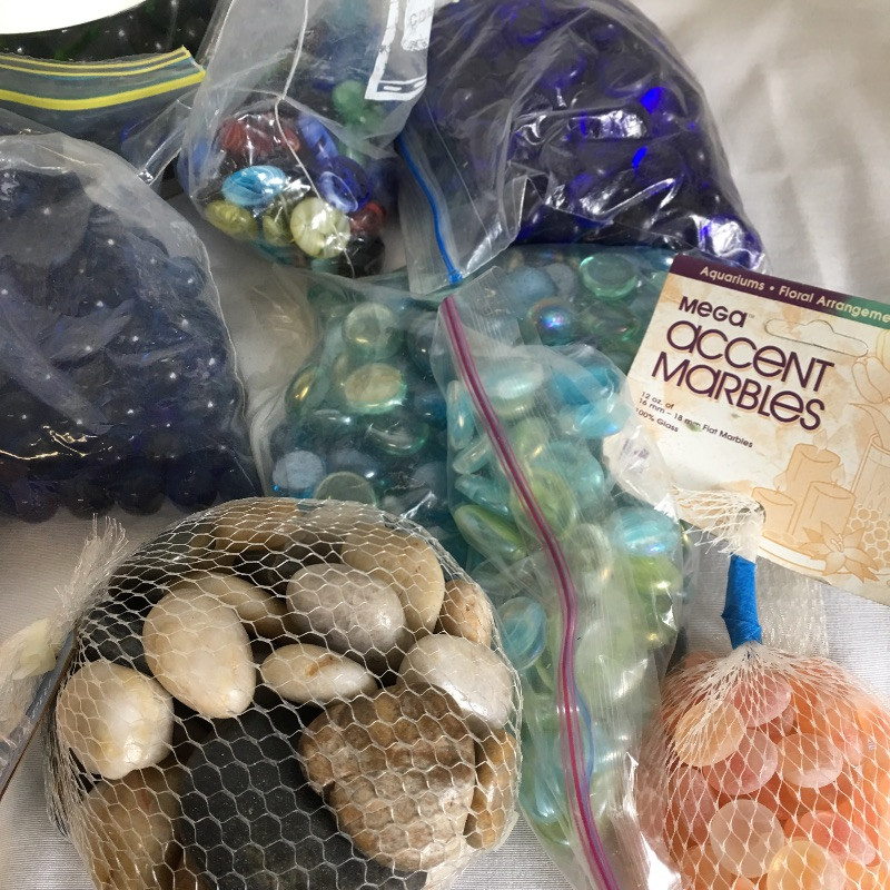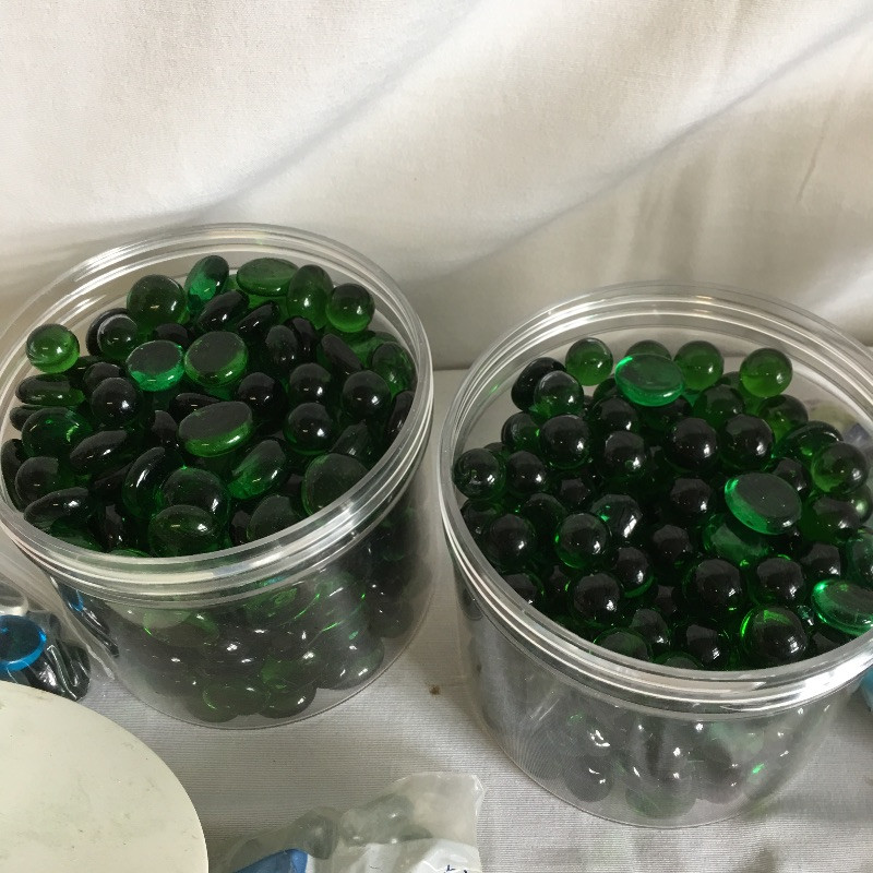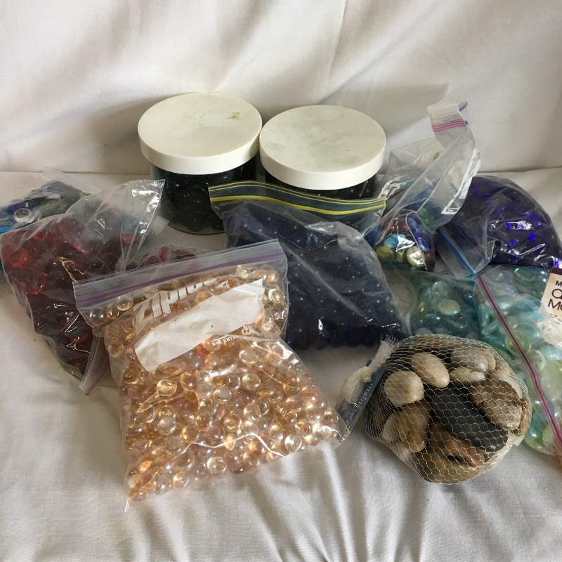 A nice varied selection of glass beads, rocks, sand, flower drying art, glass vases and more. Tallest vase measures 6”D x 15” tall.