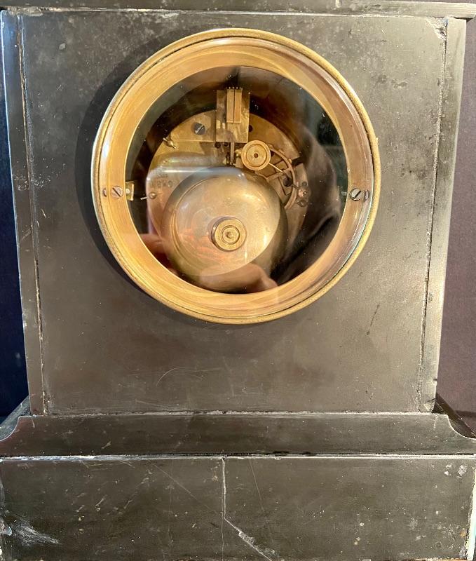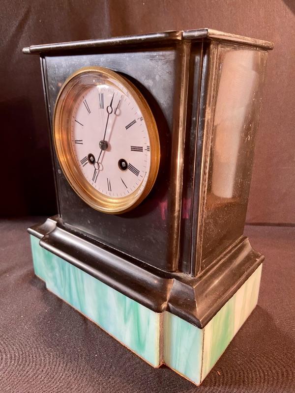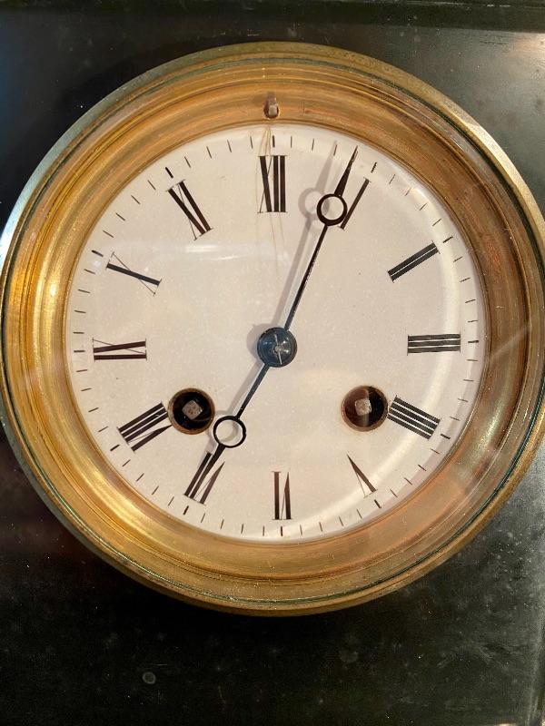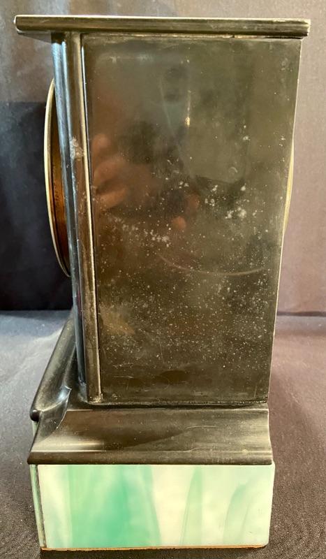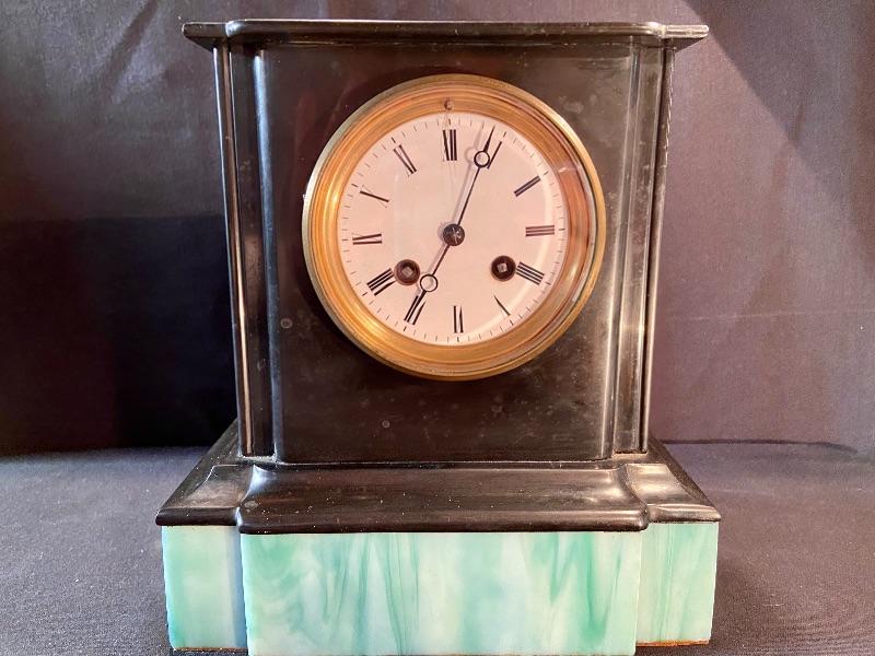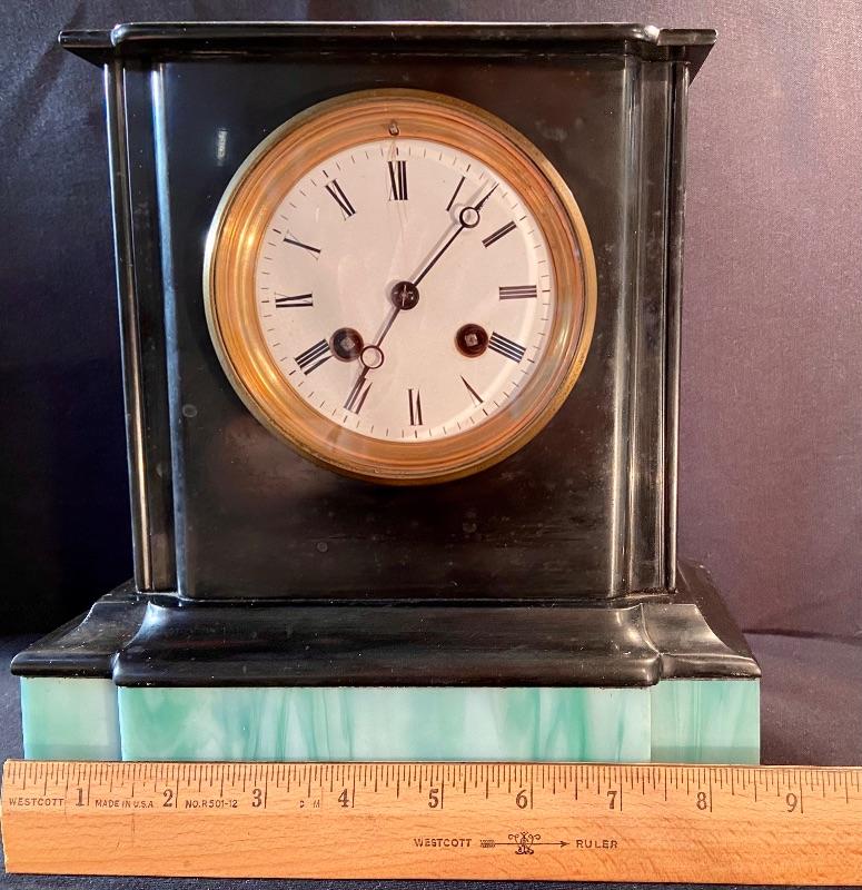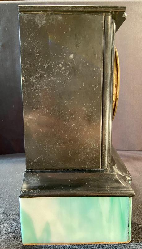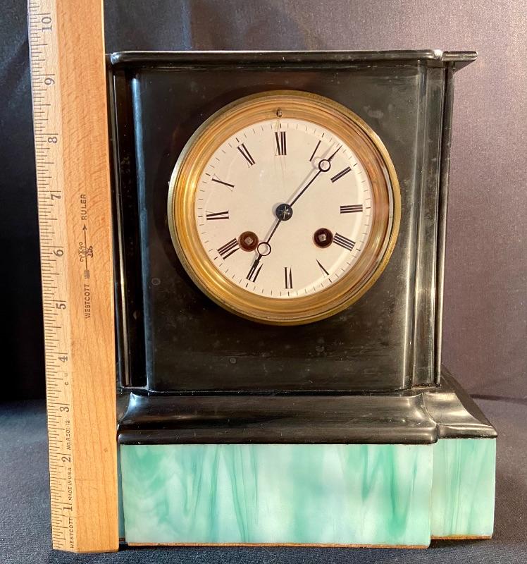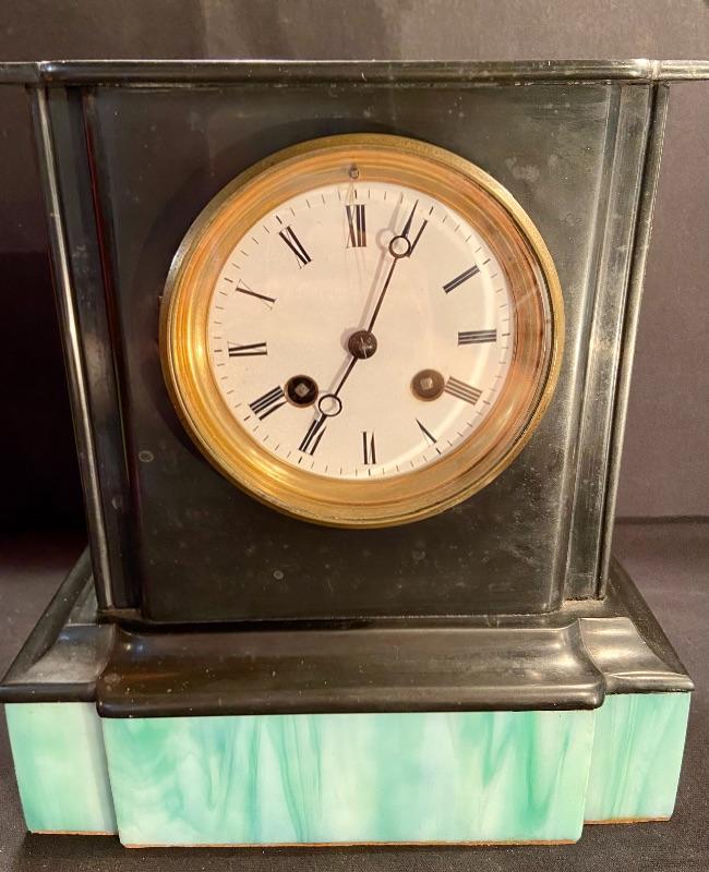 Vintage H&F Marble clock from Paris, France 8.75x9.75. In working condition but doesn’t have the key. MHW This is even prettier in person, flash is showing age, but when light not flashing looks jet black and the green pops! Please see all pictures for content of the lot, condition of the lot, and measurements if taken. Pictures are the best representation of the items listed and items are untested unless indicated in description. Thank you for looking and have fun bidding!