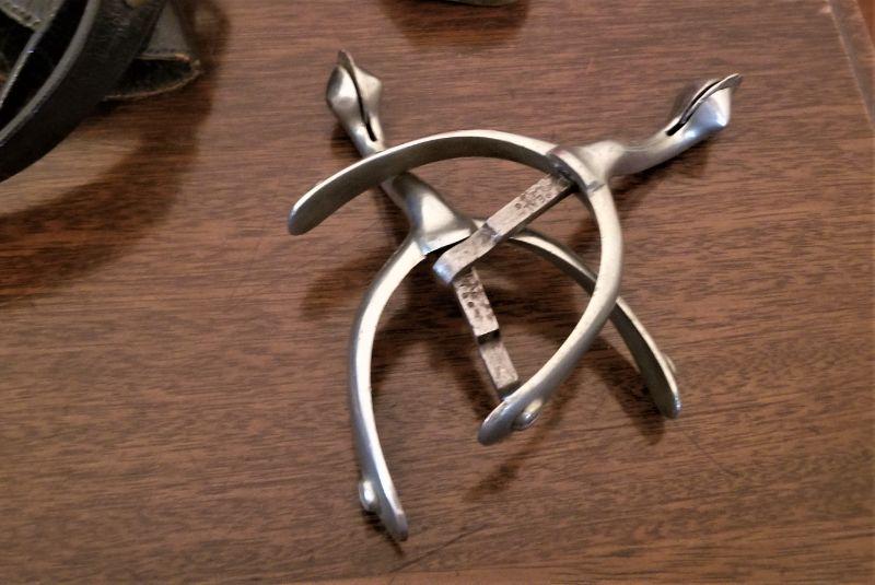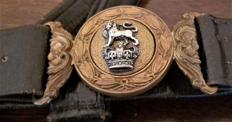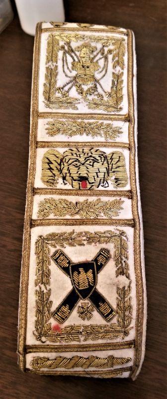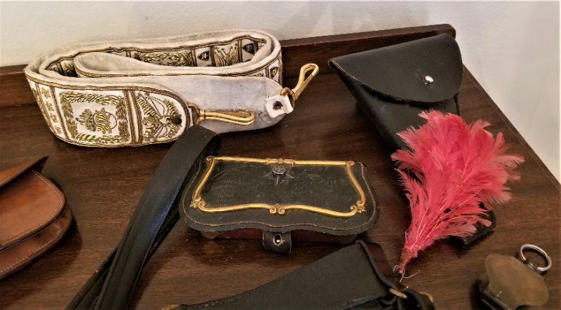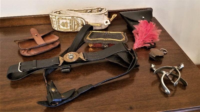 You get all you see here - 7 pieces + one set of spurs. Feather cockade for hat, leather belt with buckle, Spurs, brass piece that possibly held a compass, pistol holster (probably a repo), very nice gold thread embroidery piece, brown leather pouch, and another antique belt pouch. I would say most, if not all of these pieces are antique British militaria. You be the judge. Please look at all photos.