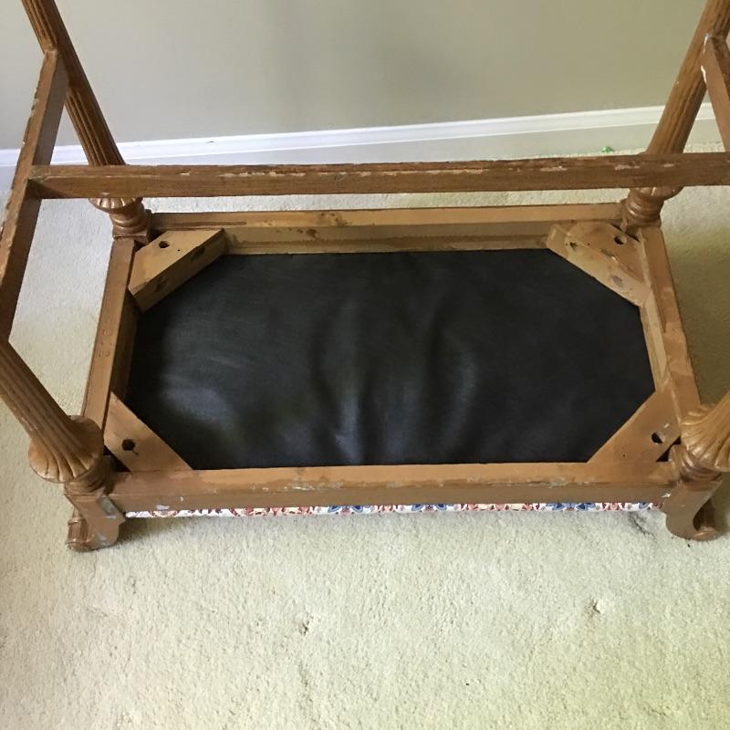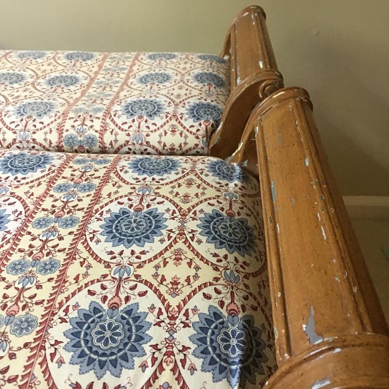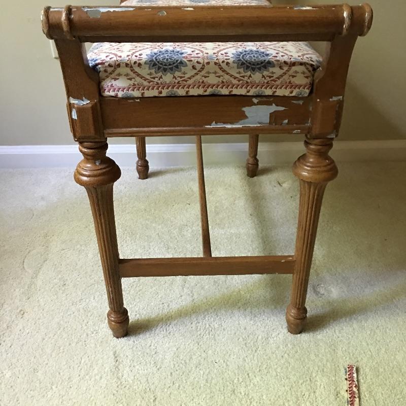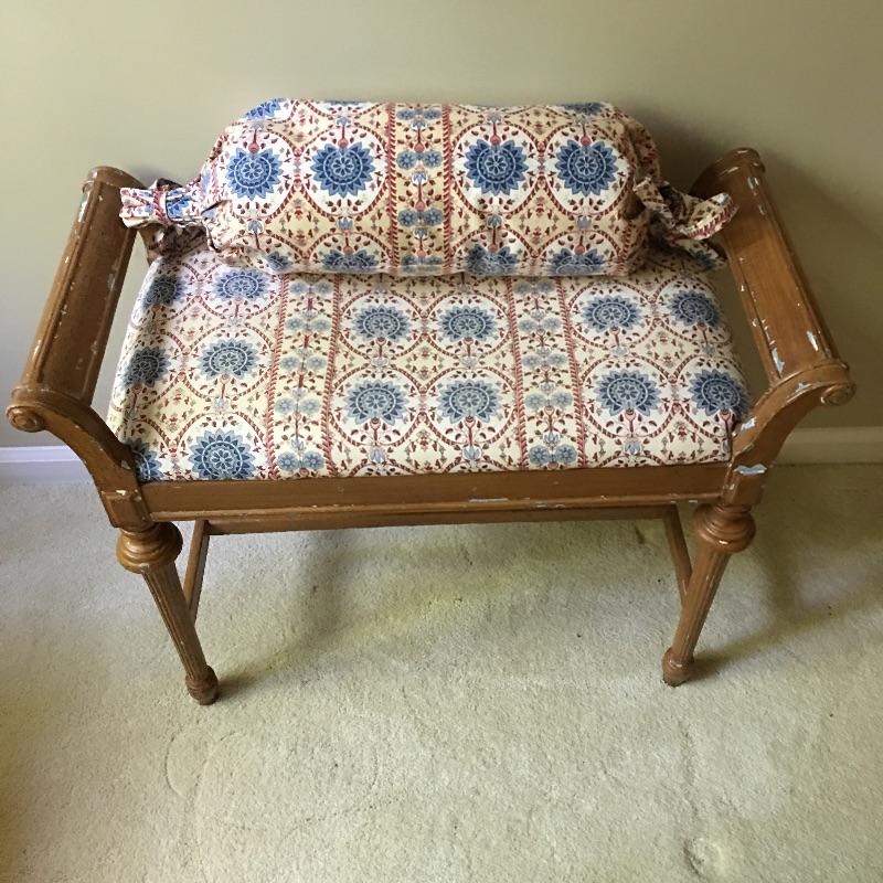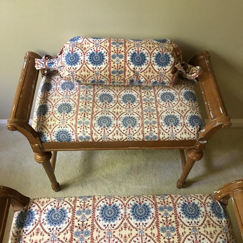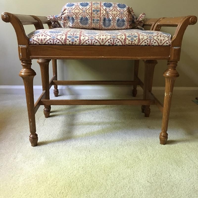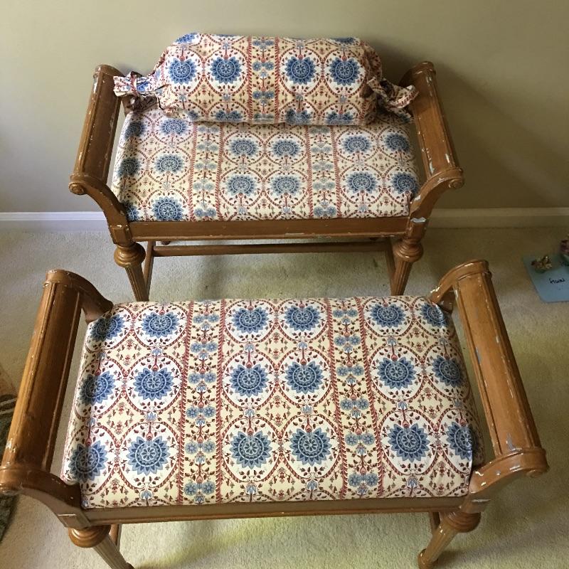 Pair of padded benches with one pillow. Matching benches both have chipping on the finish - see pictures. Benches measure 13.5” x 27.75” x 21”.