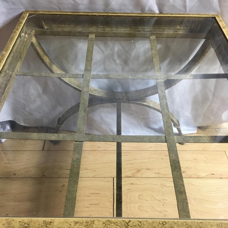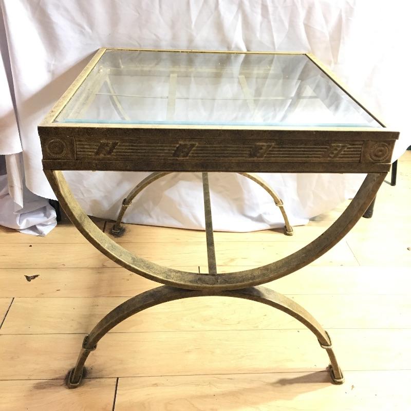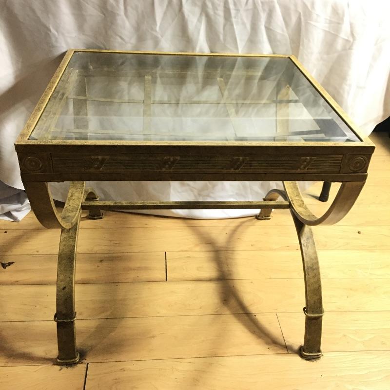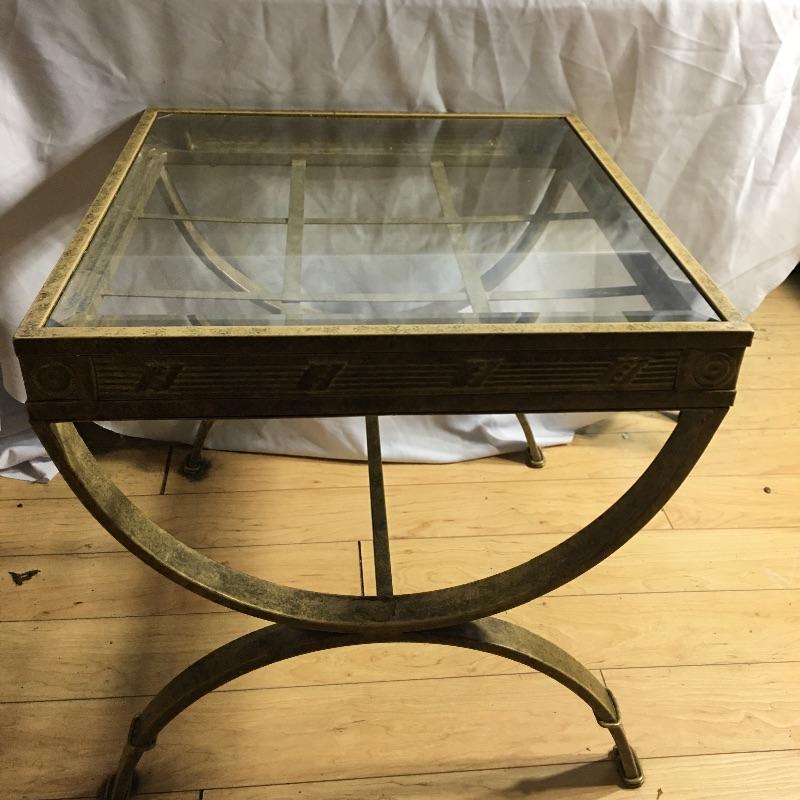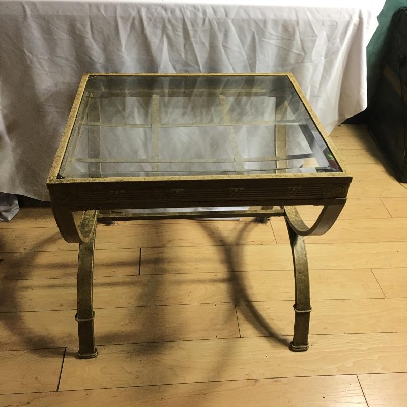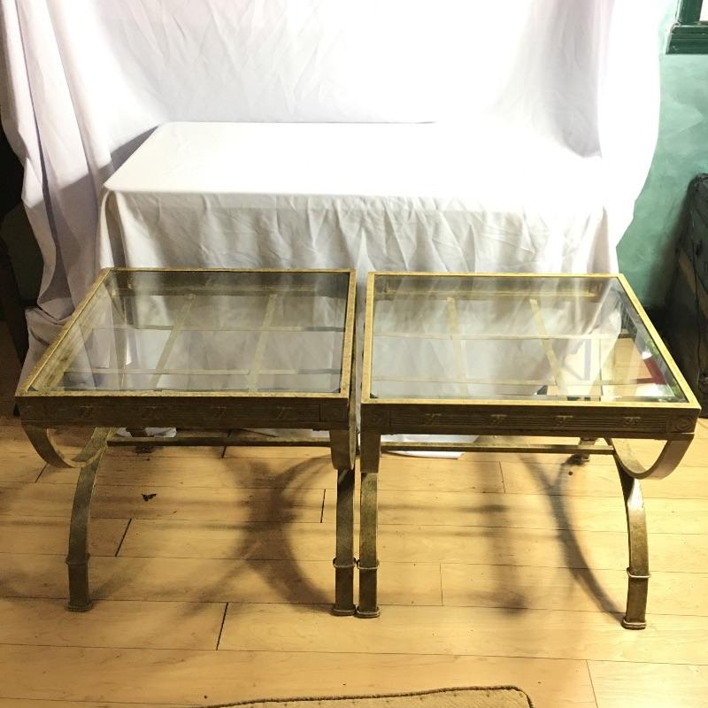 Pair of beveled glass and metal end tables. A beautiful pair of tables with curves and corners to draw your attention. Tables measure 22” x 24” x 22”.