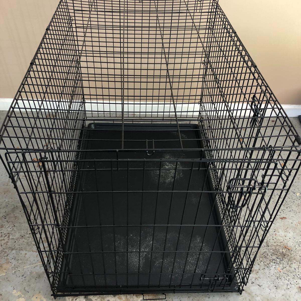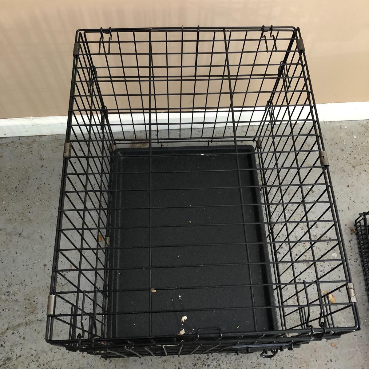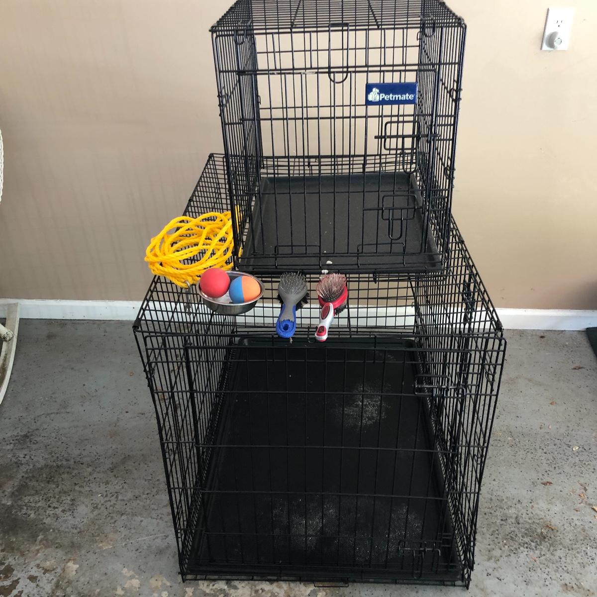For the big or little dog in your family. Lot includes Petmate foldable metal crate and a unbranded folding metal crate, both with slide in plastic tray. Also includes two brushes and balls, stainless steel bowl and leash. Large crate measures 28” x 42” x 31”.