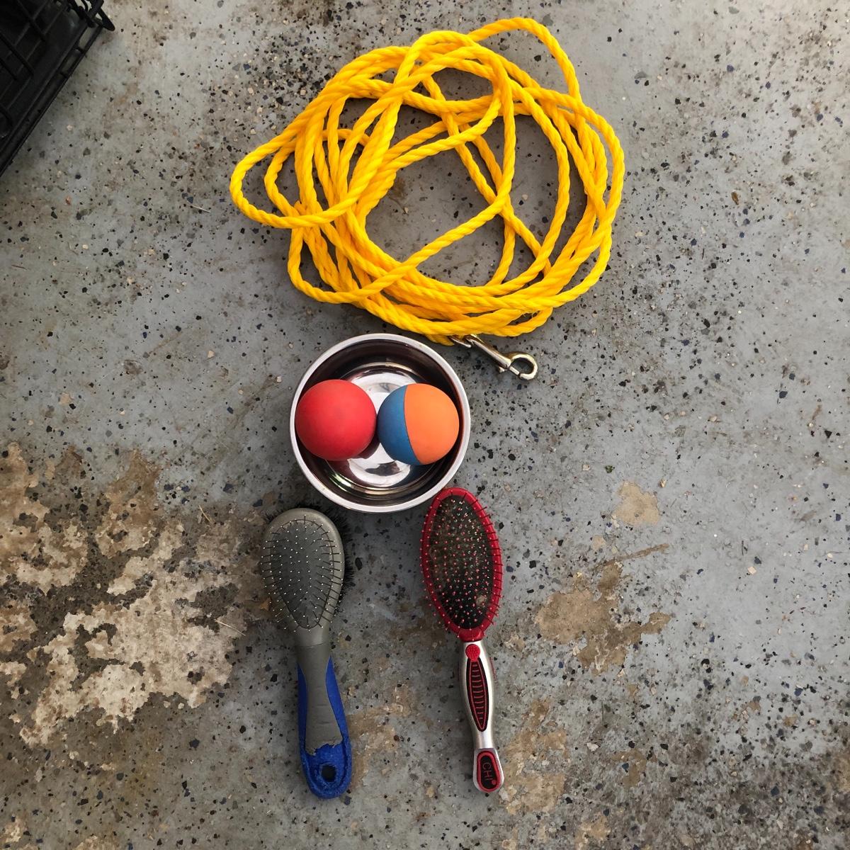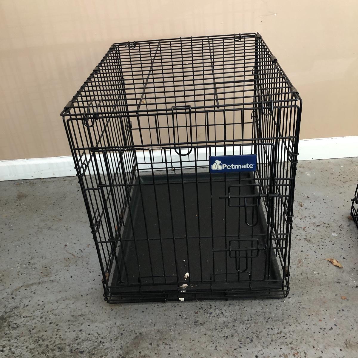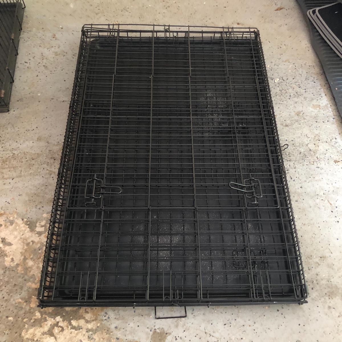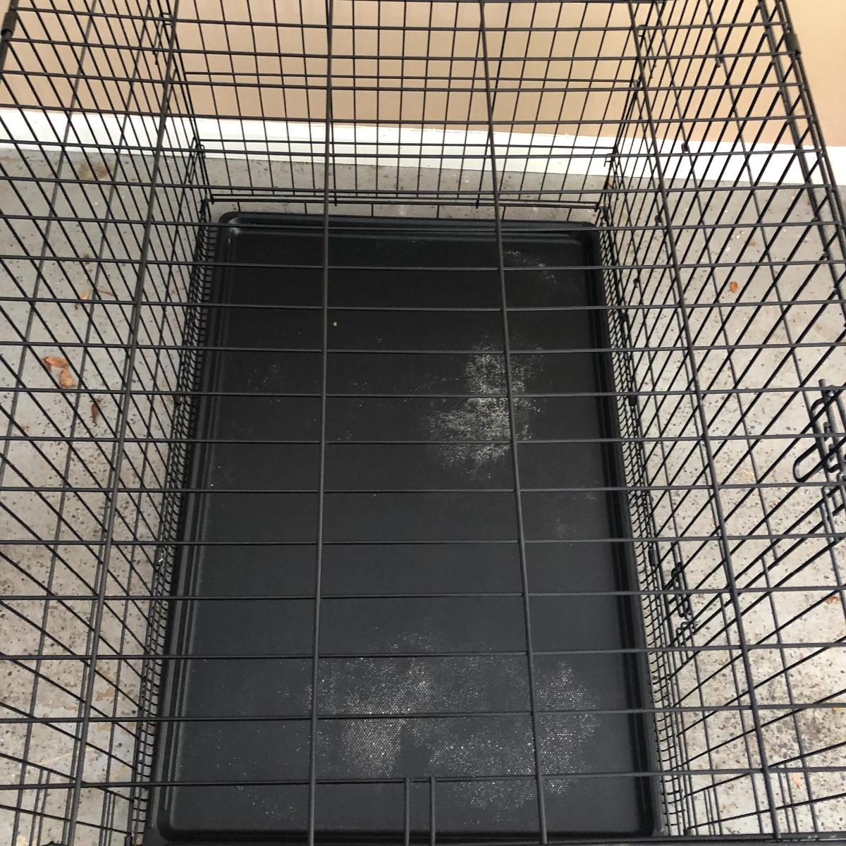 For the big or little dog in your family. Lot includes Petmate foldable metal crate and a unbranded folding metal crate, both with slide in plastic tray. Also includes two brushes and balls, stainless steel bowl and leash. Large crate measures 28” x 42” x 31”.