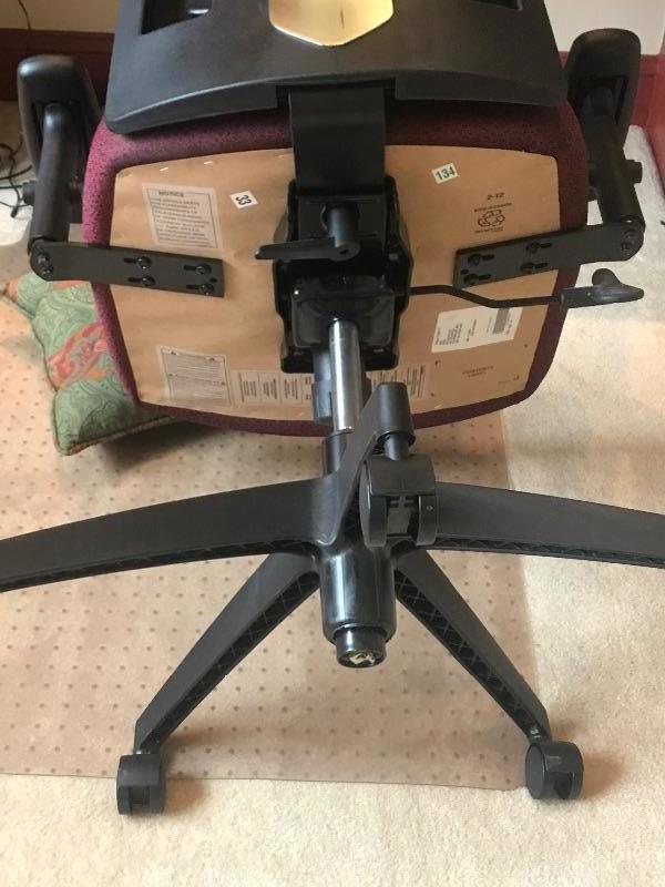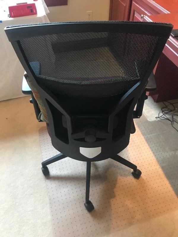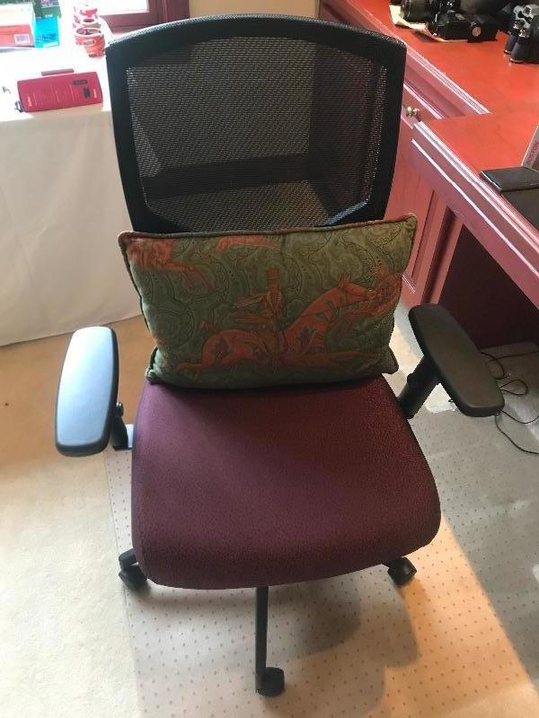 Rolling office chair with adjustable height and lumbar support, arms adjust from front to back for comfort. Comes with throw pillow and carpet protector