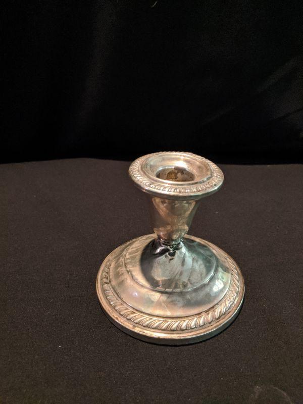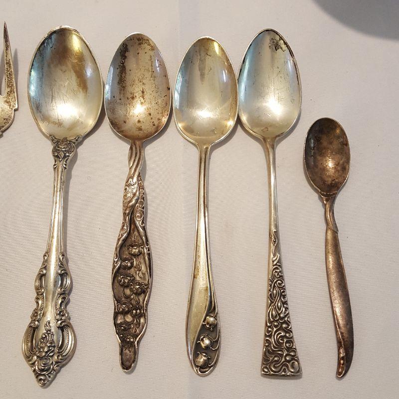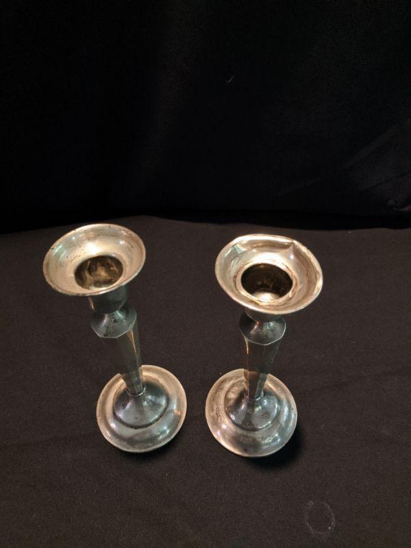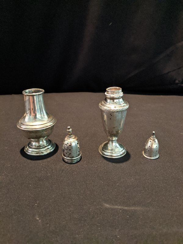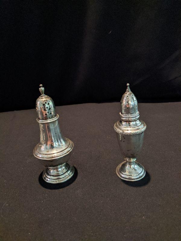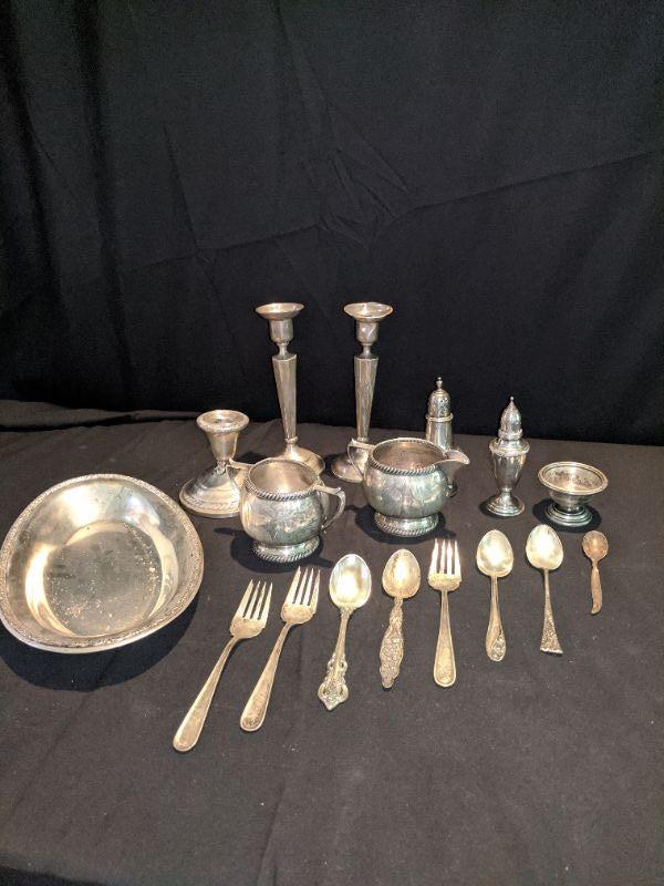 An assortment of sterling silver items. There are a couple of weighted candle holders, salt and pepper shakers, creamer and sugar set (one has a small dent) and an assortment of spoons and forks. See photos for more details.