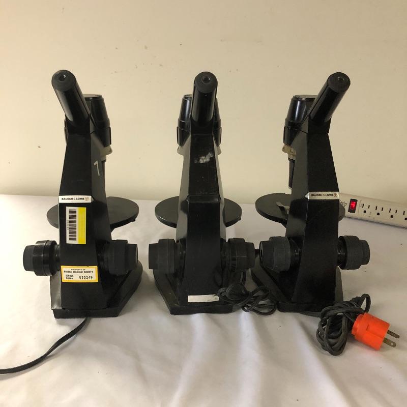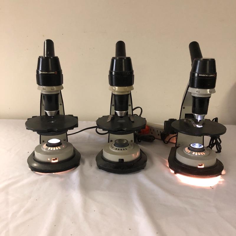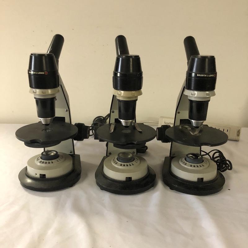 Keep things in focus with these three Bausch & Lomb microscopes. Lot includes three Bausch & Lomb microscopes. All three worked when tested, but one is missing a bulb. Microscopes measure 6.25” x 7.5” x 14”.