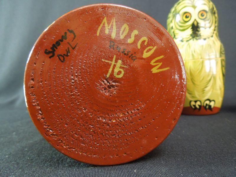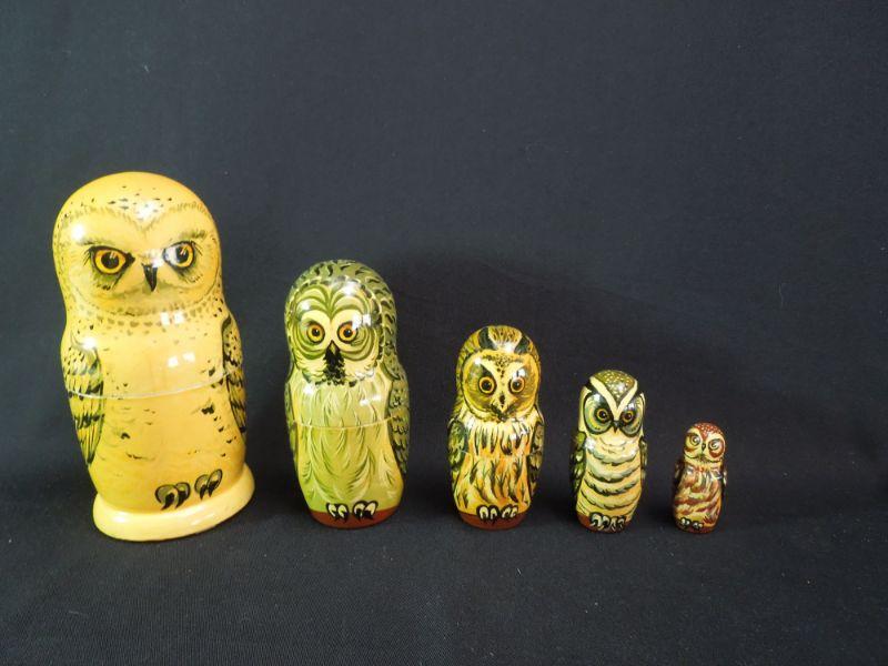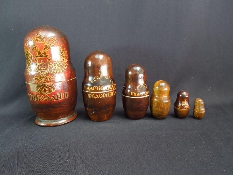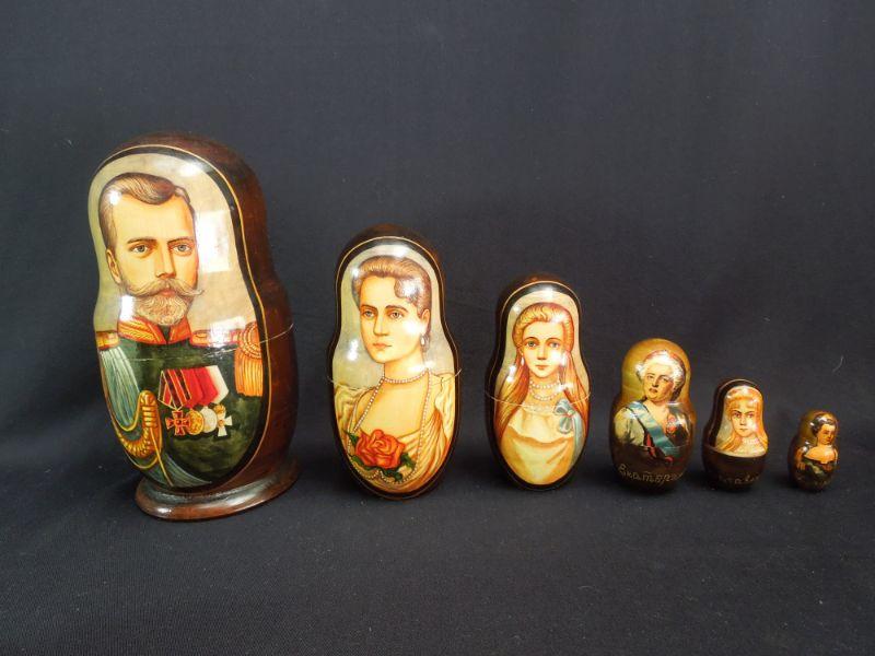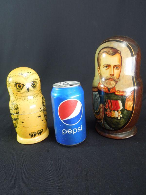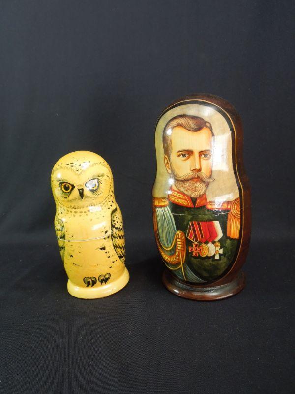 Last of the Tsars Nicholas II of the Romanov. Handcrafted 6 piece nesting doll set depicting Nicholas II and his family dated 1998. Also a wooden nesting owl set from Russia.