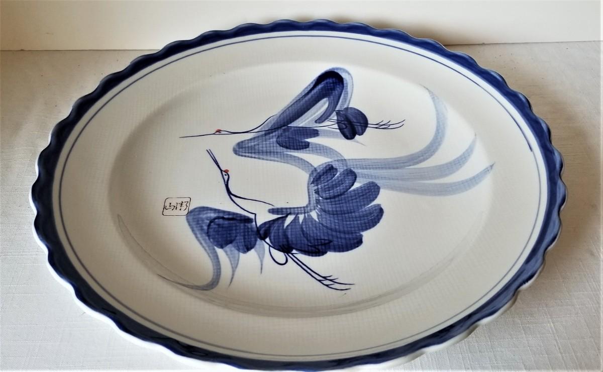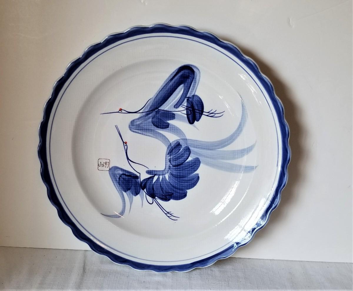Lovely vintage Japanese Charger, blue & white - 16" across, Crane motif, good condition.