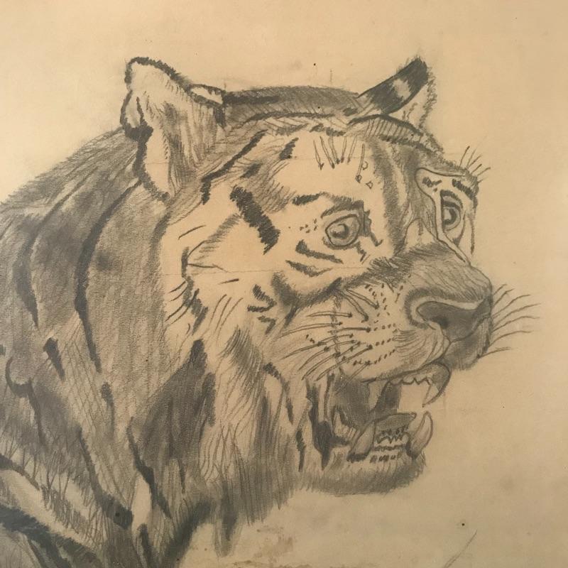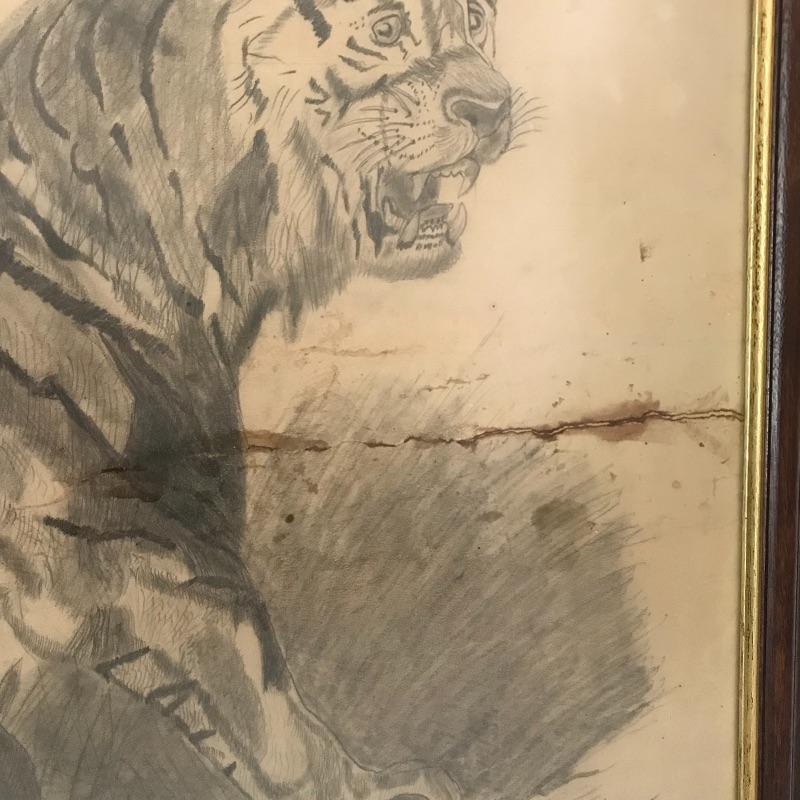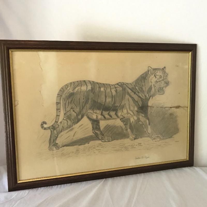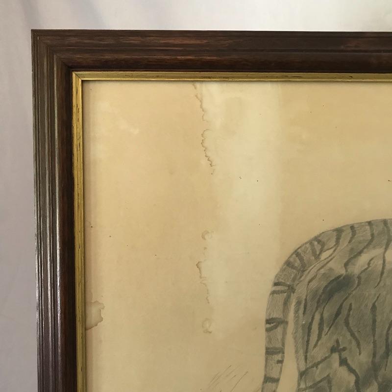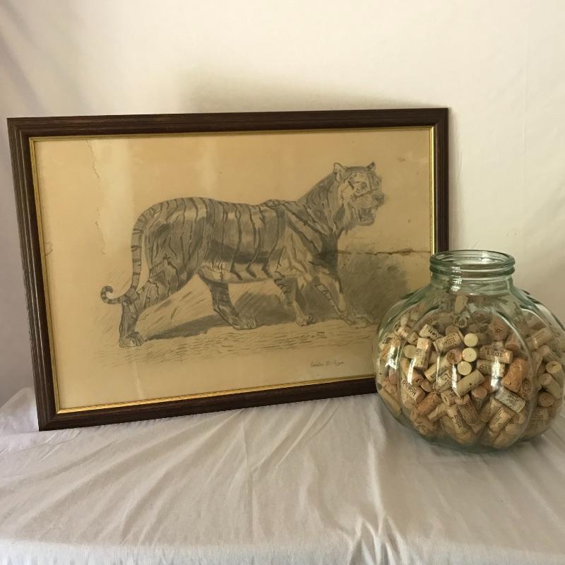 Truly a statement piece here with this large 33” x 23” wood frame with possibly a plexiglass panel holding what appears to be a signed sketch. The frame is ready to be hung and has 1911 written on the back. The Tiger art itself has blemishes, but it is still a conversation starter, see images. Also included here is a large uniquely shaped vase full of corks. Cork jar is approximately 12”d x 12. Shipping available. Please call UPS with dimensions at 828-252-6930 for a shipping quote prior to bidding..