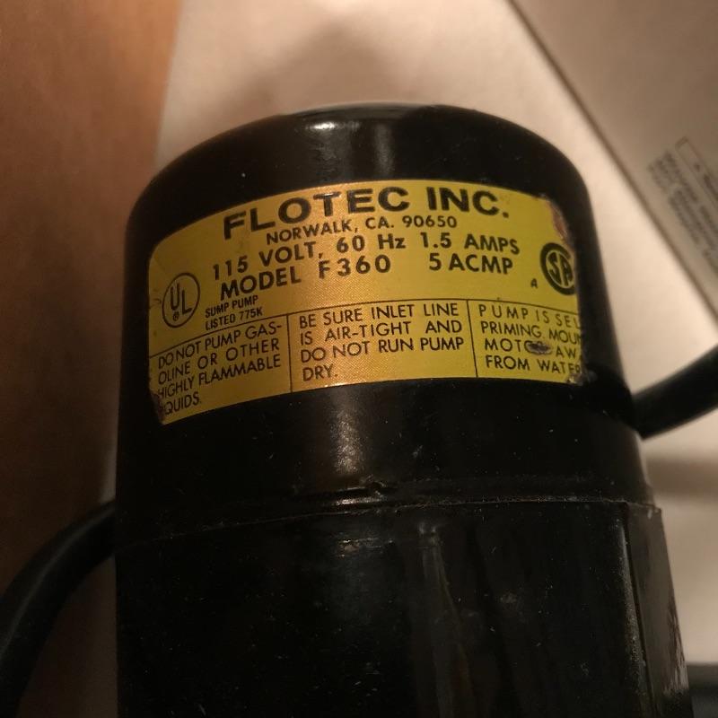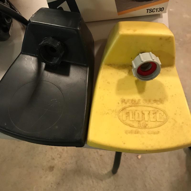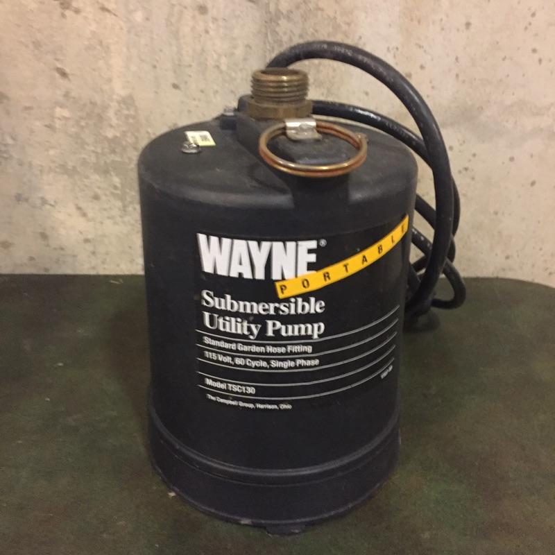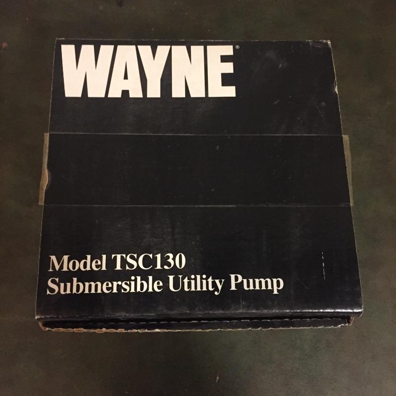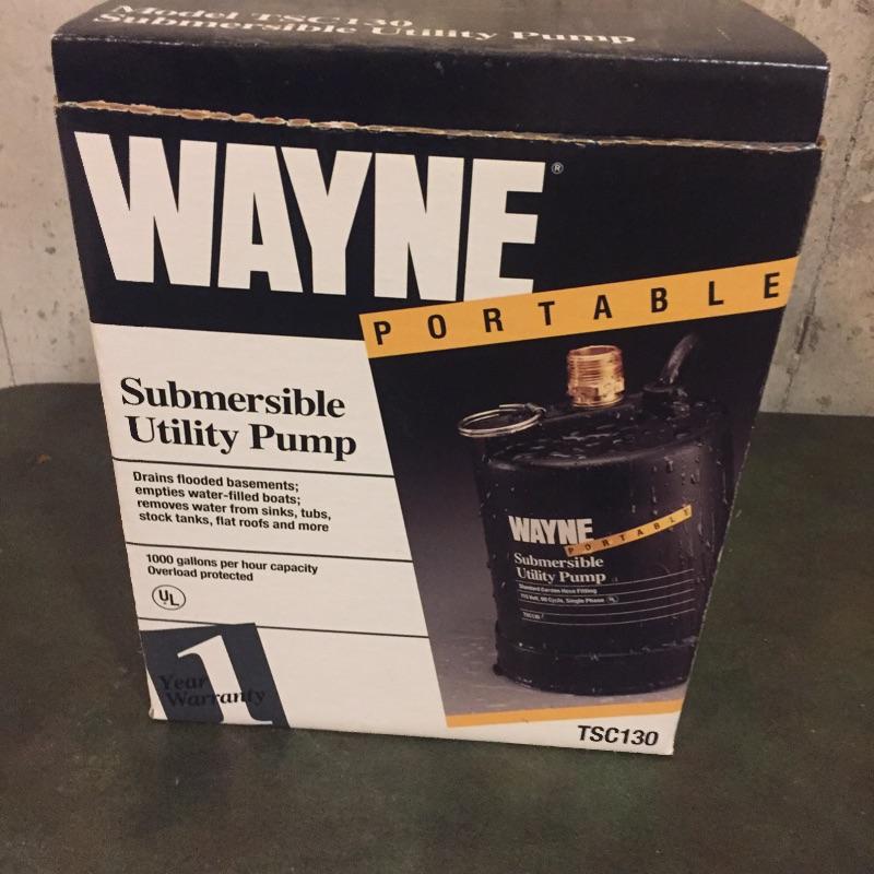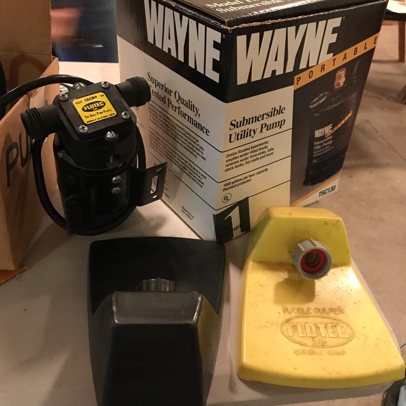 Wayne Submersible utility pump model tsc130. One thousand gallons per hour capacity. Great to have in case your basement floods. Wayne Pump is accompanied by Flotec F360 “The Drill Pump People” and two pump accessories. No shipping.