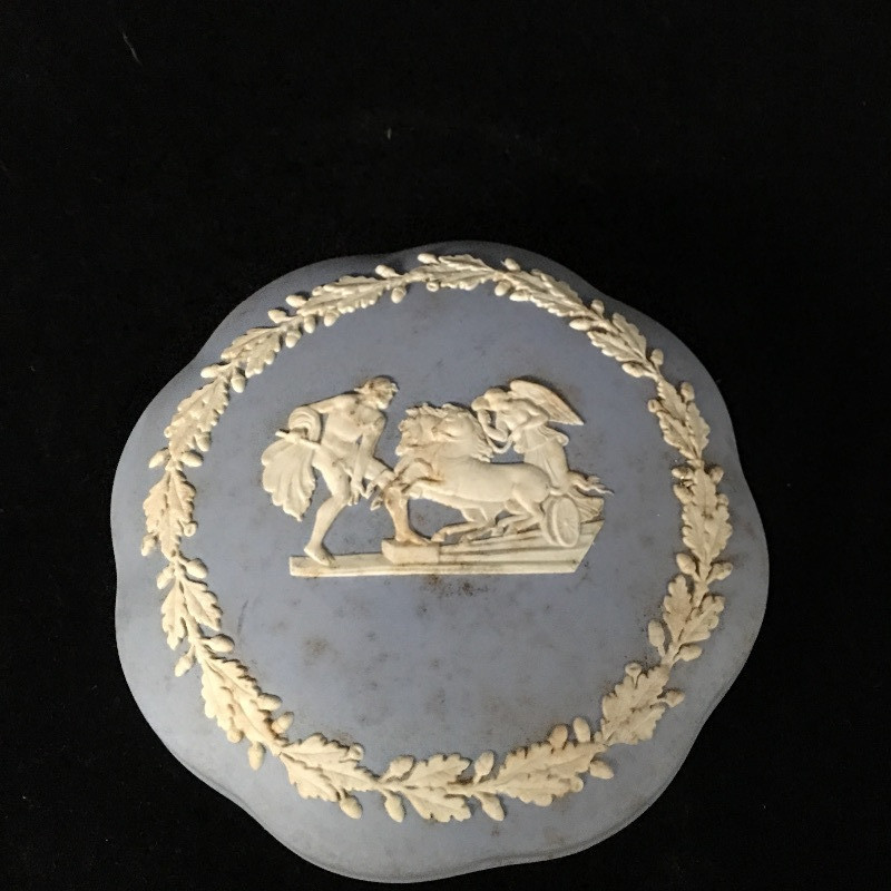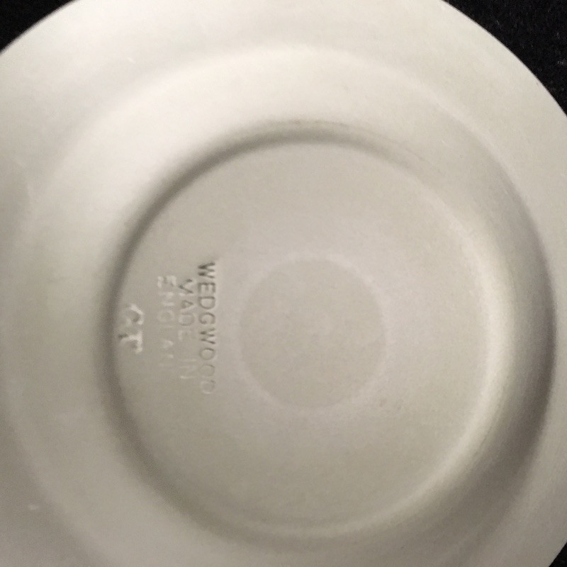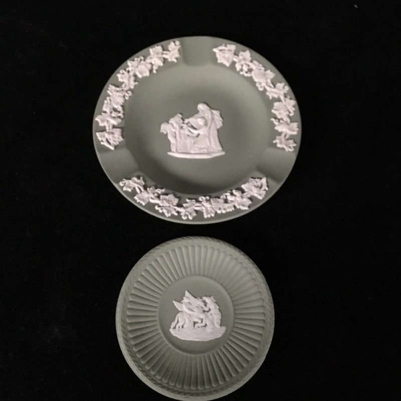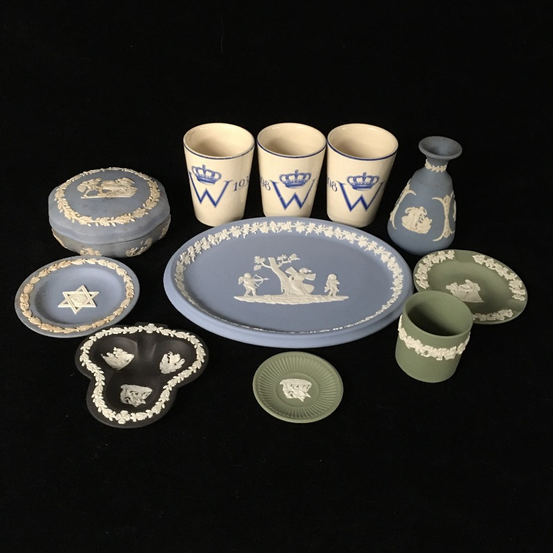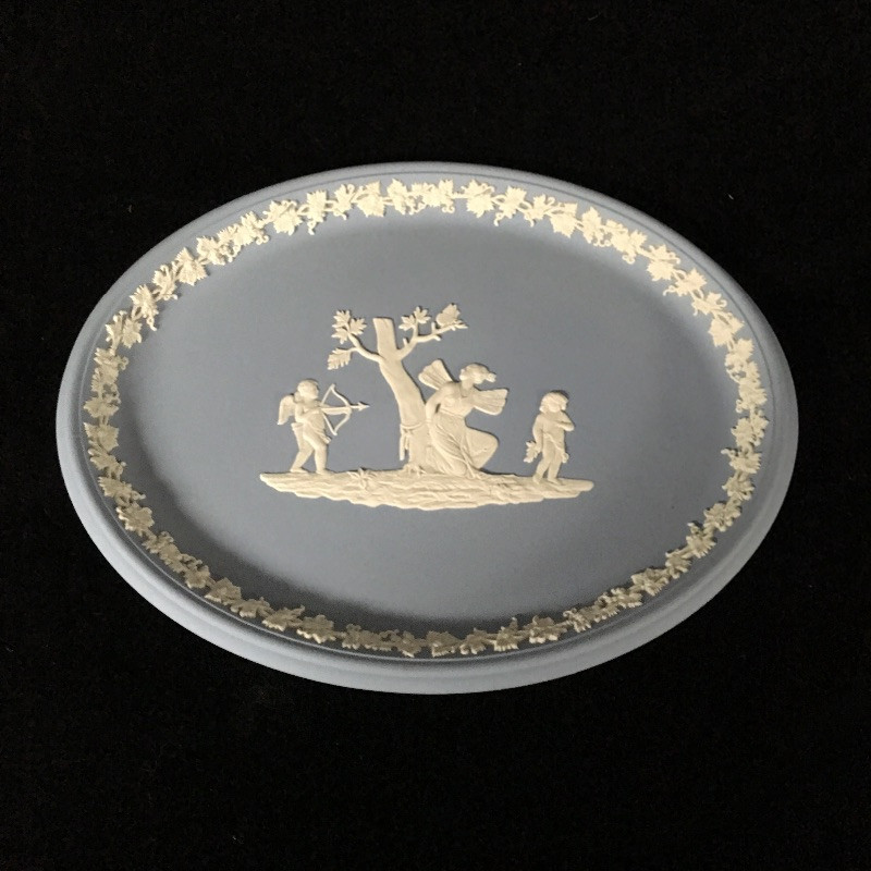 Array of Wedgewood including four small plates, one oval plate, covered container and more.