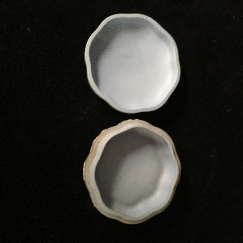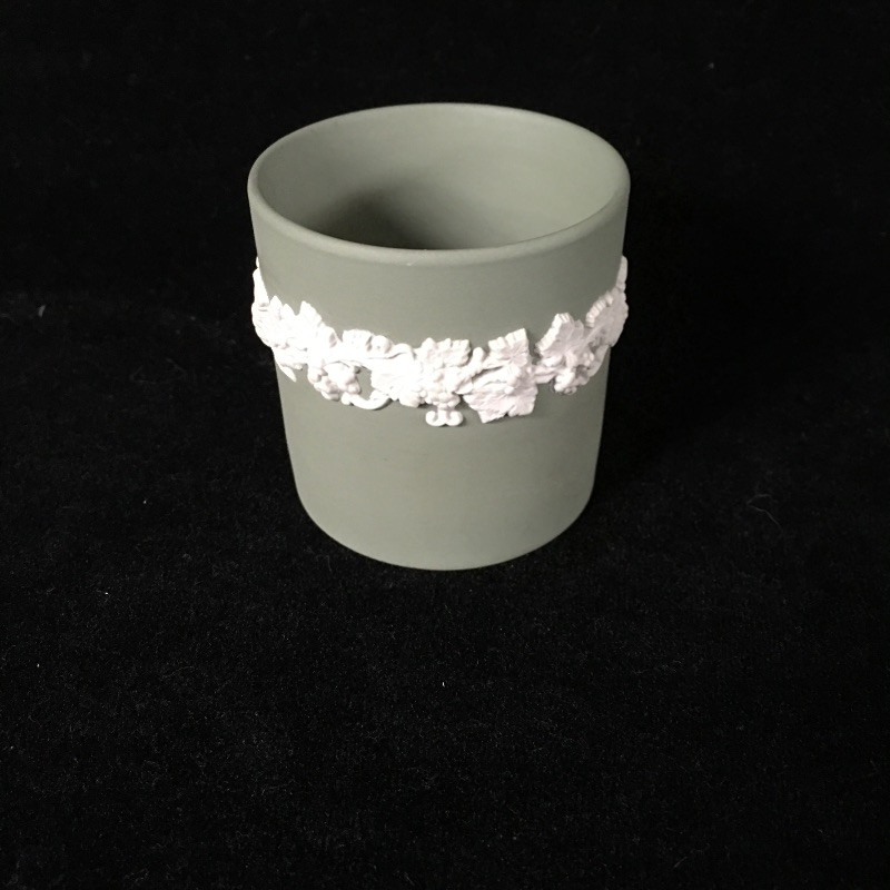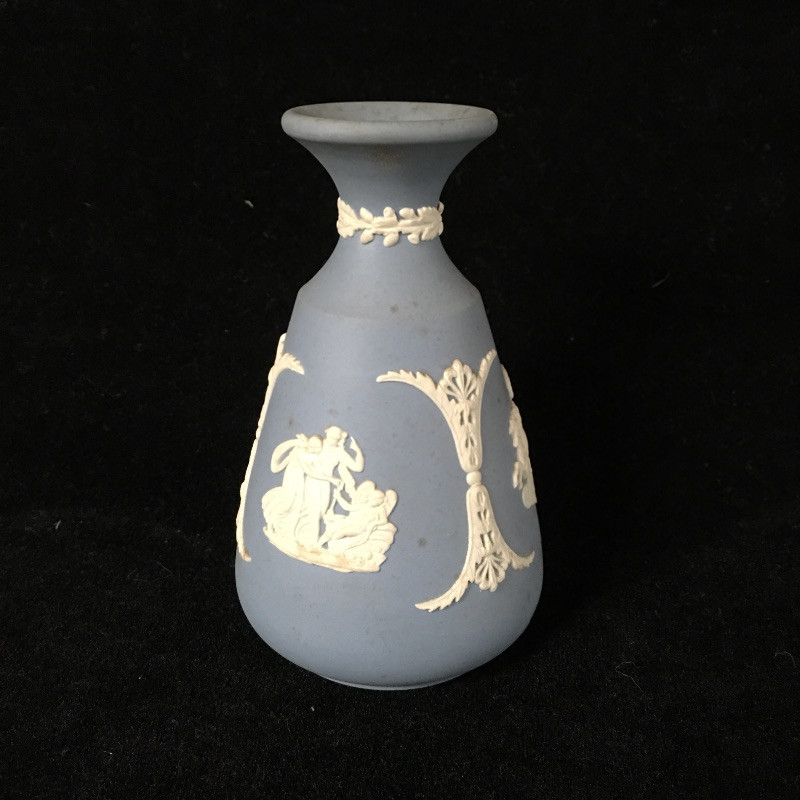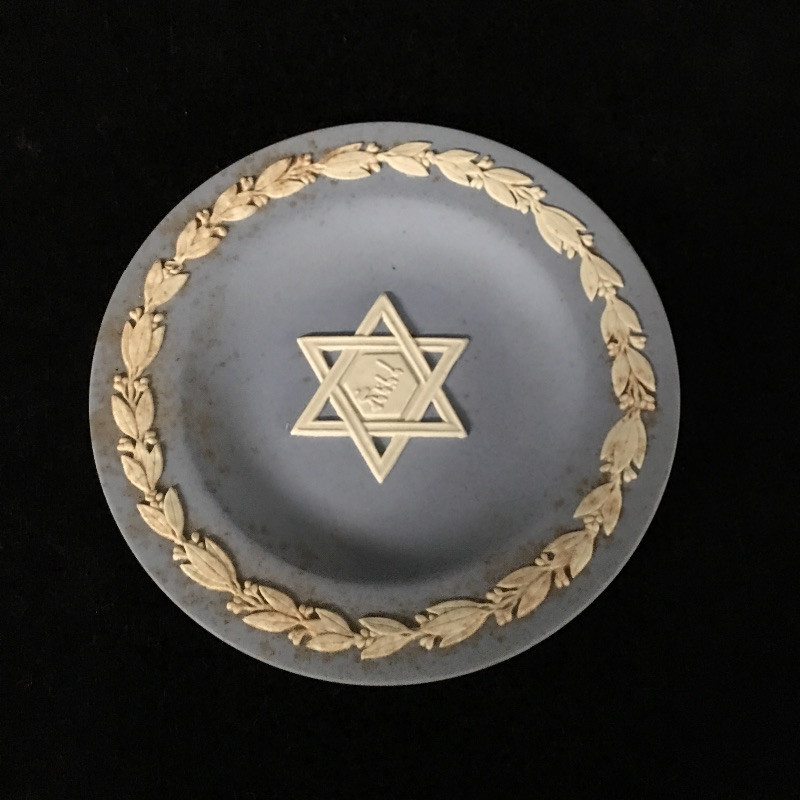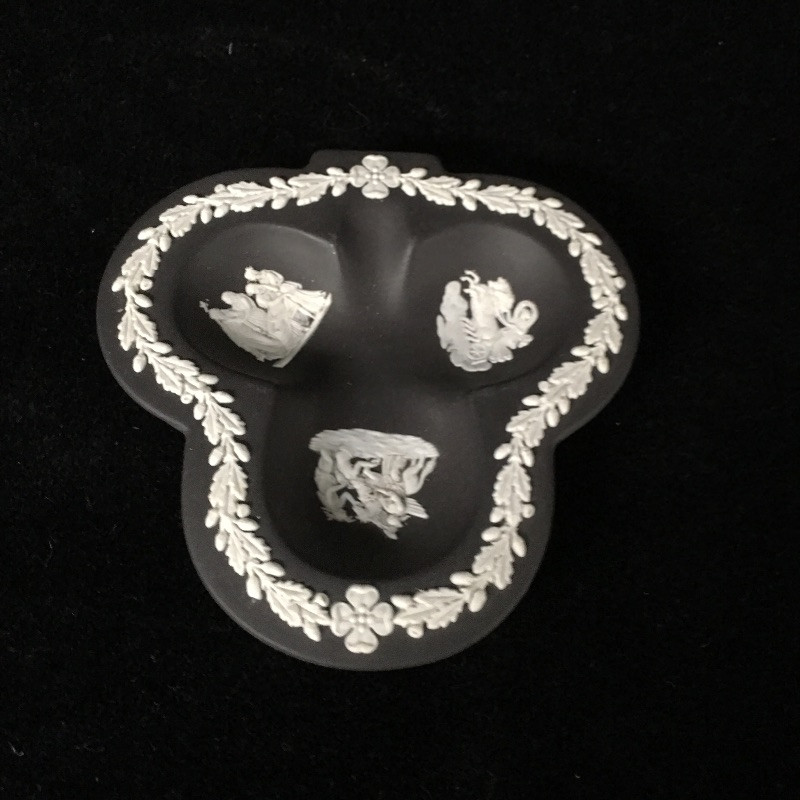 Array of Wedgewood including four small plates, one oval plate, covered container and more.