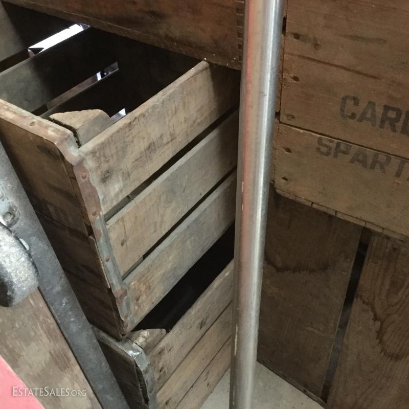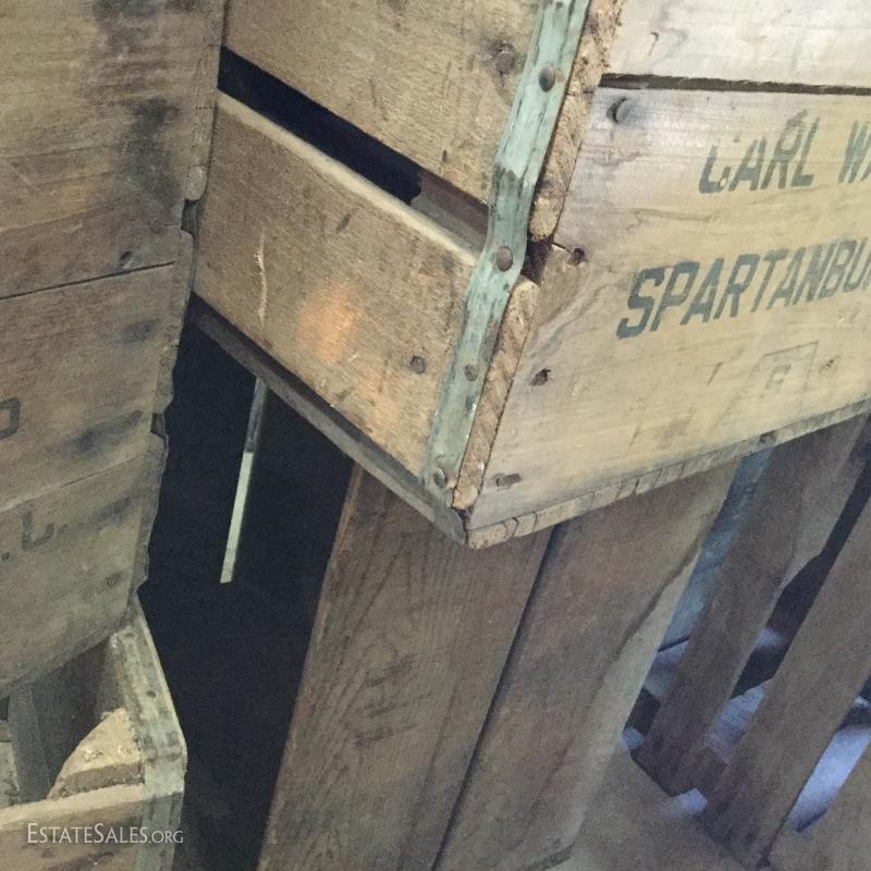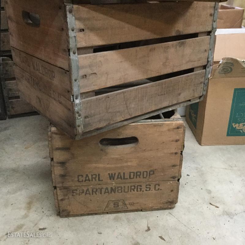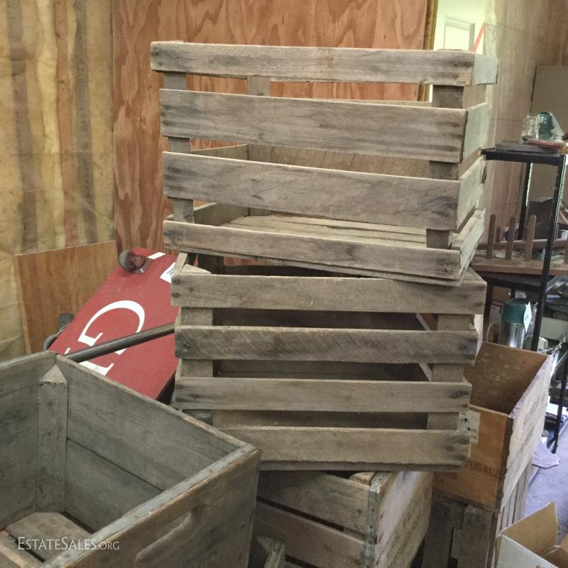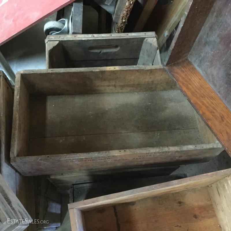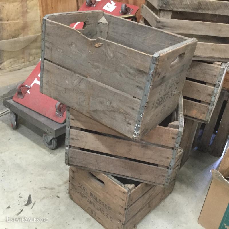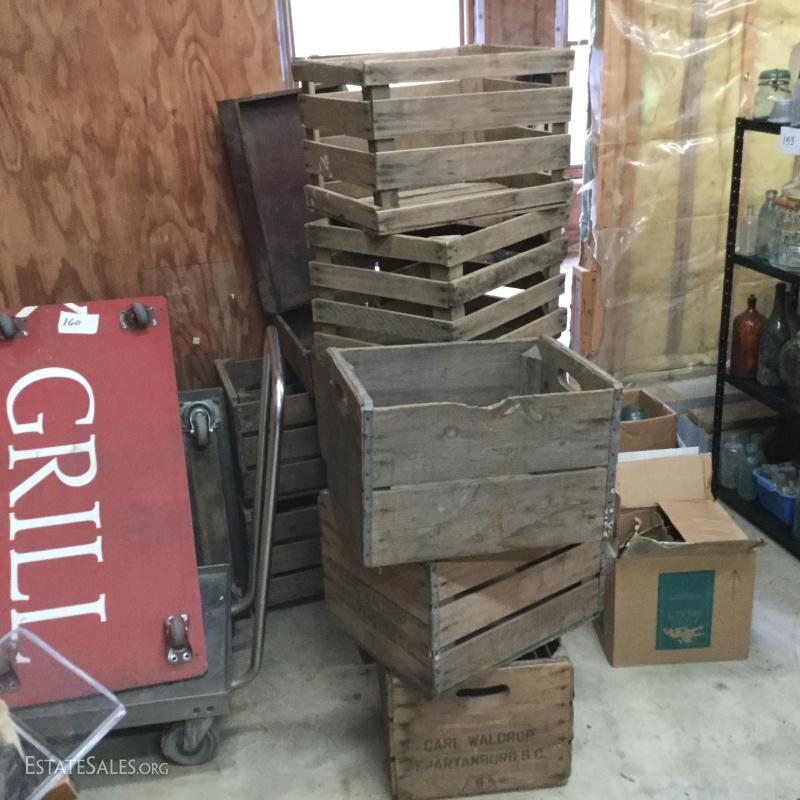 Six crates with logos measuring approx. 18"lx14"wx12"h, and five slatted crates measuring 19"lx15"wx15"h. Misc. small wood boxes. This lot is available for local pick up only in Hendersonville, NC.