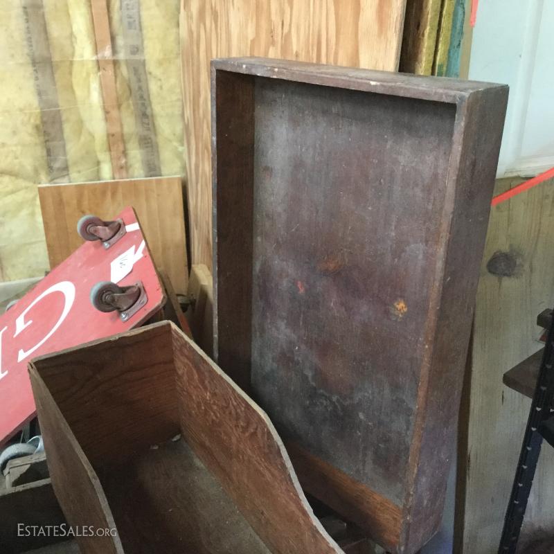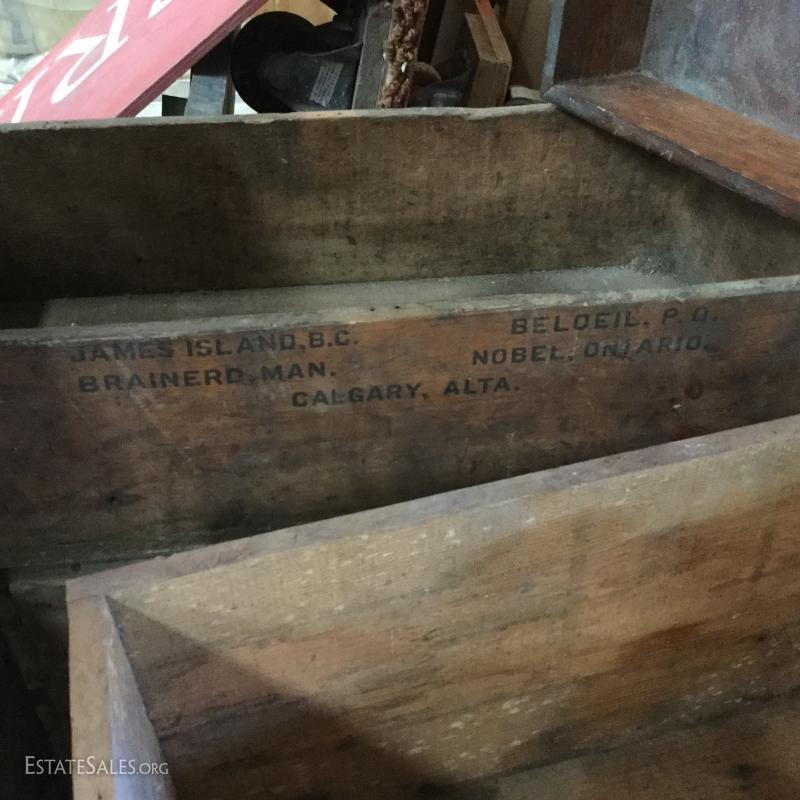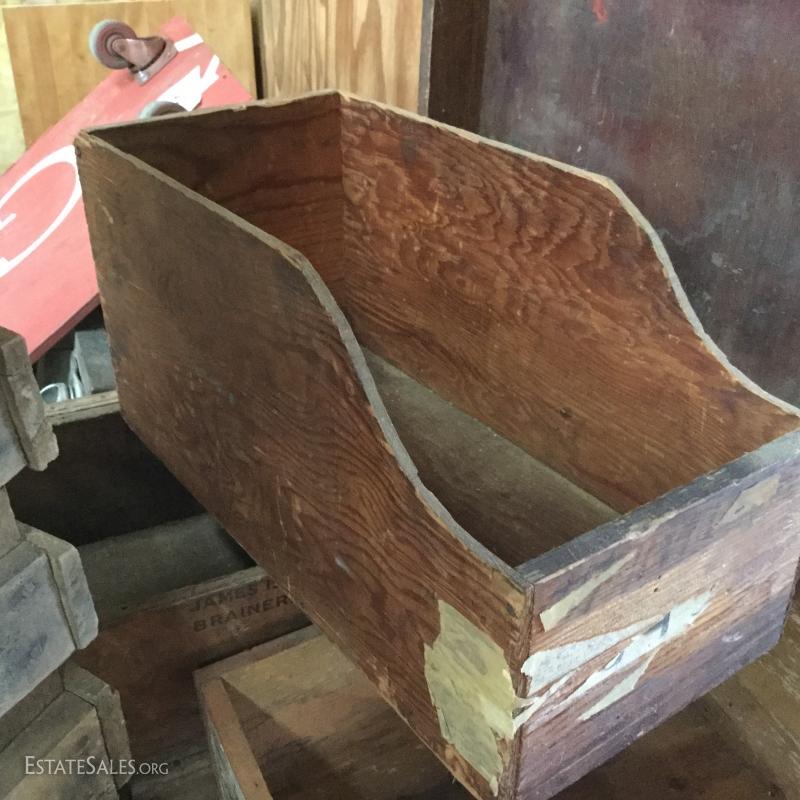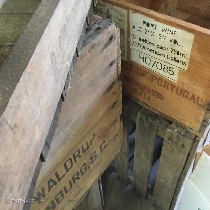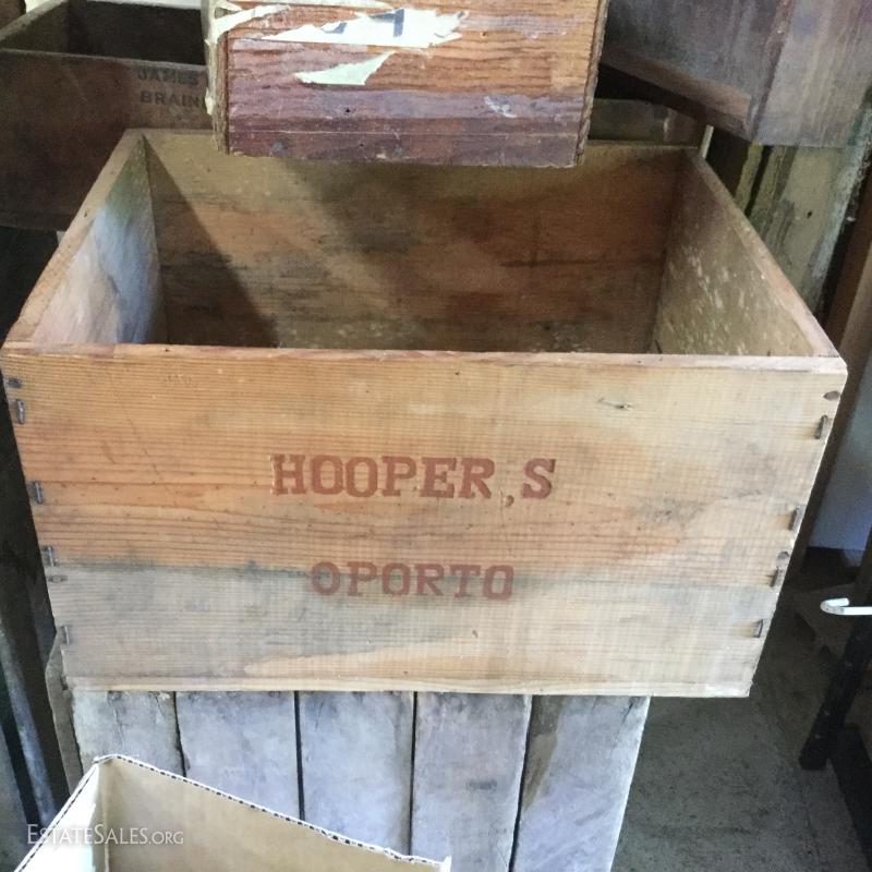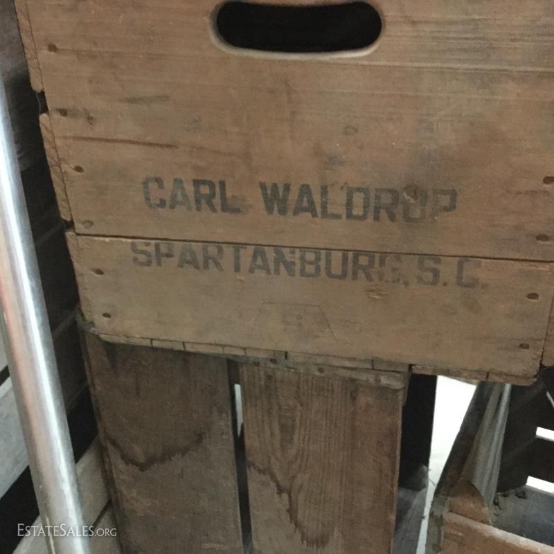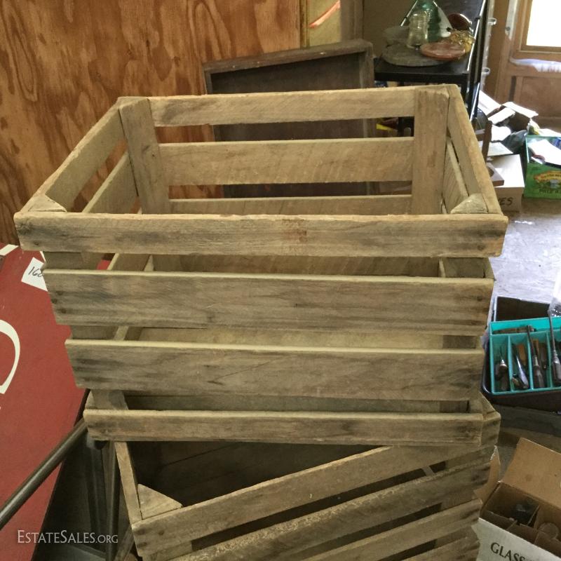Six crates with logos measuring approx. 18"lx14"wx12"h, and five slatted crates measuring 19"lx15"wx15"h. Misc. small wood boxes. This lot is available for local pick up only in Hendersonville, NC.