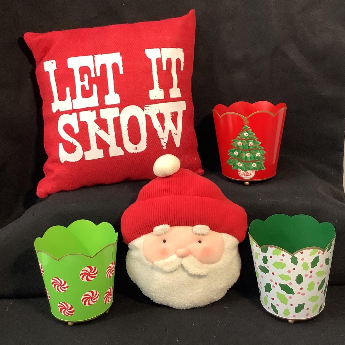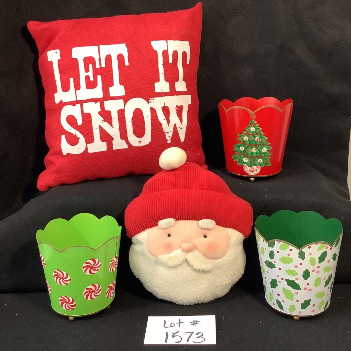 Lot 1573  Two Christmas Decorative throw Pillows & Three Tin Miniature Waste Cans