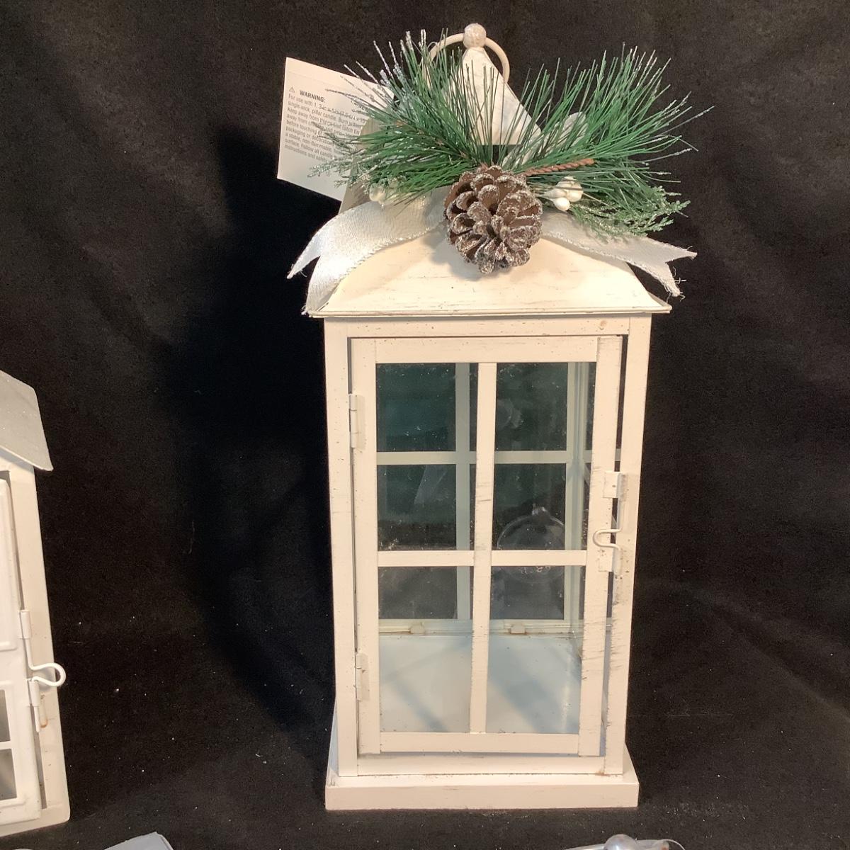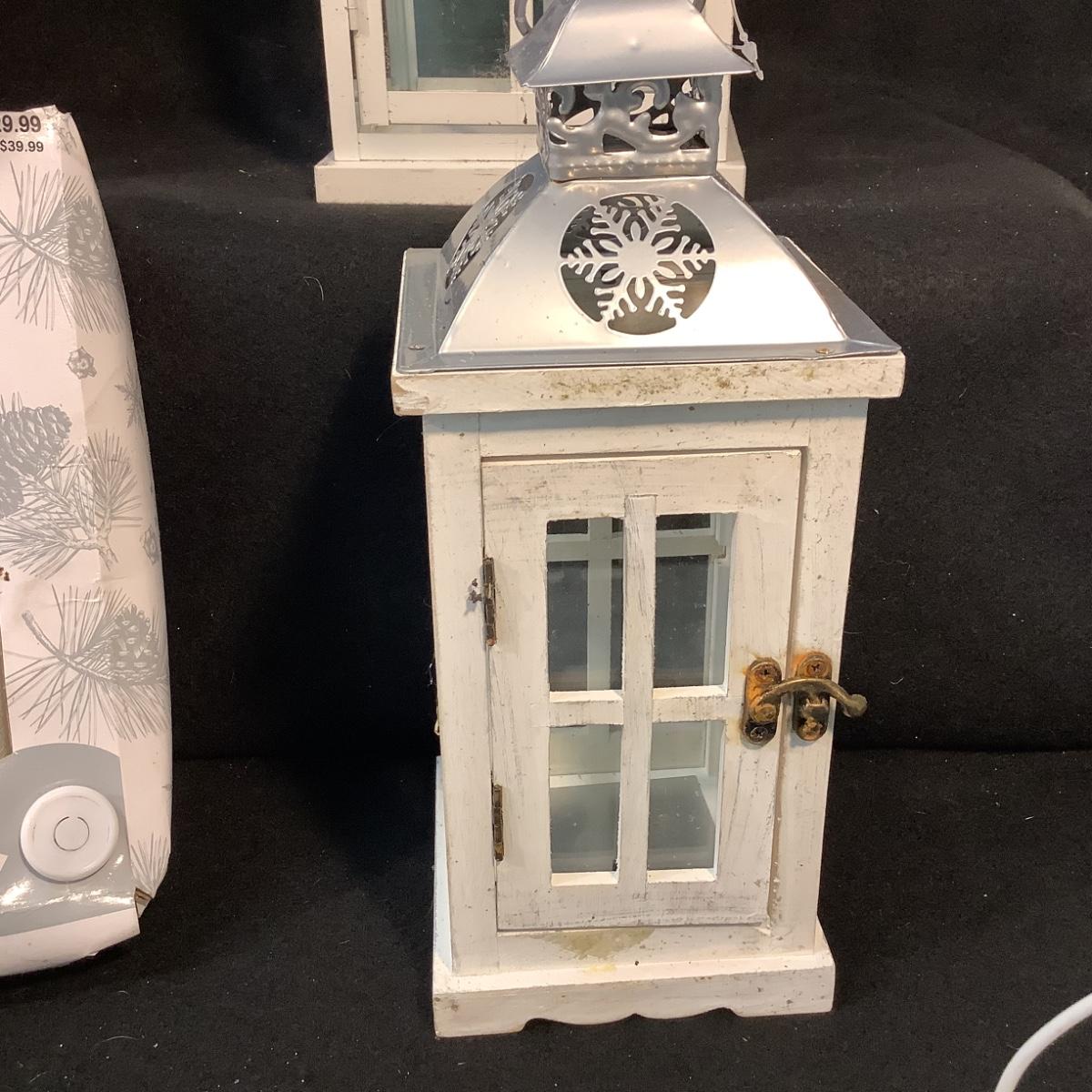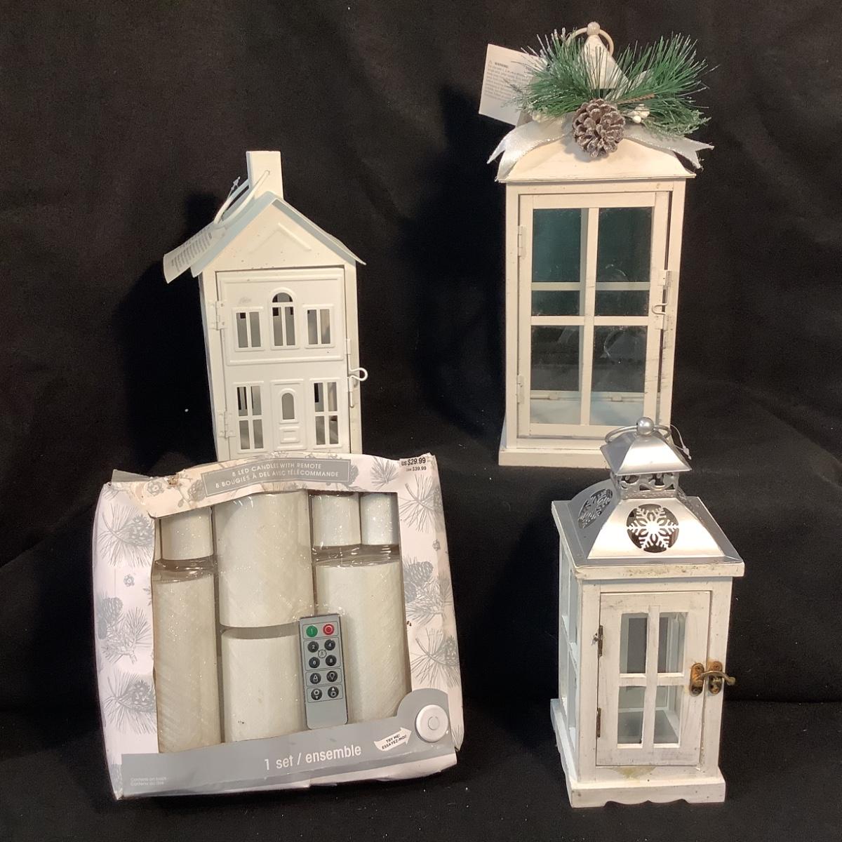 Lot 1578  Three White HolidayLanterns & White Candle Set with Remote