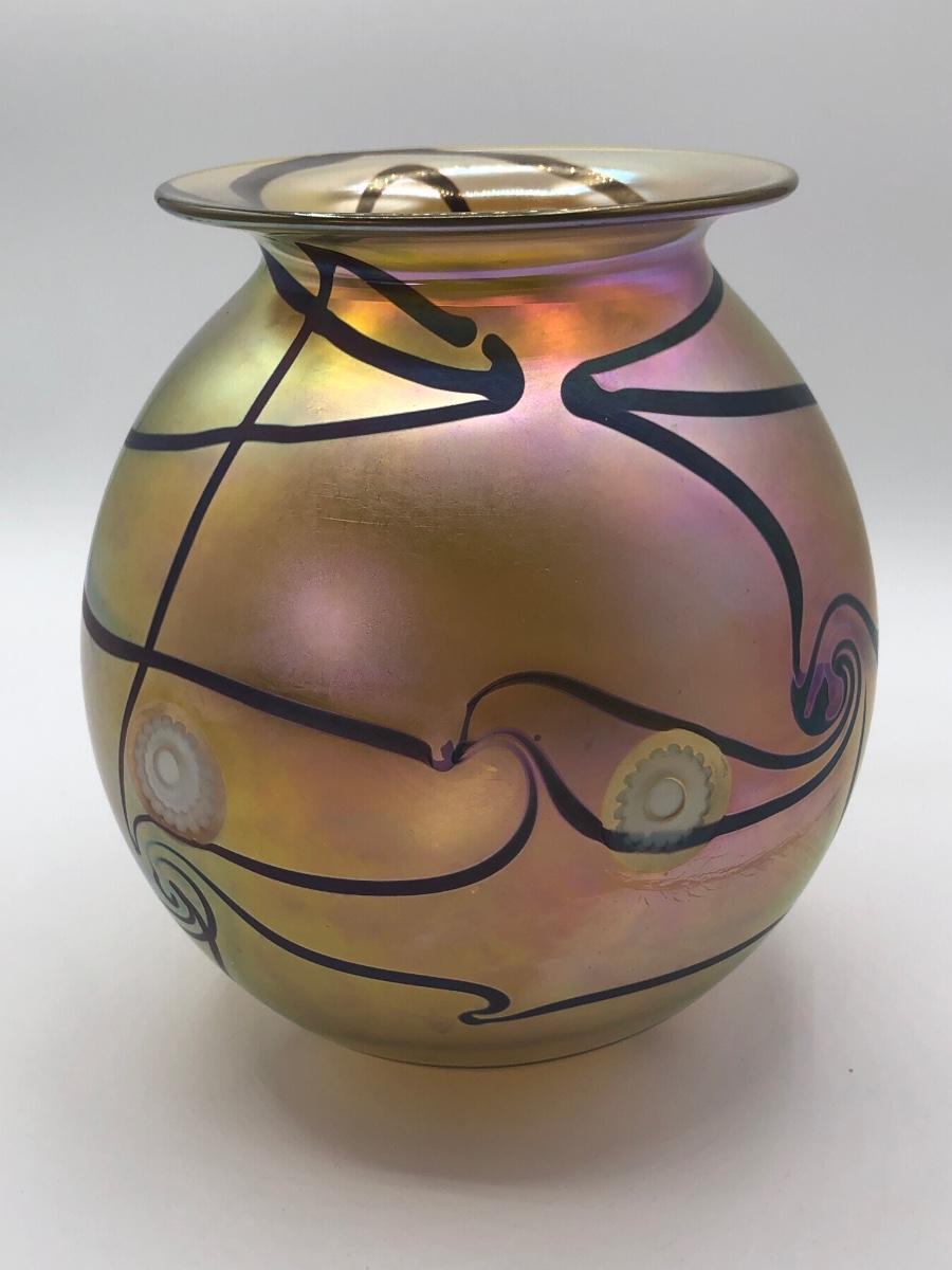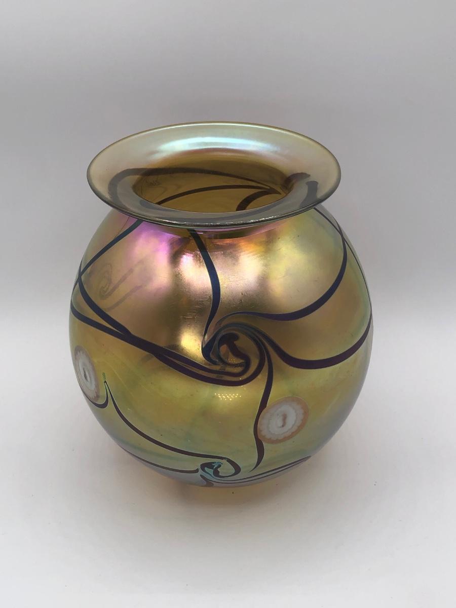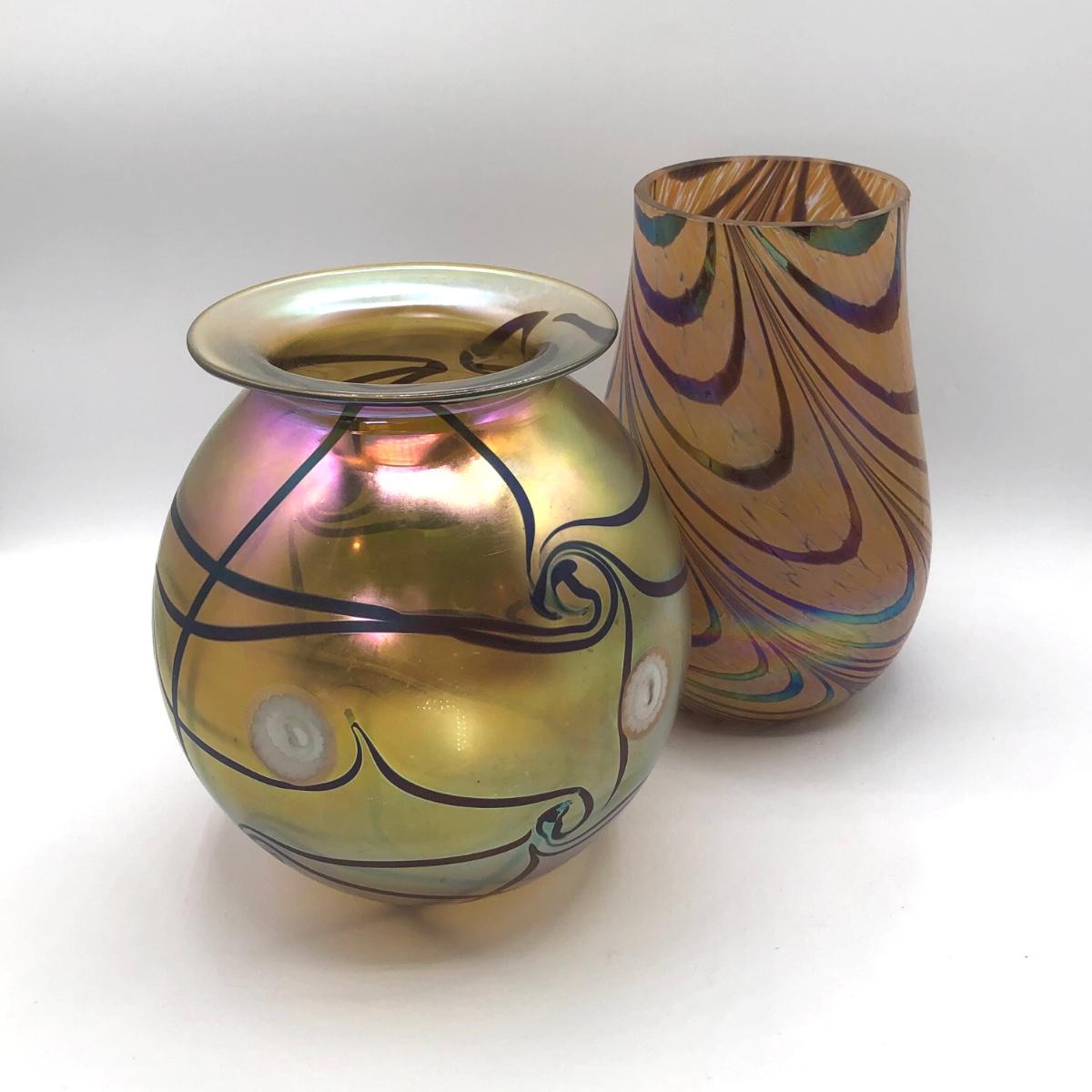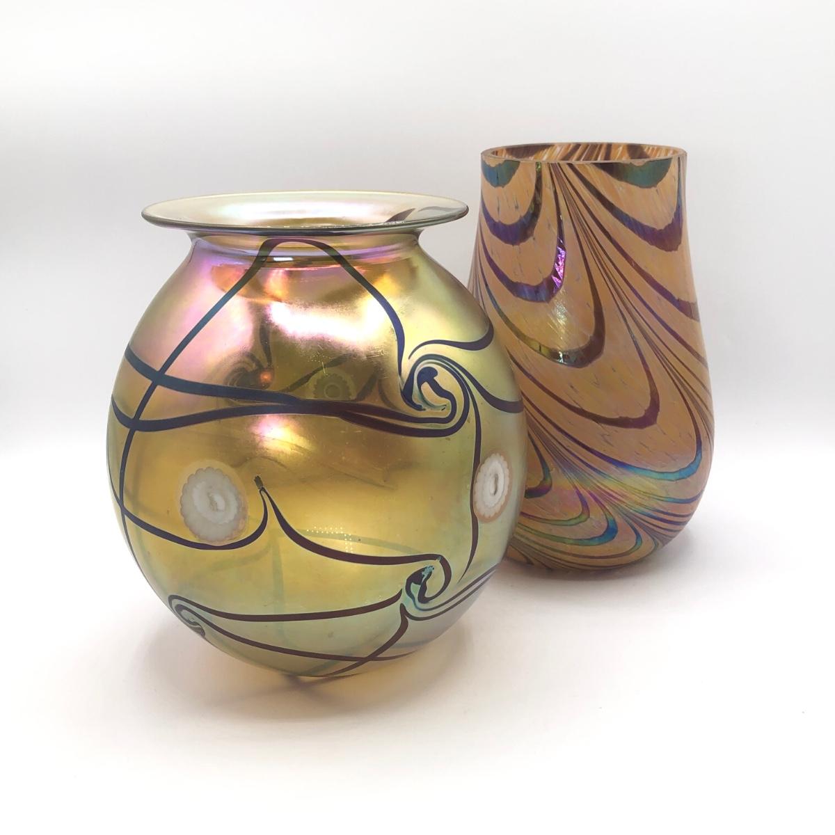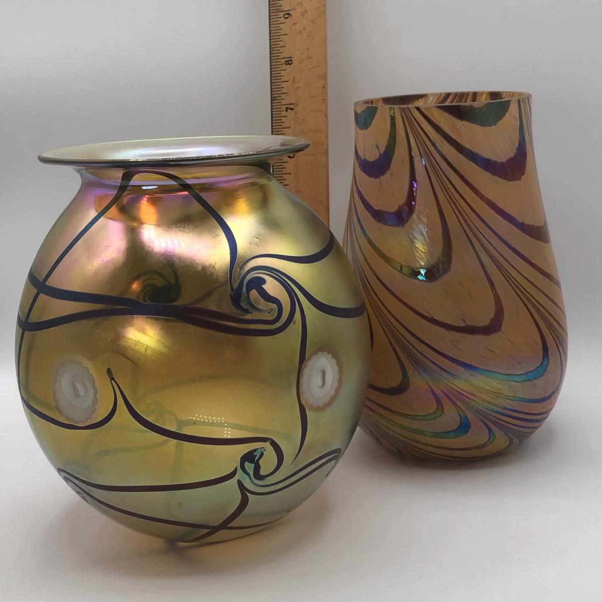 LOT 157F: Signed Robert Eickholt Iridescent Lustre Ribbon Vase & Art Glass Iridescent Swirl Vase