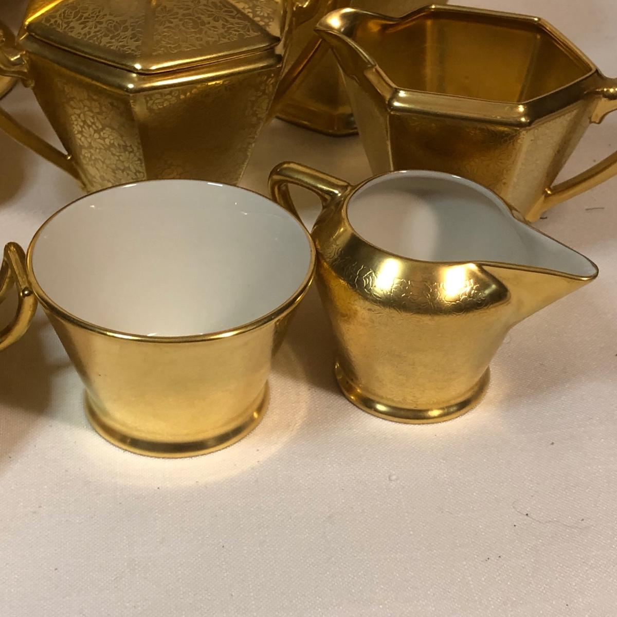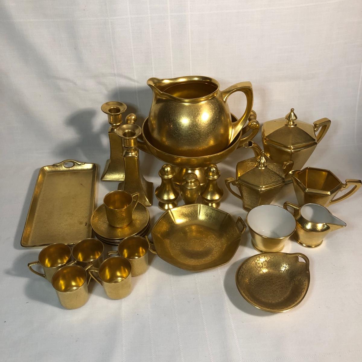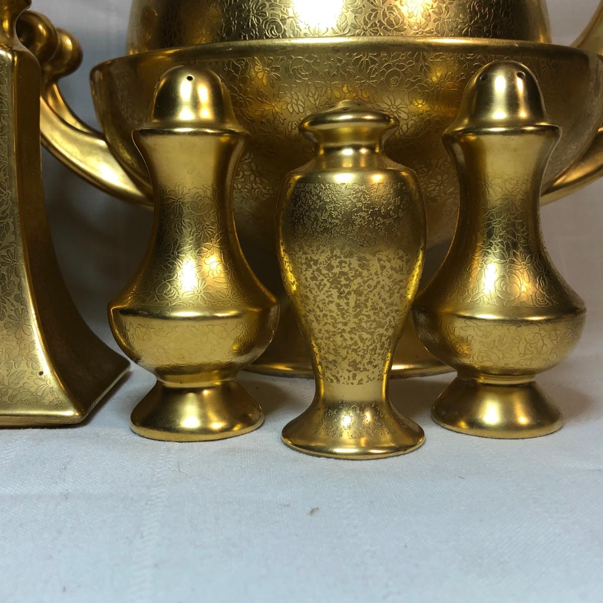 Includes 6 tea cups, 5 saucers, 3 spice shakers, tea pot with matching sugar bowl & creamer, pitcher, 2 candlesticks & more.
