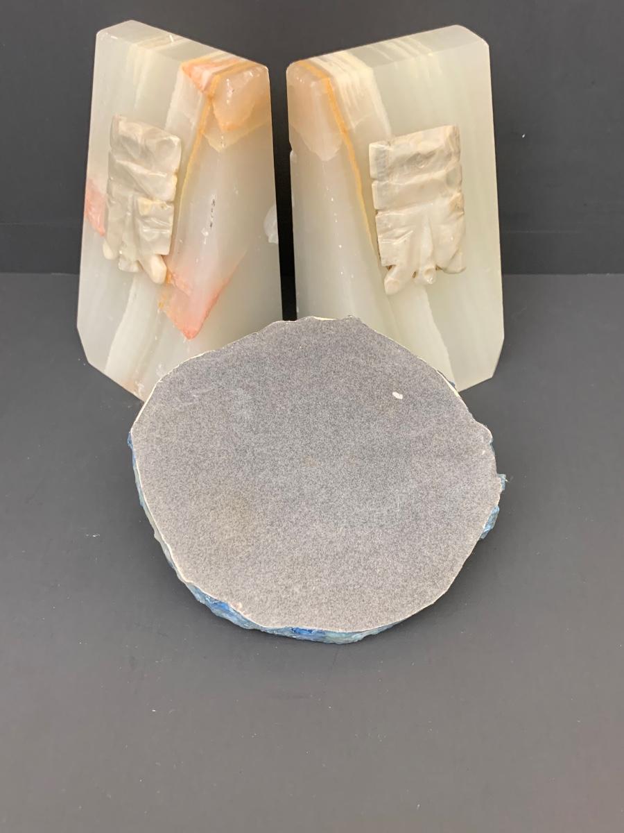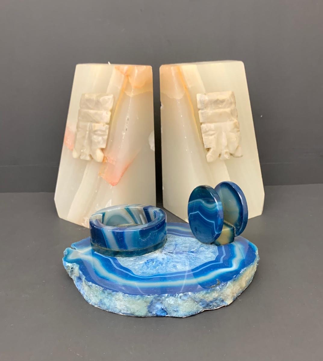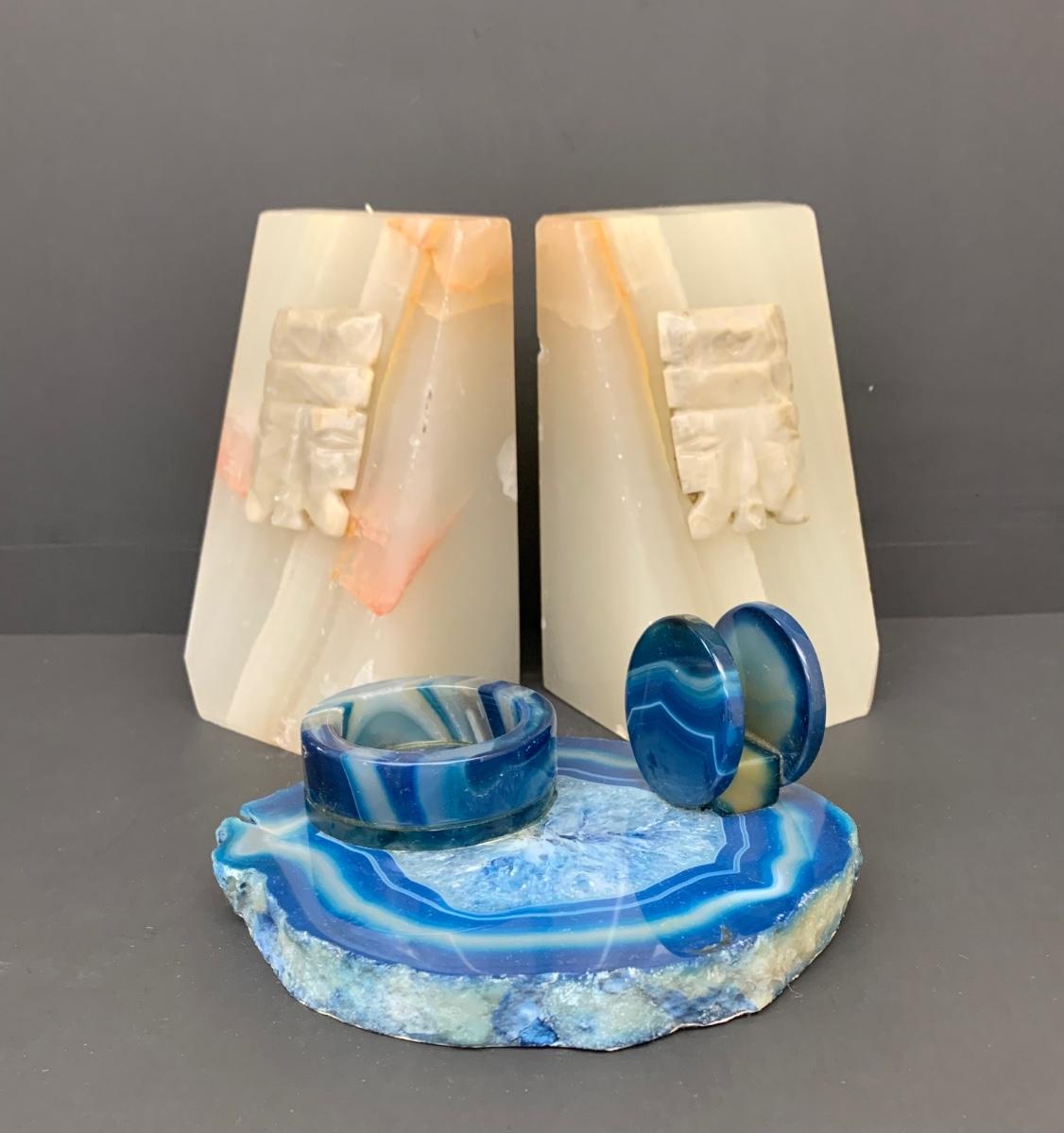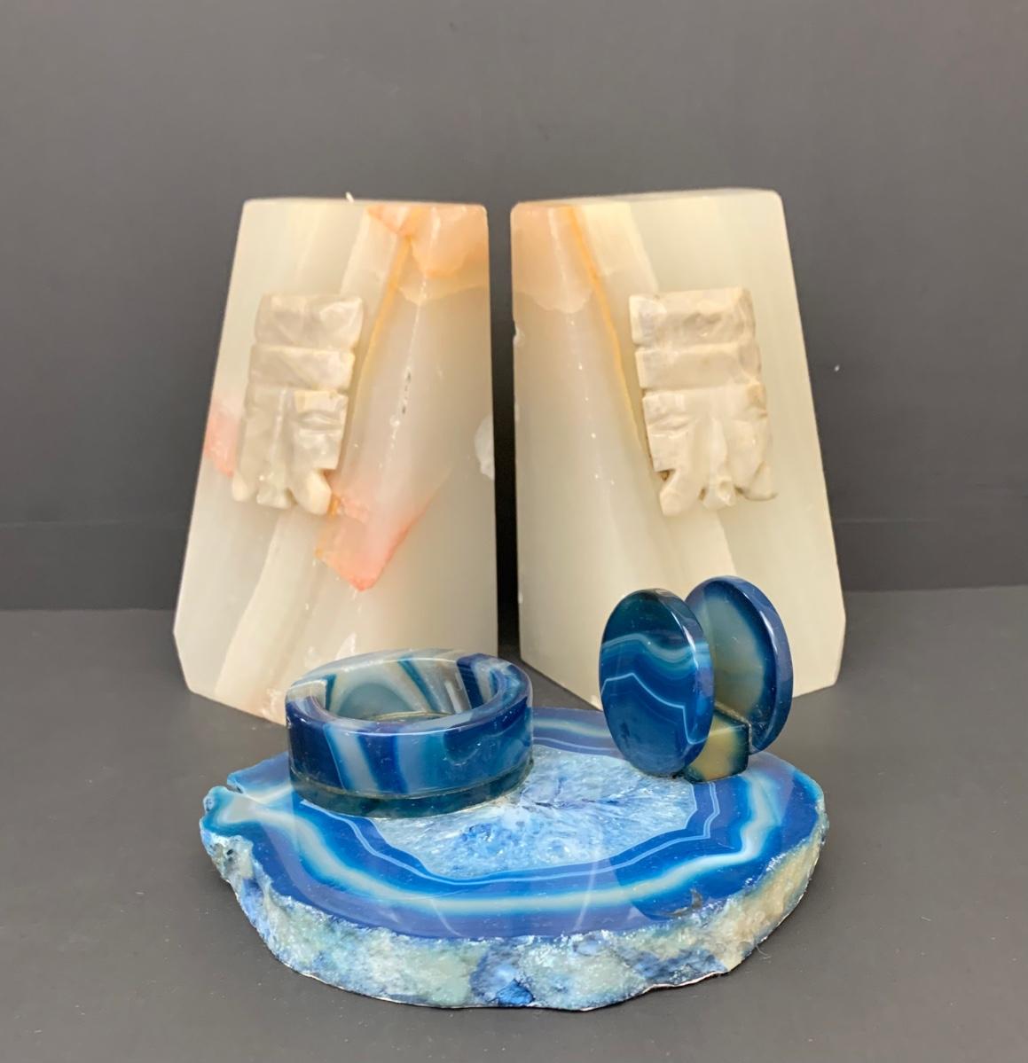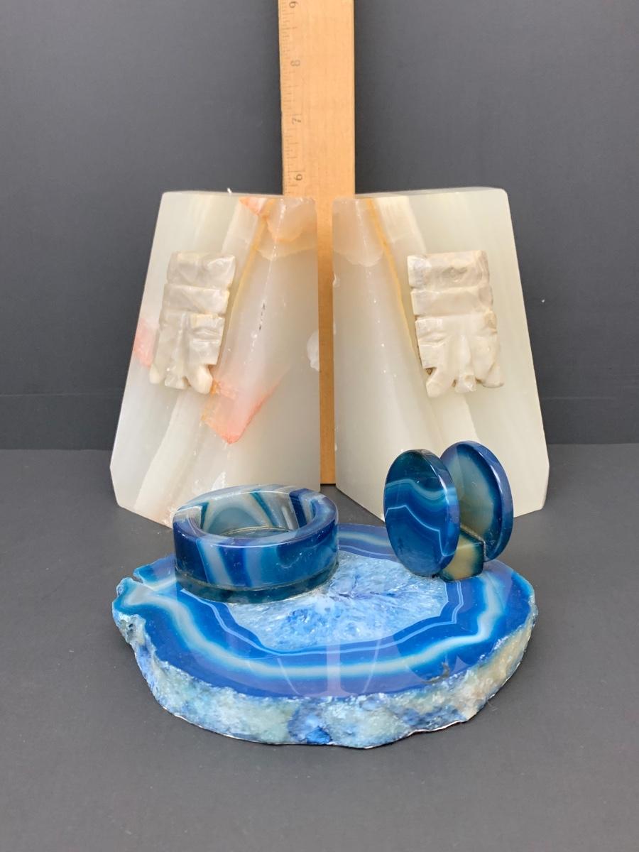 Lot 157R: Vintage Marble Bookends & Polished Blue Agate Desk Piece