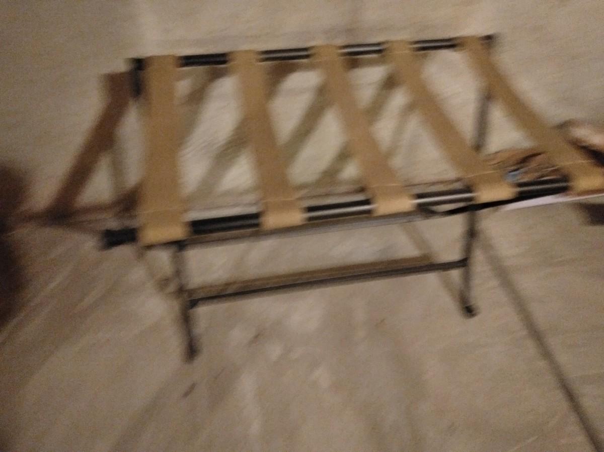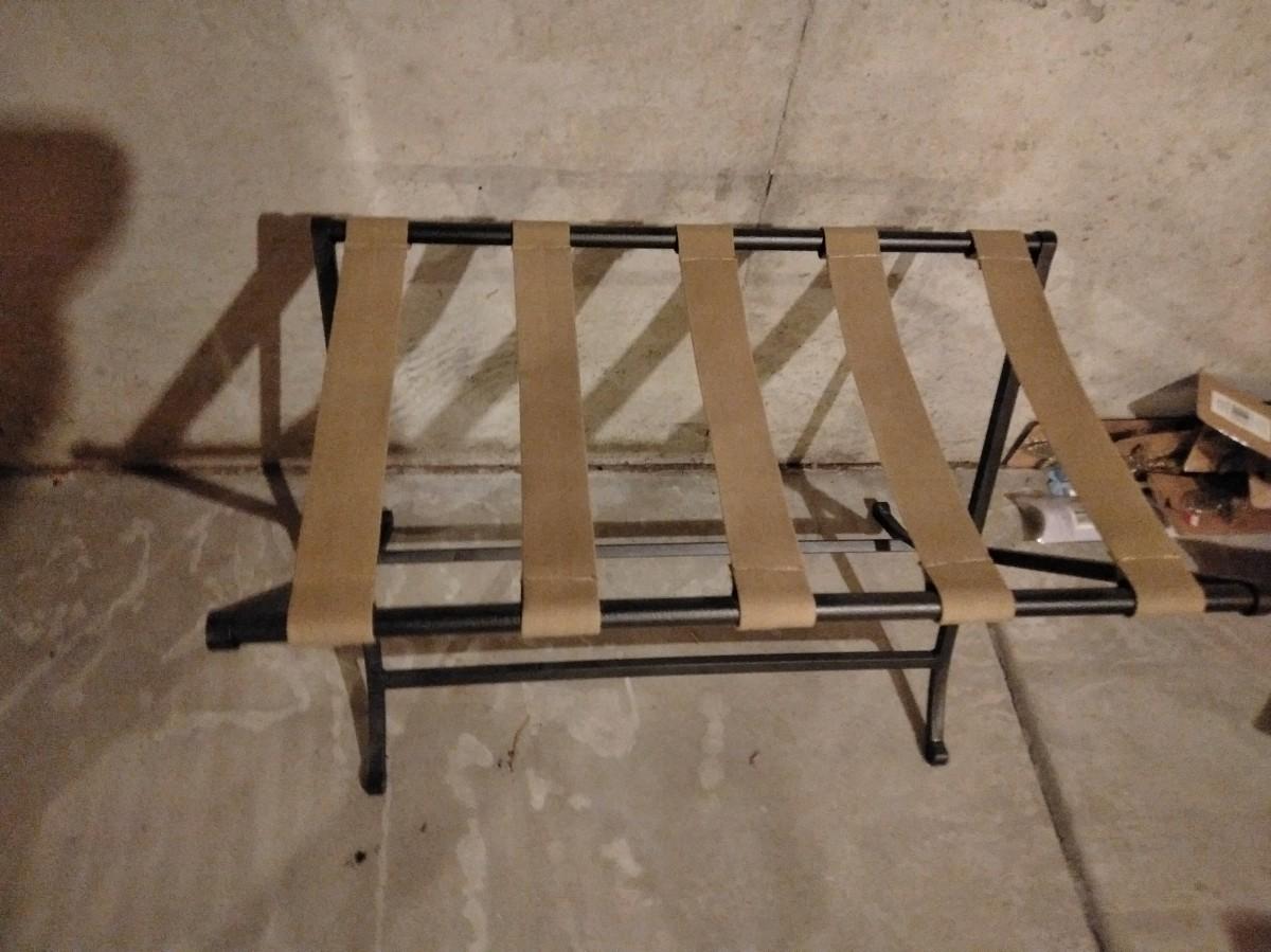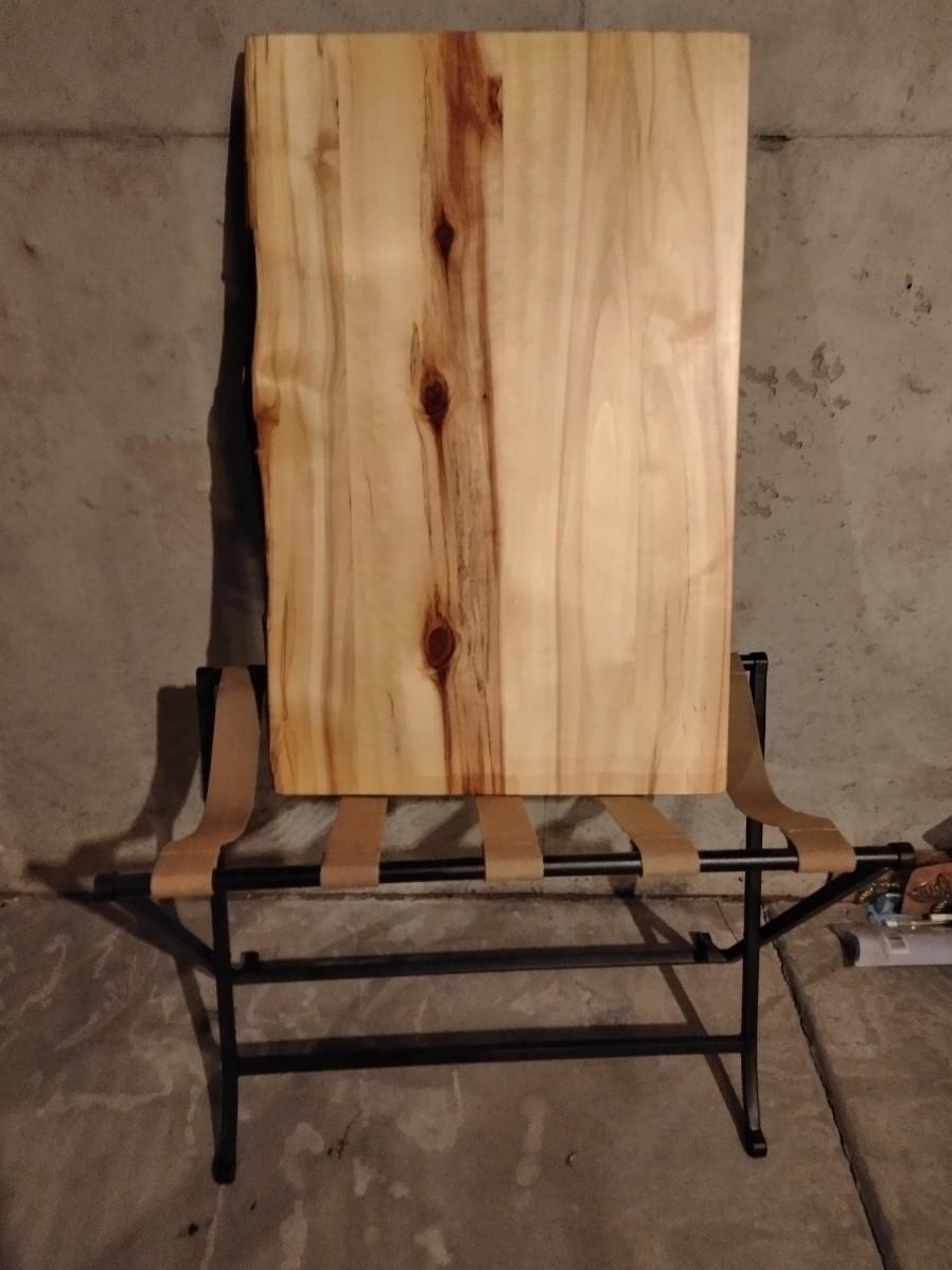 LUGGAGE RACK - TURNED TABLE. BEAUTIFUL PIECE OF PINE WOOD SLAB CUT TO FIT ON A LUGGAGE RACK. WOOD IS NOT ATTATCHED. LUGGAGE RACK FOLDS UP.