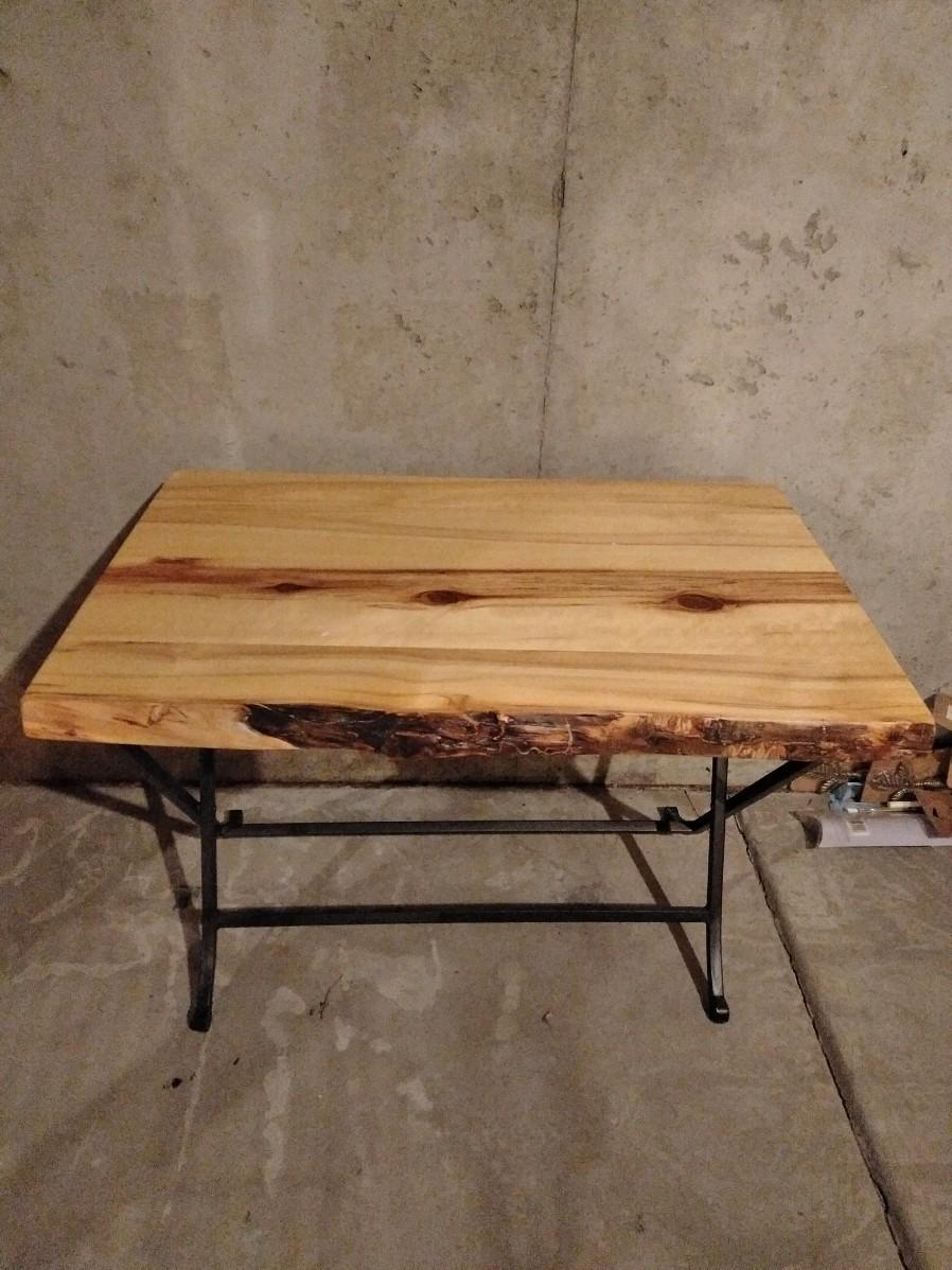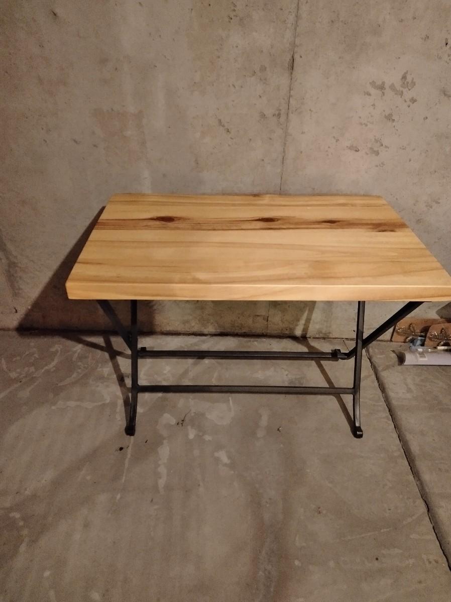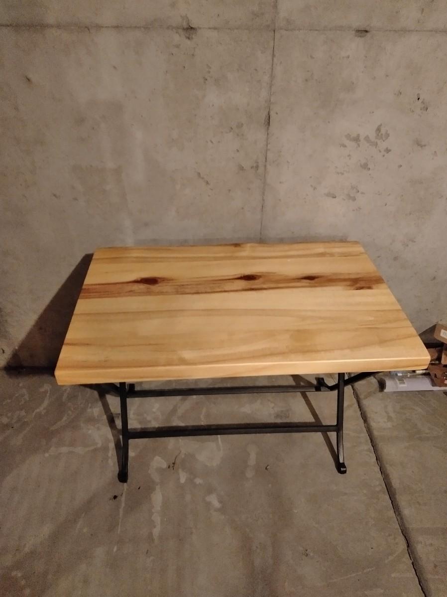 LUGGAGE RACK - TURNED TABLE. BEAUTIFUL PIECE OF PINE WOOD SLAB CUT TO FIT ON A LUGGAGE RACK. WOOD IS NOT ATTATCHED. LUGGAGE RACK FOLDS UP.
