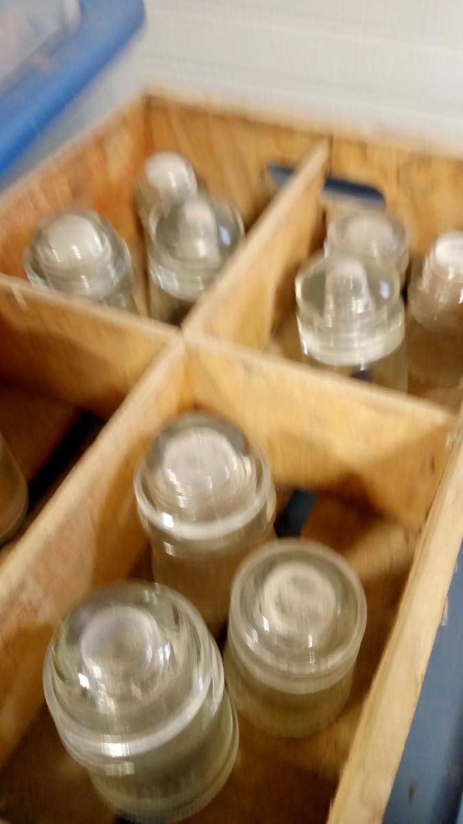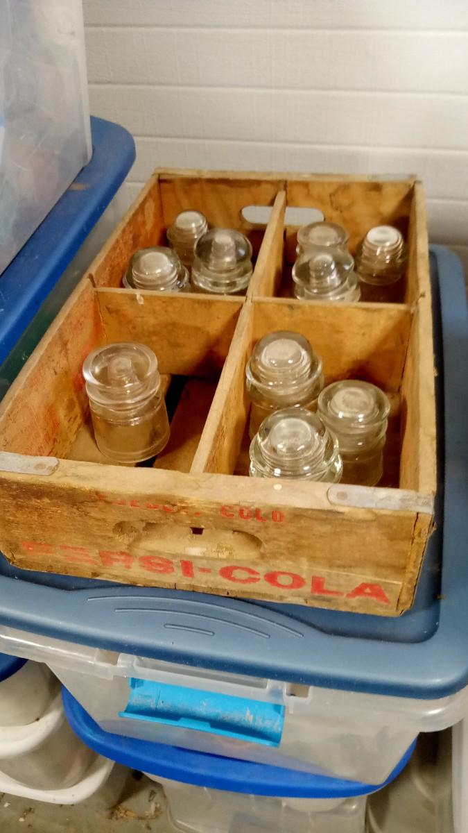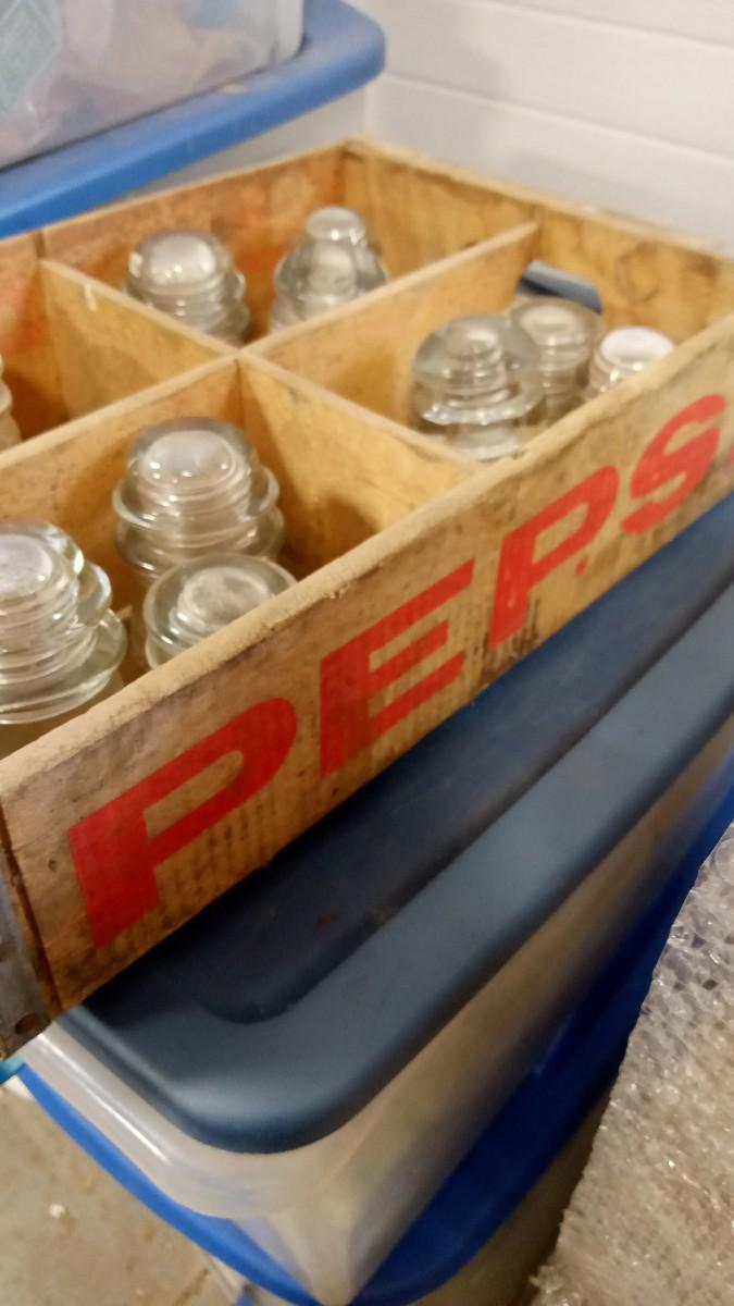 LOT 158 OLD WOOD PEPSI CRATE WITH 10 INSULATERS