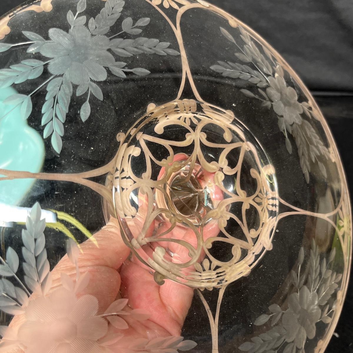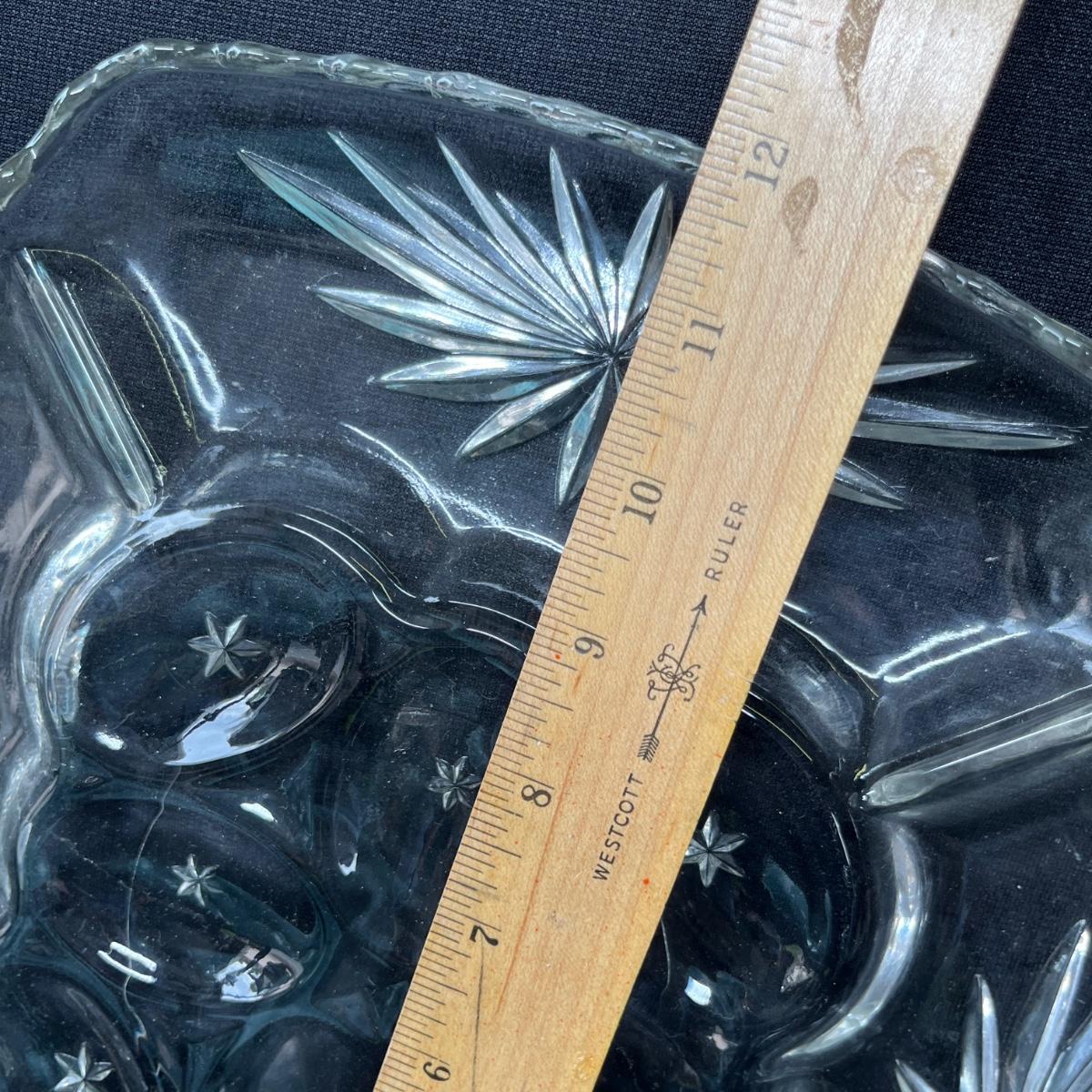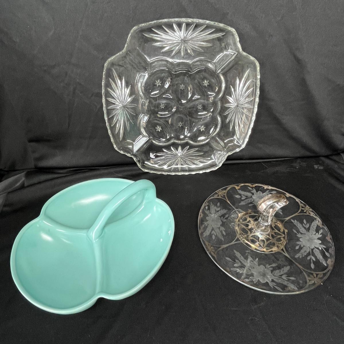 EAPG egg tray, Gladding McBean 3 part blue tray, Silver Overlay sandwich tray. The SO sandwich tray has some wear.