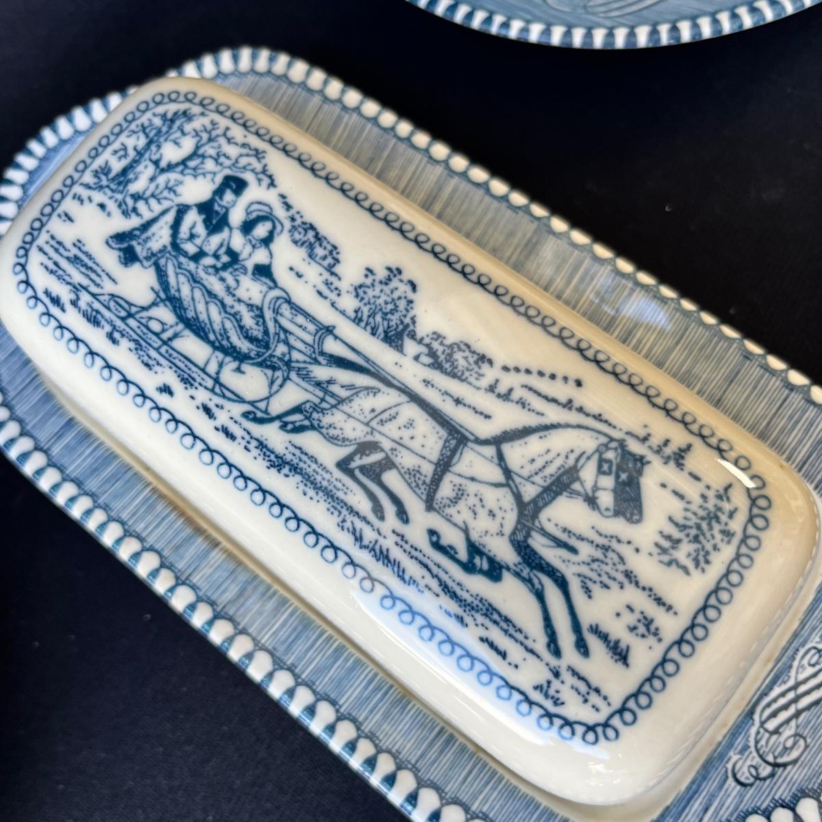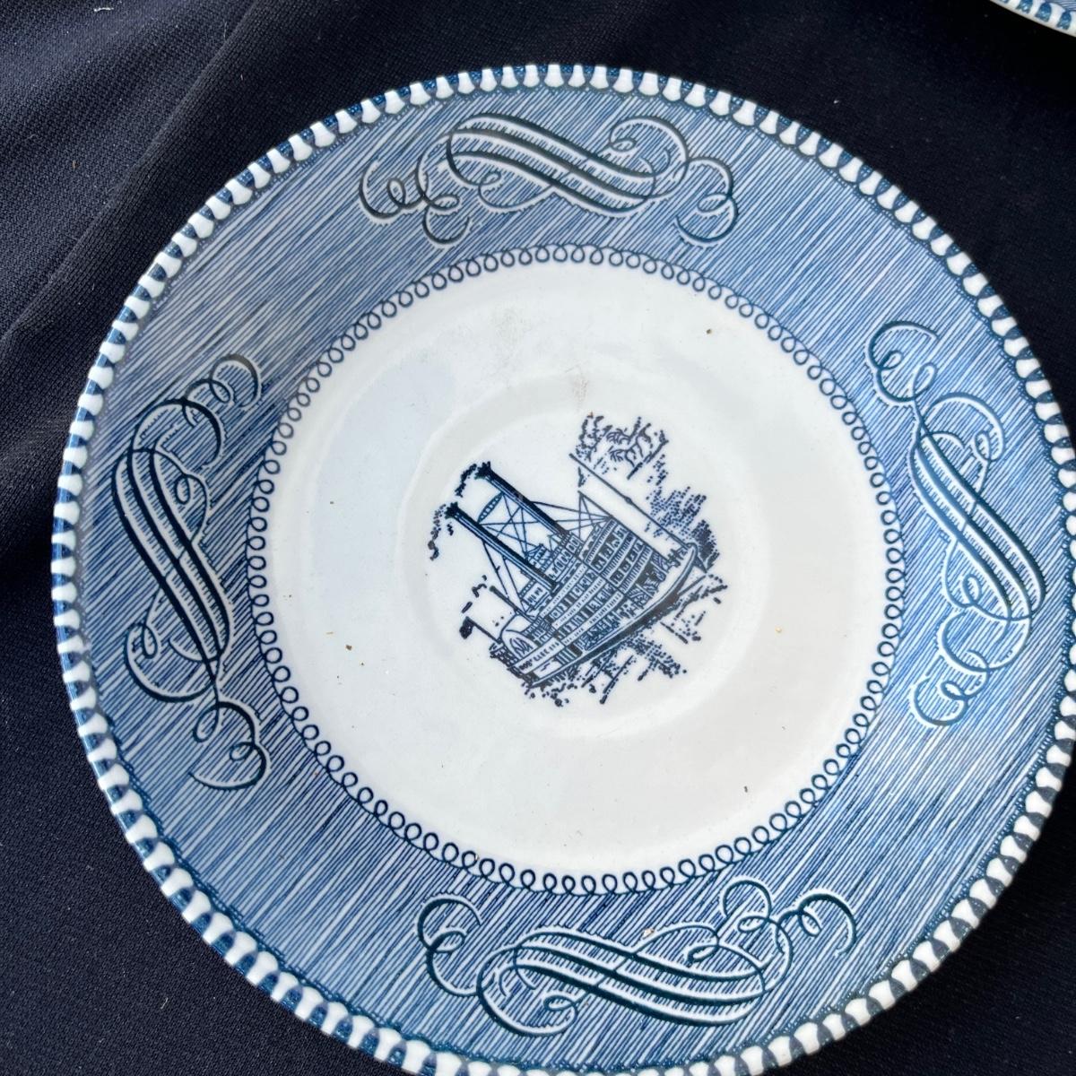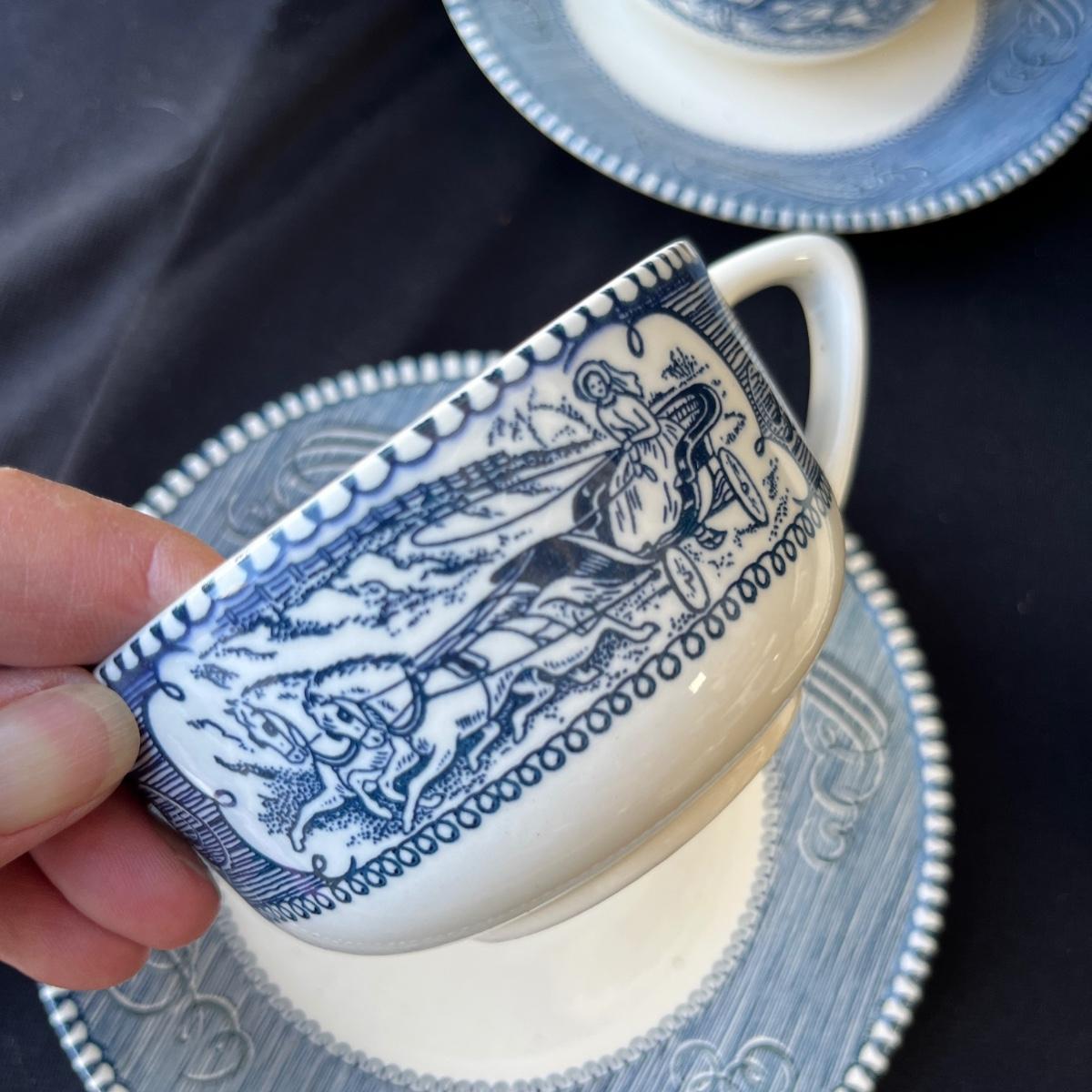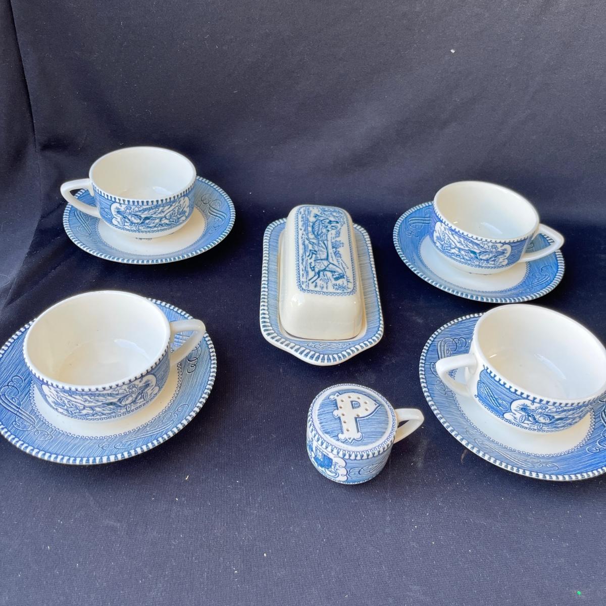 Some wear on the butter dish, no chips. Handle on Pepper has been re-attached. Cups & saucers are in great shape