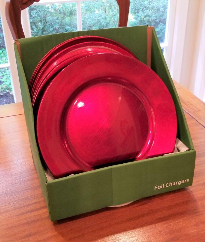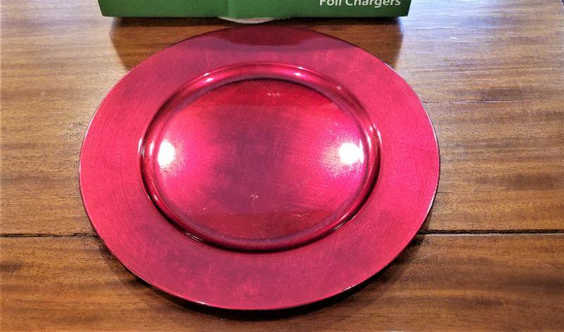 Melamine red pearlized chargers - perfect touch for your holiday table - you get 22 of them. Each measures 13" across.