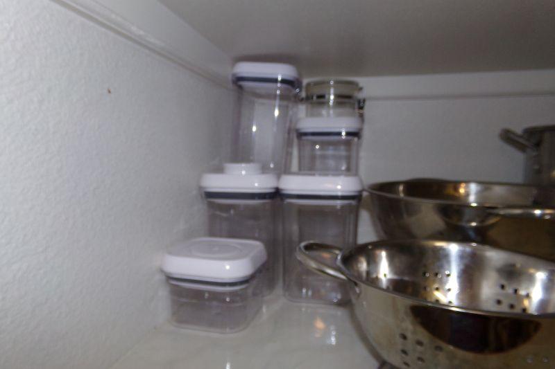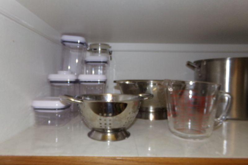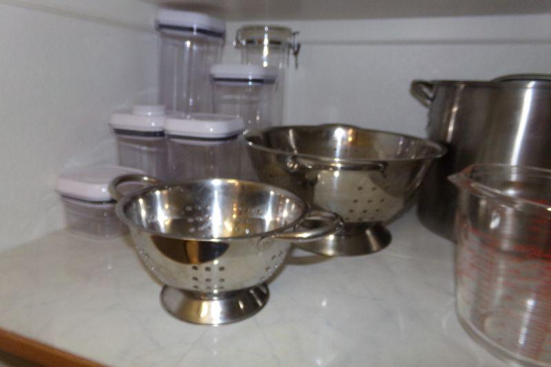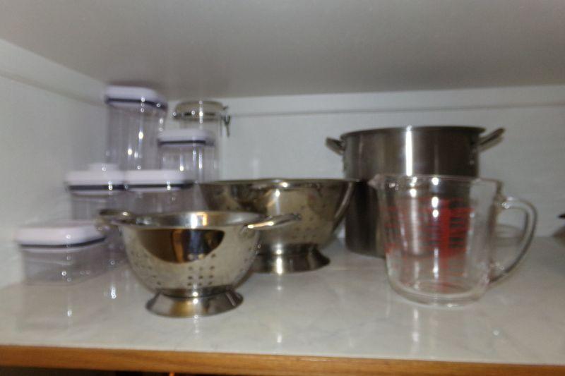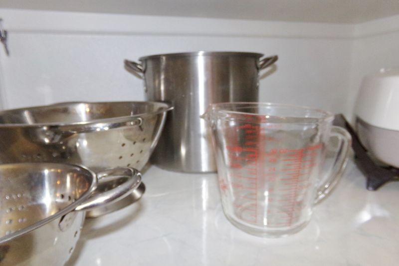 STOCK POT, 2 STAINLESS STEEL STRAINERS, MEASURING CUP AND PLASTIC FOOD STORAGE CONTAINERS