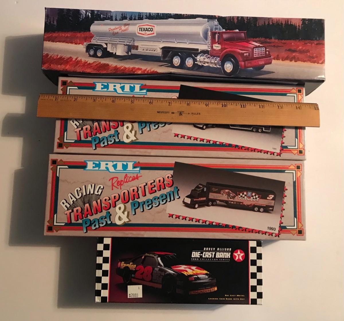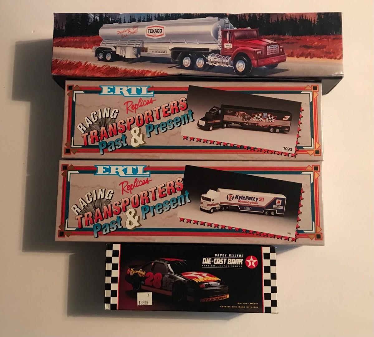 Collection of vintage car and truck replica collectibles in cluding racing trucks by Ertl, Texaco advertising collectible truck and NASCAR bank. Boxes show some wear and damage - see photos. The pictures show condition, measurements if taken, and what is included in the lot. Due to the large amount that we photograph and the time frame, we are not always able to take measurements. All items unless noted, are pre-owned and have been used. If you purchased furniture, you must bring help. We do not allow one person to carry large furniture out on their own. Bring help, tools and a truck for the safety of our client’s homes, and your personal safety. Company policy. Thank you.
