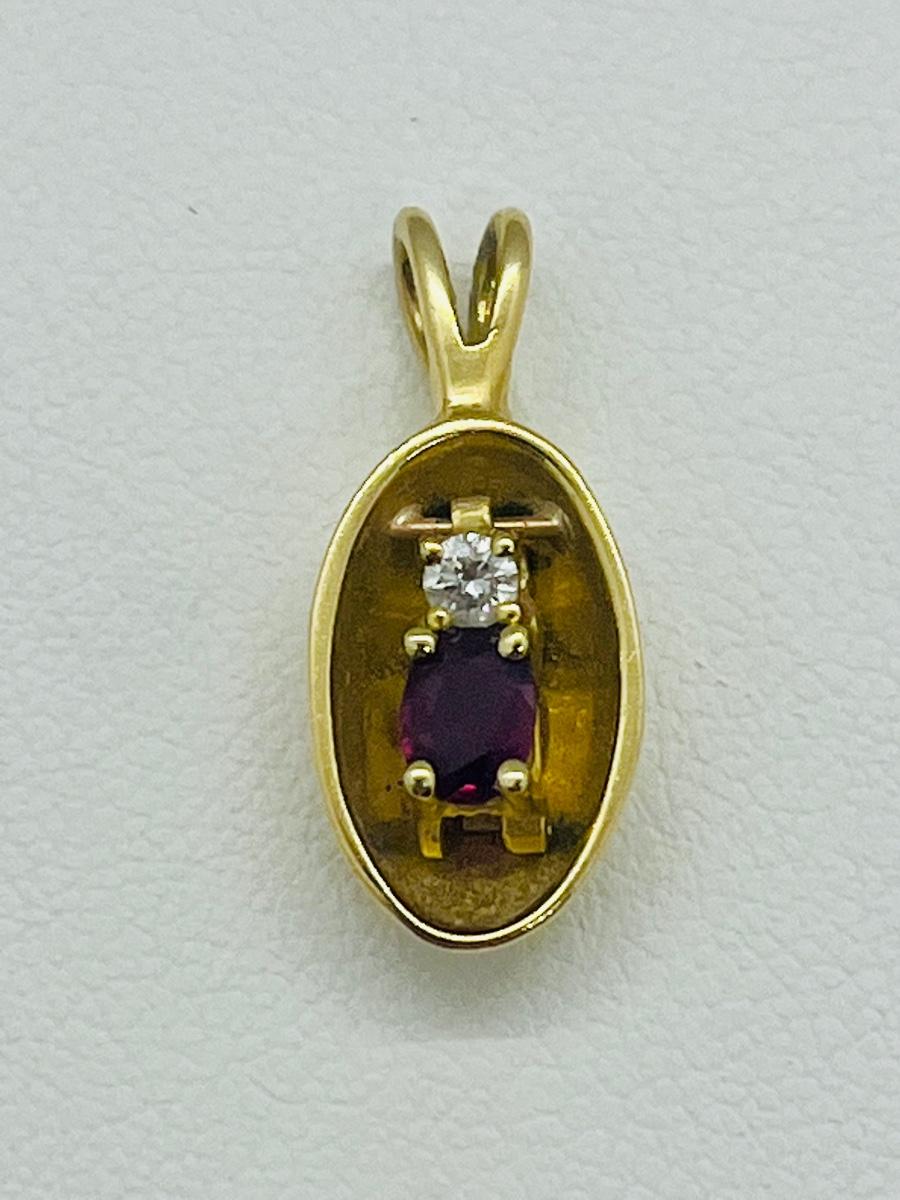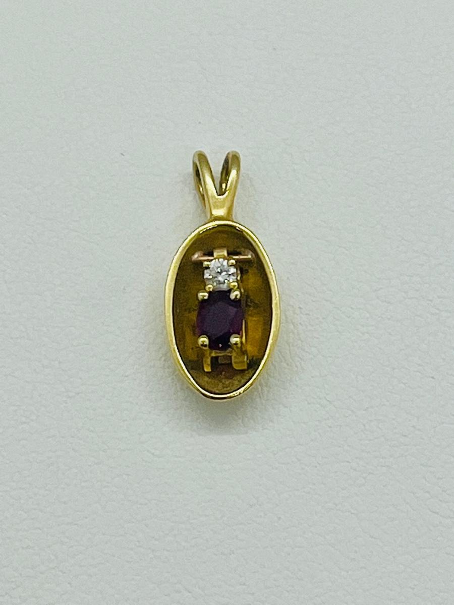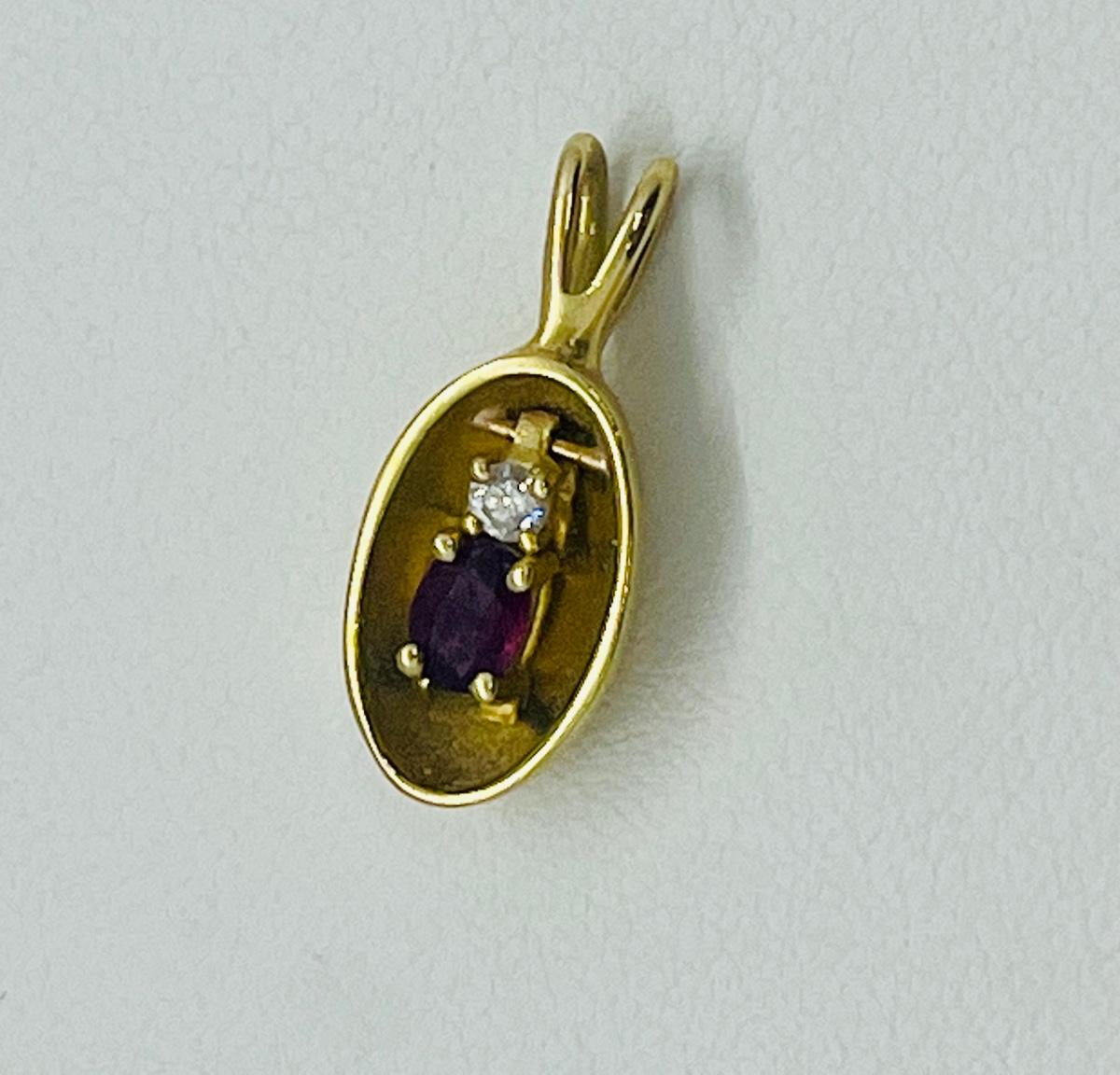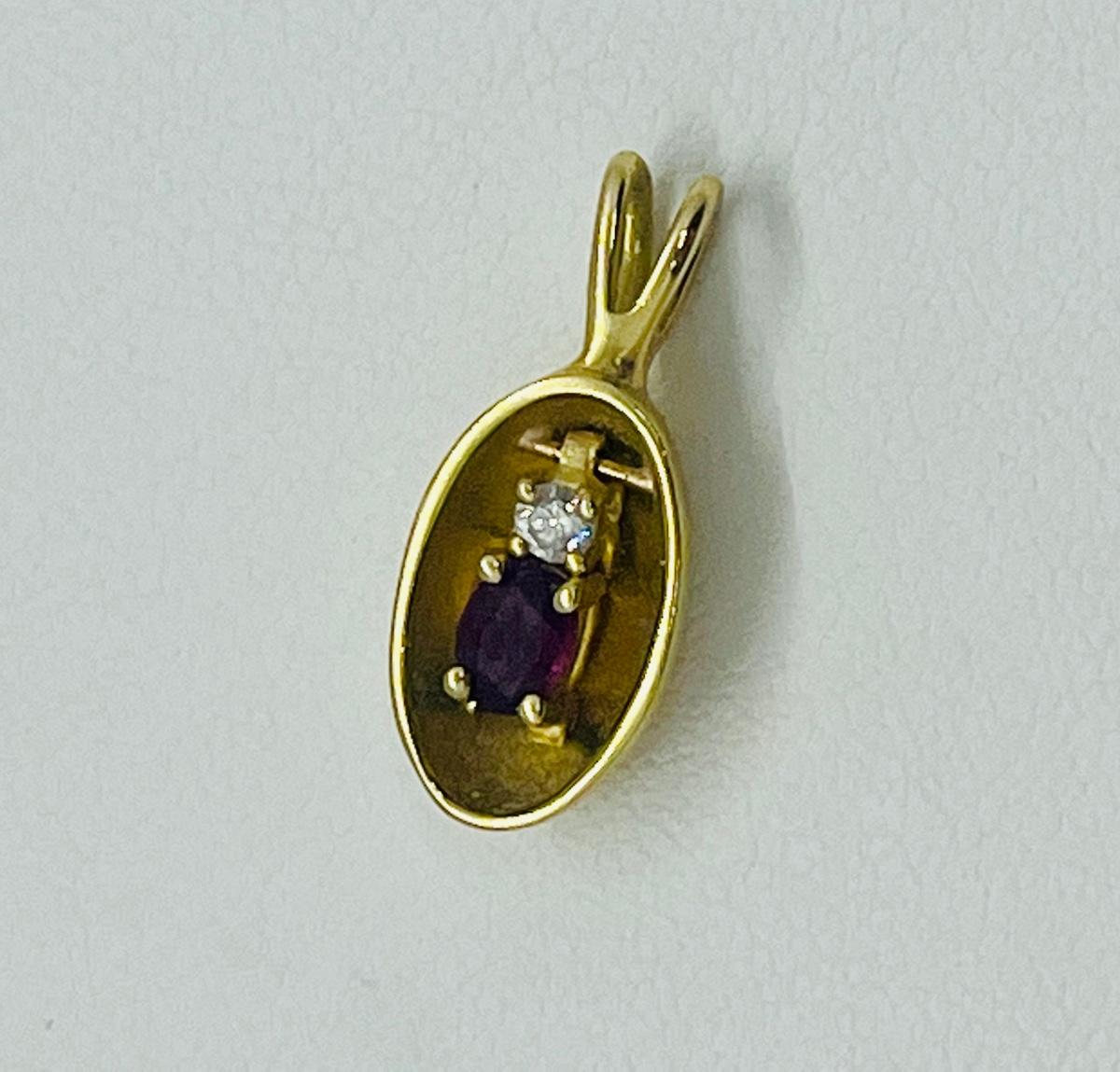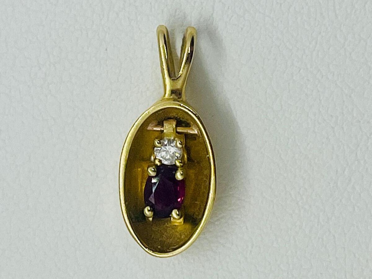 3.8g 14k yellow gold pendant. A diamond chip sits atop a natural ruby that hangs and dangles inside a gold oval cradle. The pictures show condition, measurements if taken, and what is included in the lot. Due to the large amount that we photograph and the time frame, we are not always able to take measurements. All items unless noted, are pre-owned and have been used, and are untested. Thank you