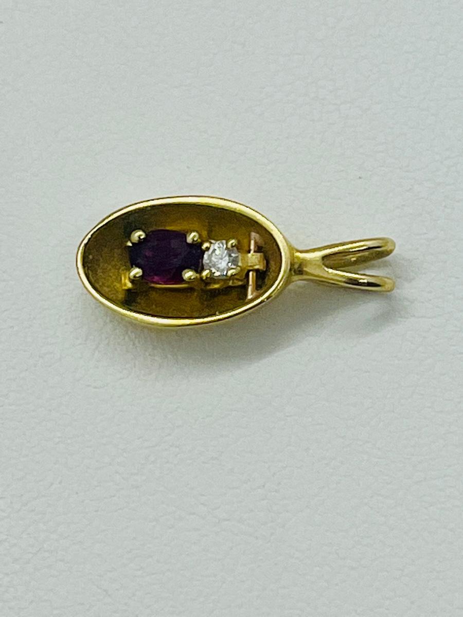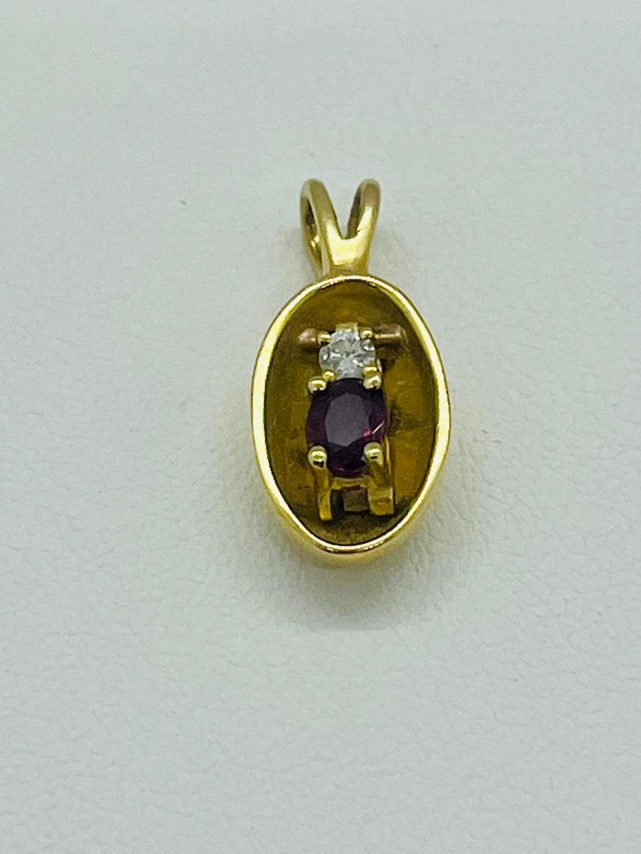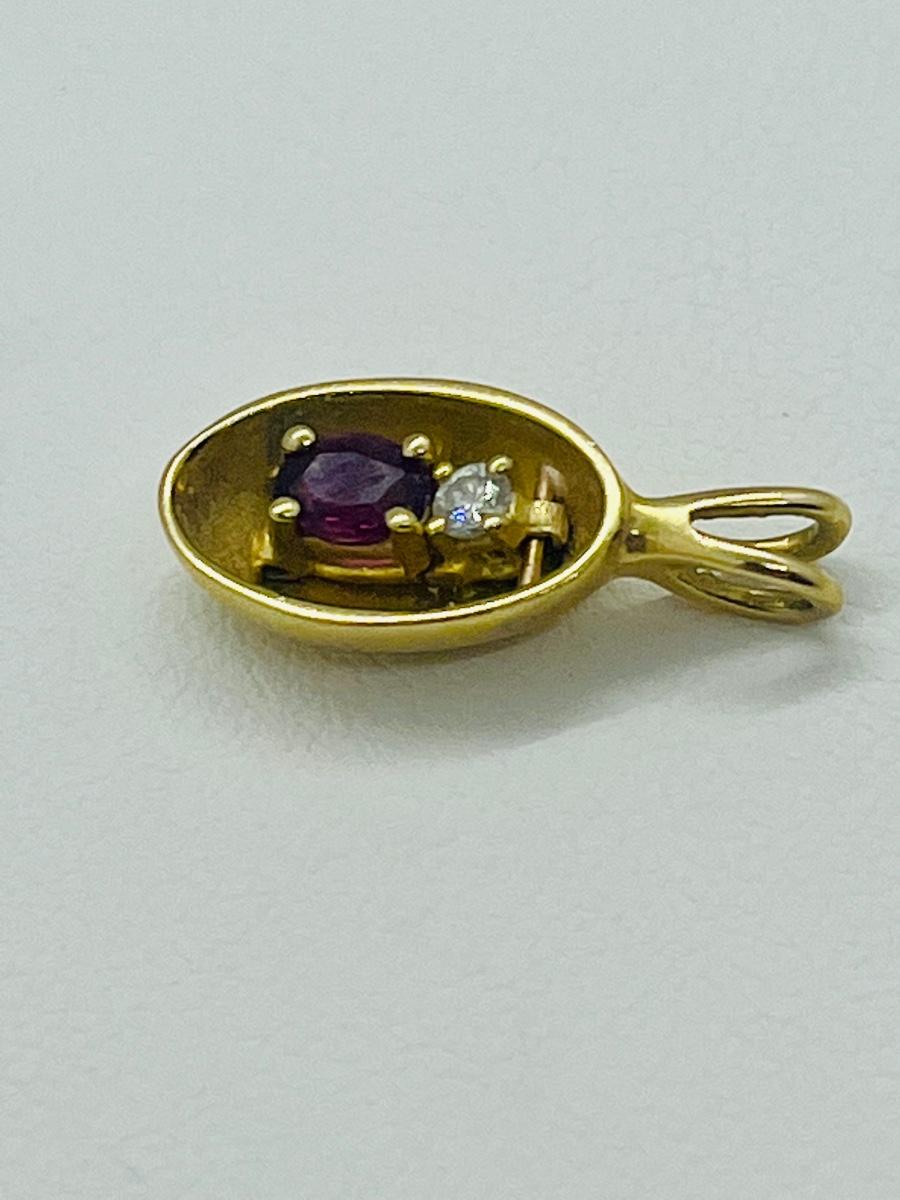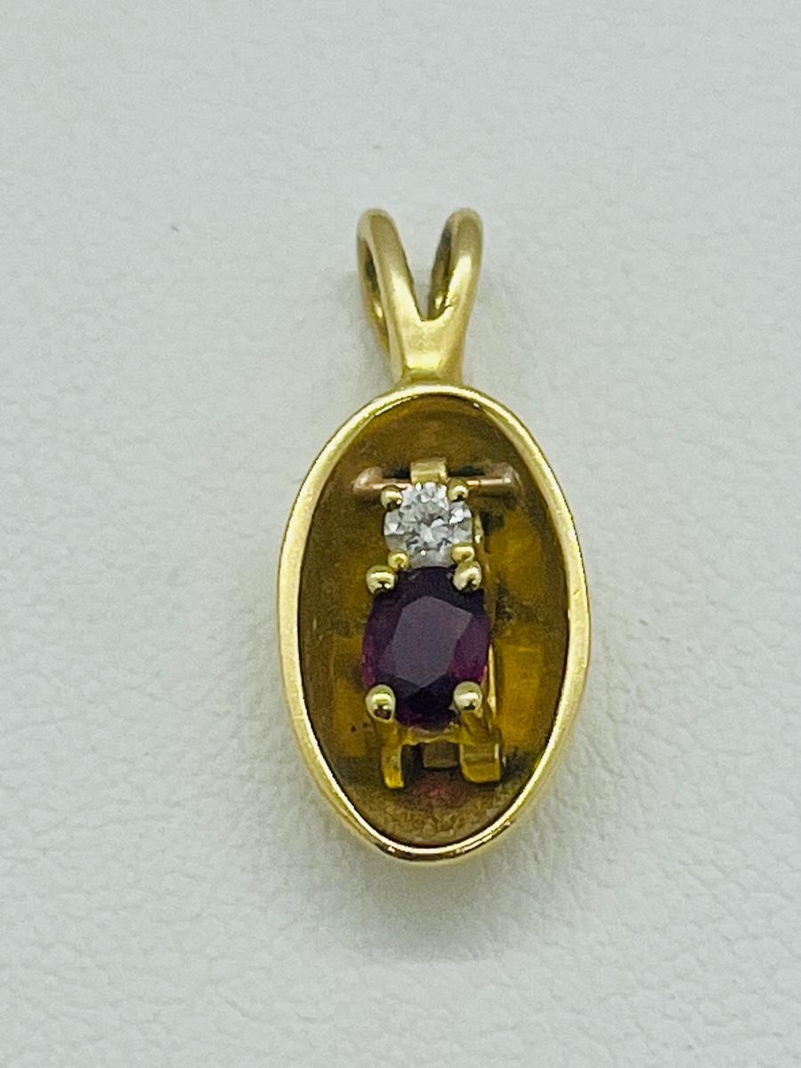 3.8g 14k yellow gold pendant. A diamond chip sits atop a natural ruby that hangs and dangles inside a gold oval cradle. The pictures show condition, measurements if taken, and what is included in the lot. Due to the large amount that we photograph and the time frame, we are not always able to take measurements. All items unless noted, are pre-owned and have been used, and are untested. Thank you