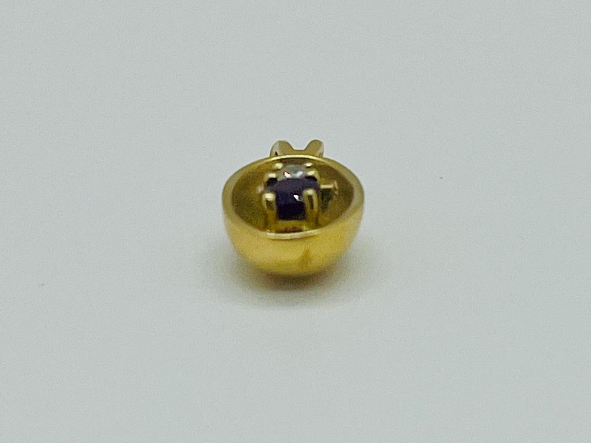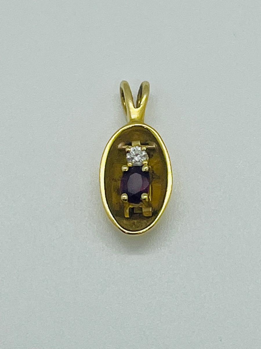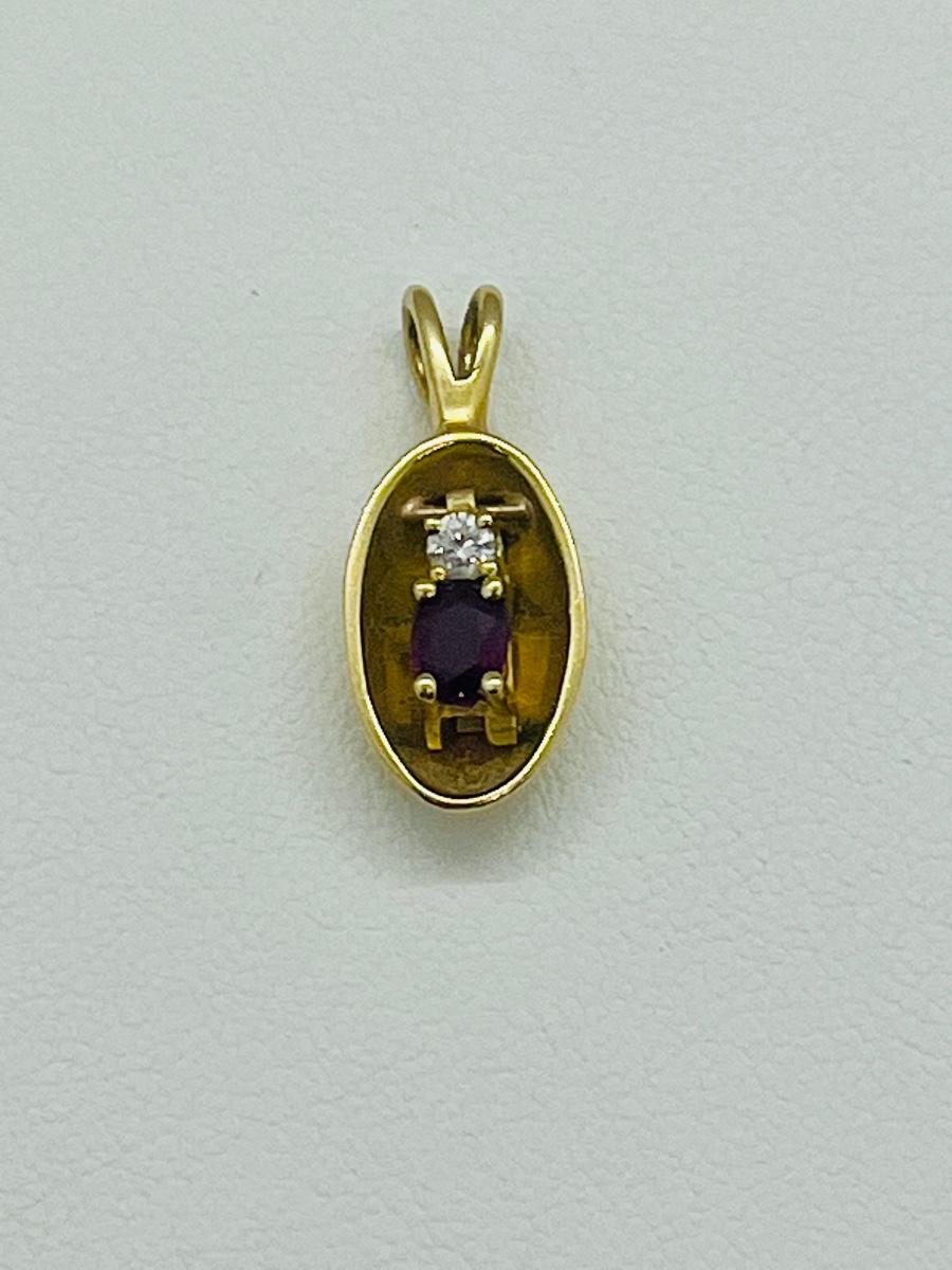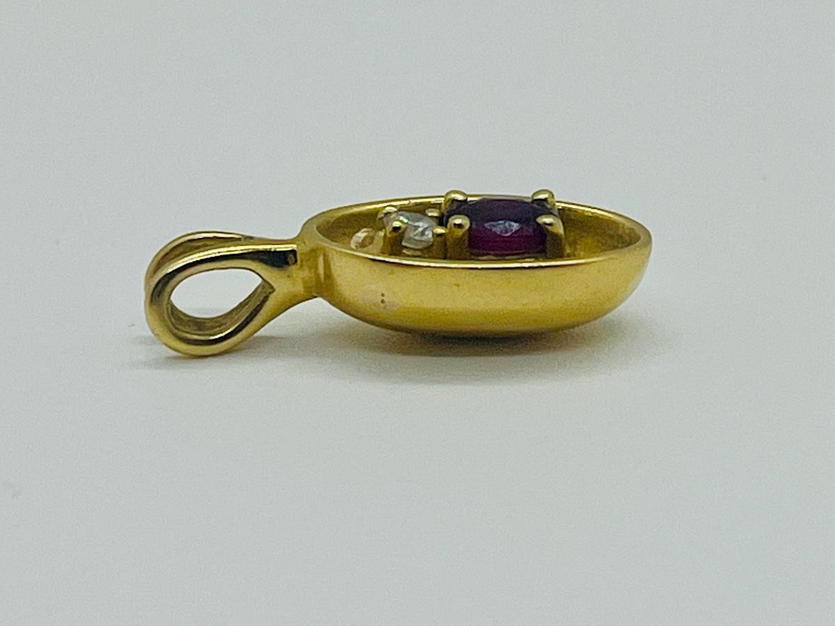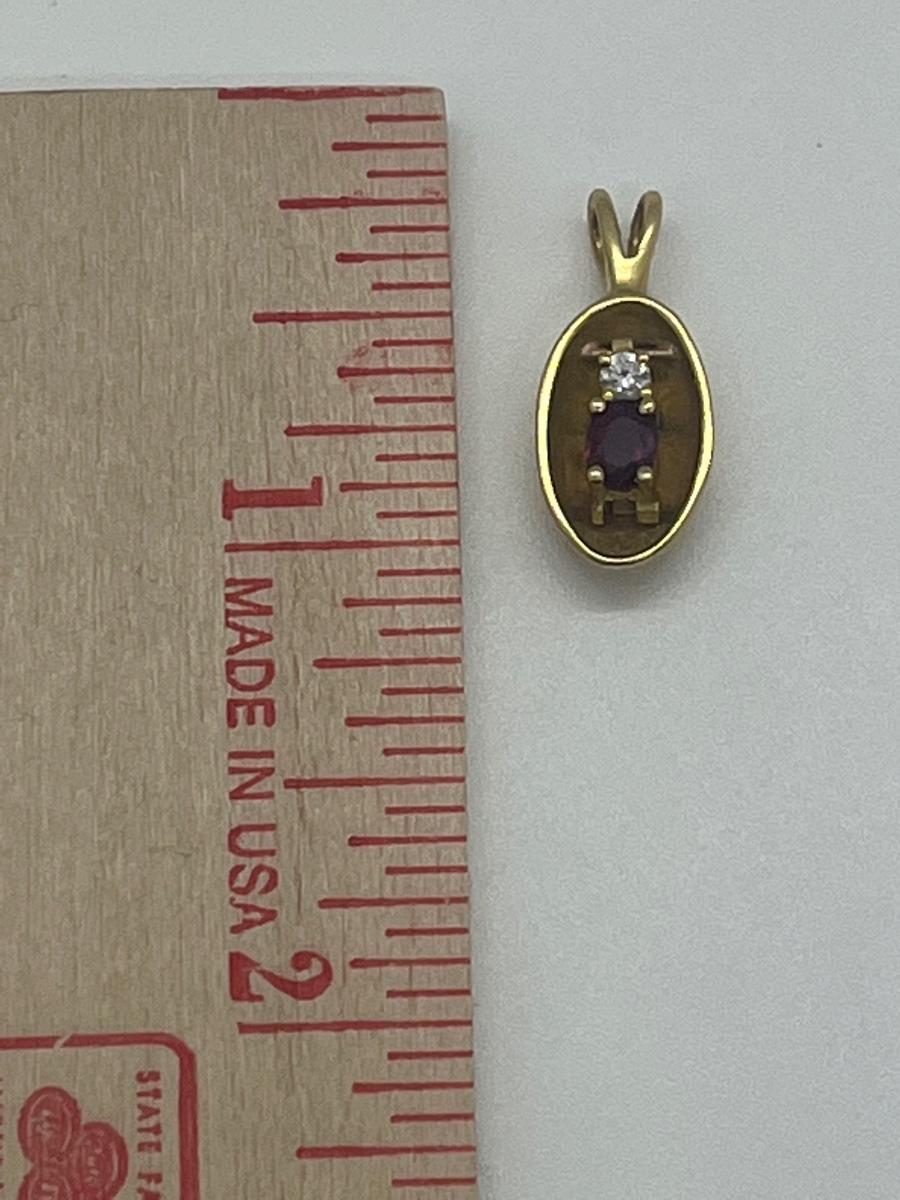 3.8g 14k yellow gold pendant. A diamond chip sits atop a natural ruby that hangs and dangles inside a gold oval cradle. The pictures show condition, measurements if taken, and what is included in the lot. Due to the large amount that we photograph and the time frame, we are not always able to take measurements. All items unless noted, are pre-owned and have been used, and are untested. Thank you