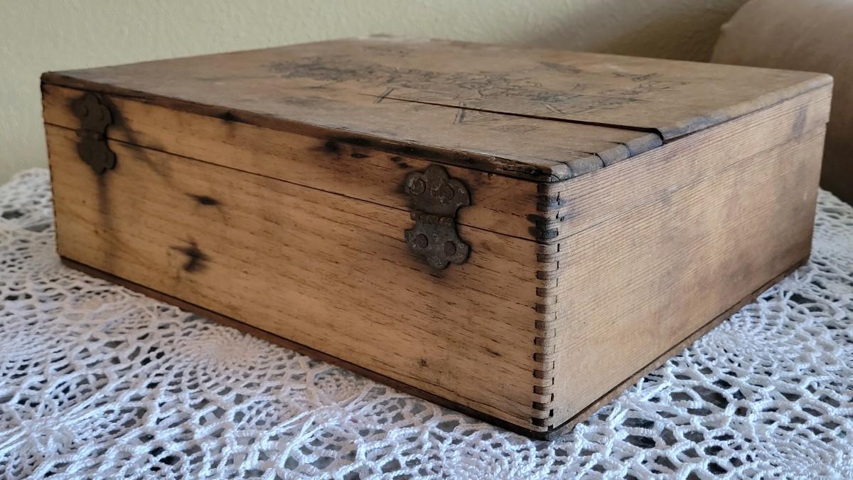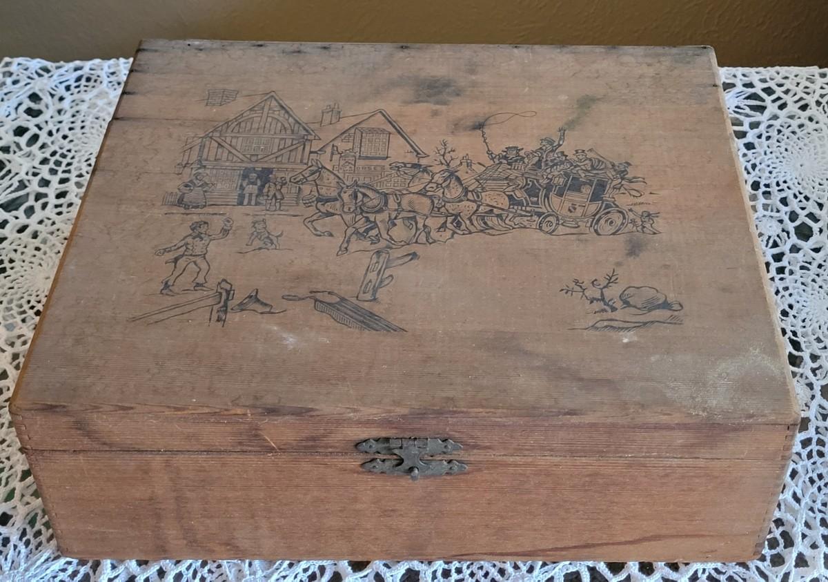 Lot 158: Antique Wood Box with Stagecoach Scene
