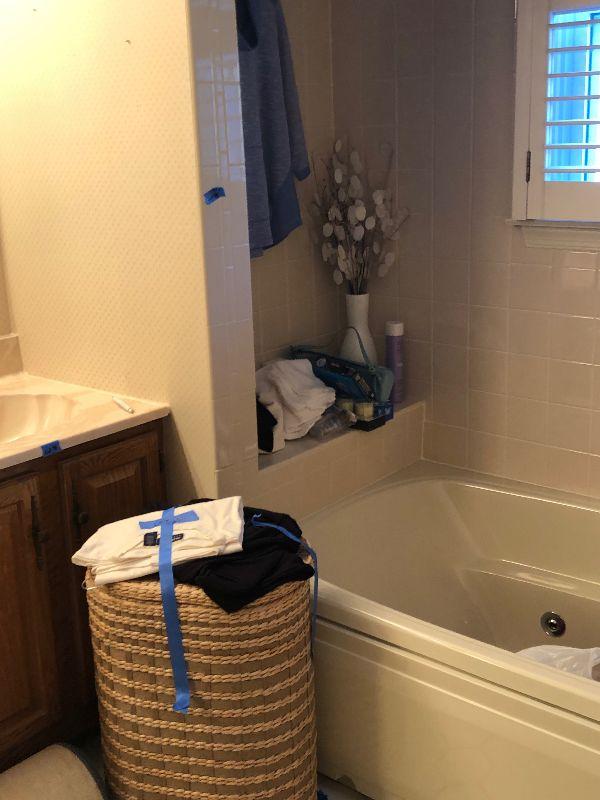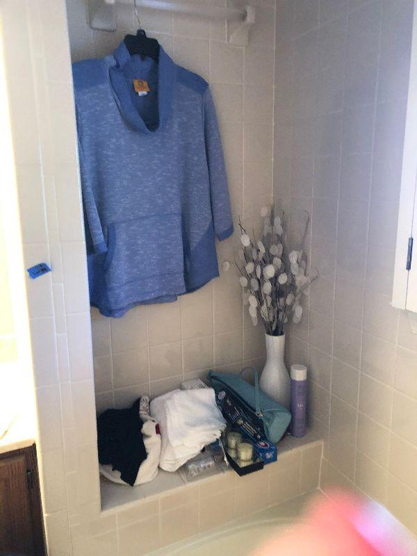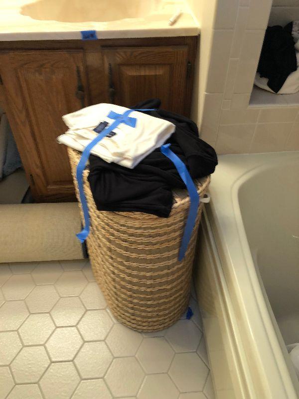 Bathroom Items including an Oval Hamper, Cleaning Items, Towels, Washcloths and More.