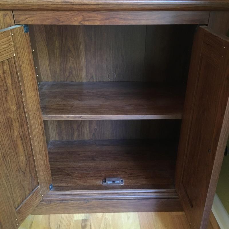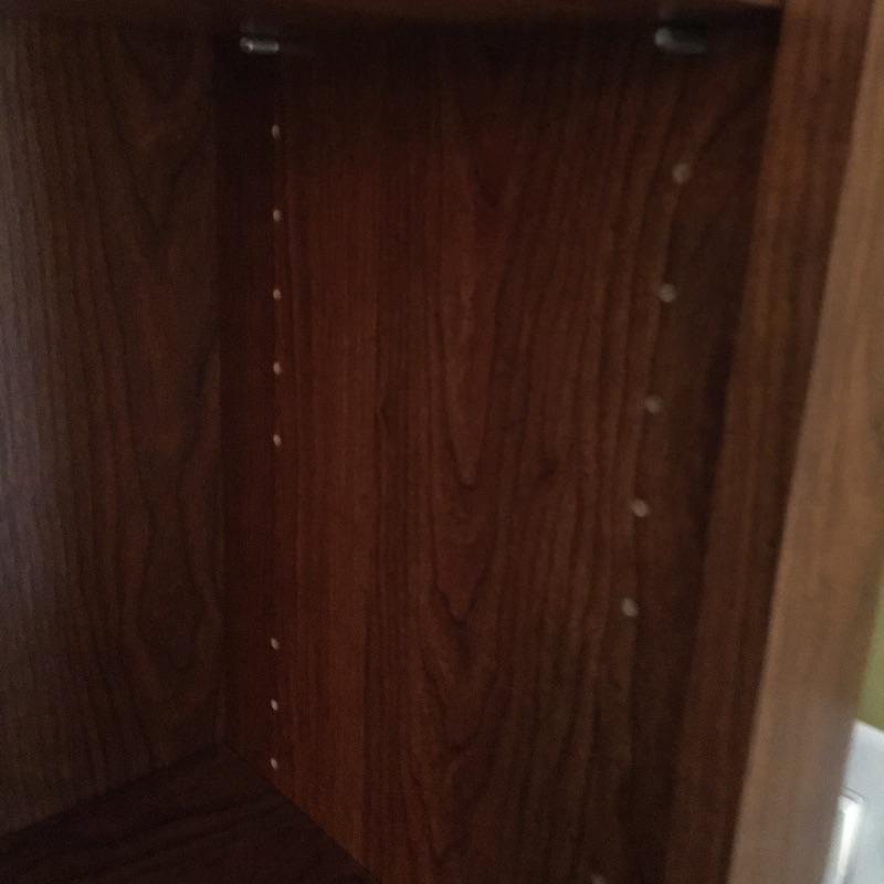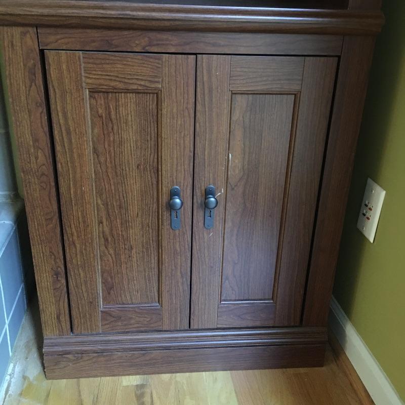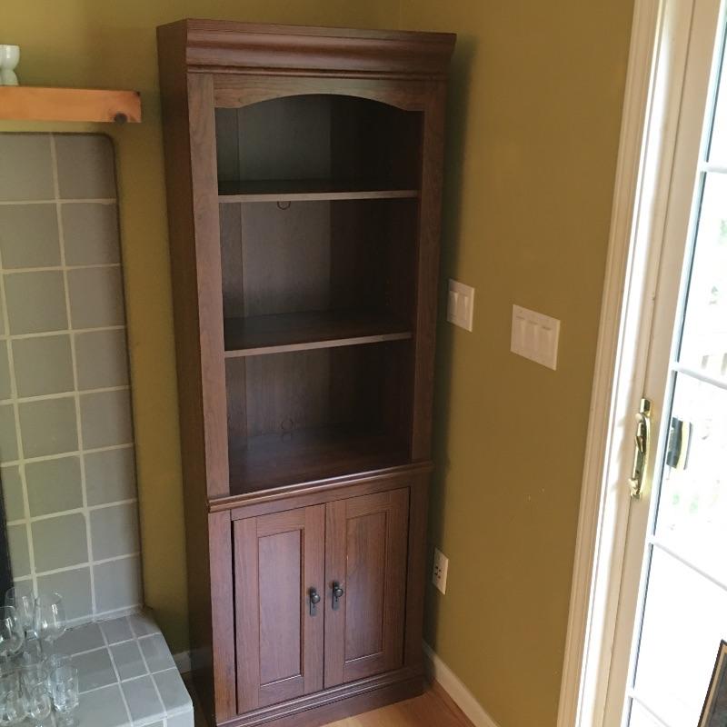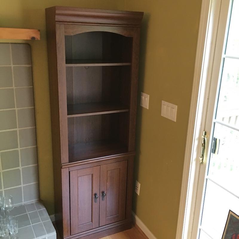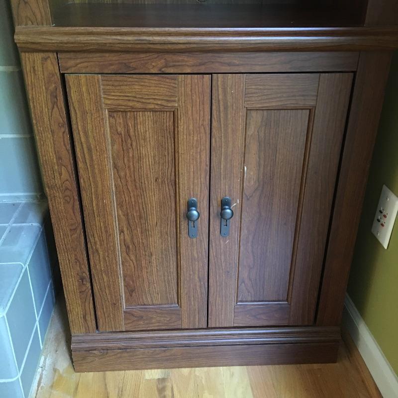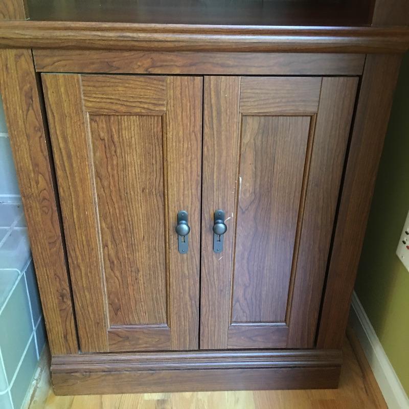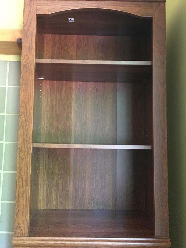Bookcase with adjustable shelves and a cabinet on the bottom with a adjustable shelf. This bookcase appears to be pressed wood but is quite deceiving! It measures 12” x 23.75” x 70.5”.